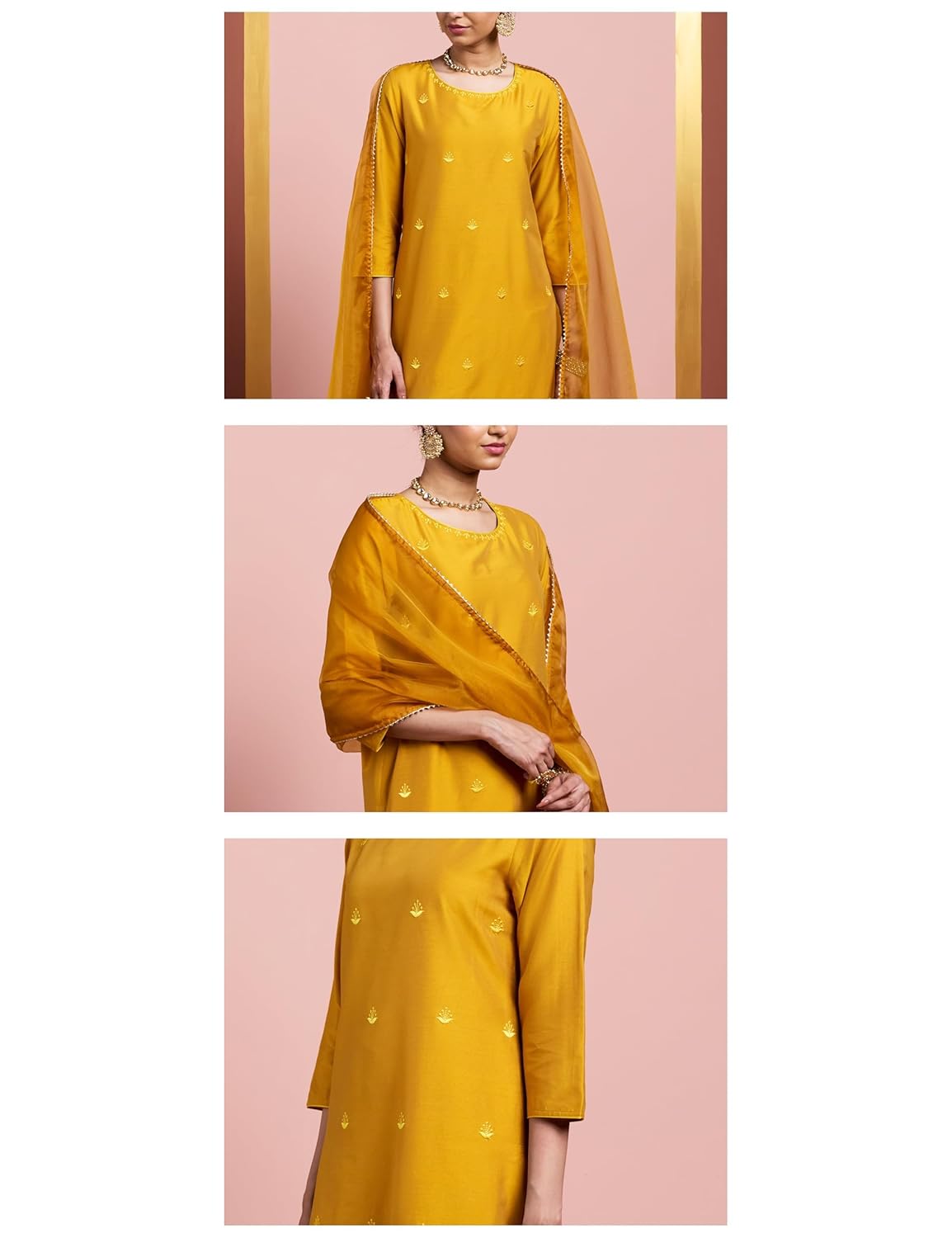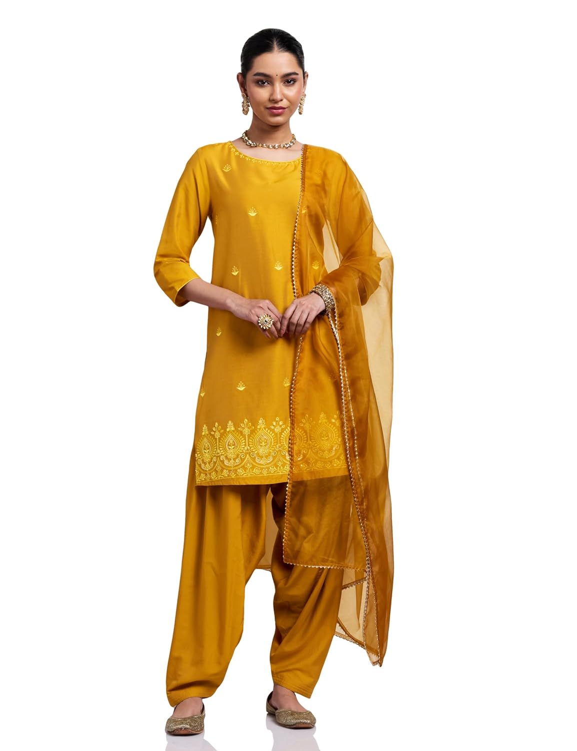 Amazon Brand – Myx Women’s Straight Embroidered Kurta Set with Organza Dupatta | Dhoti Pants (Available in Plus Sizes)