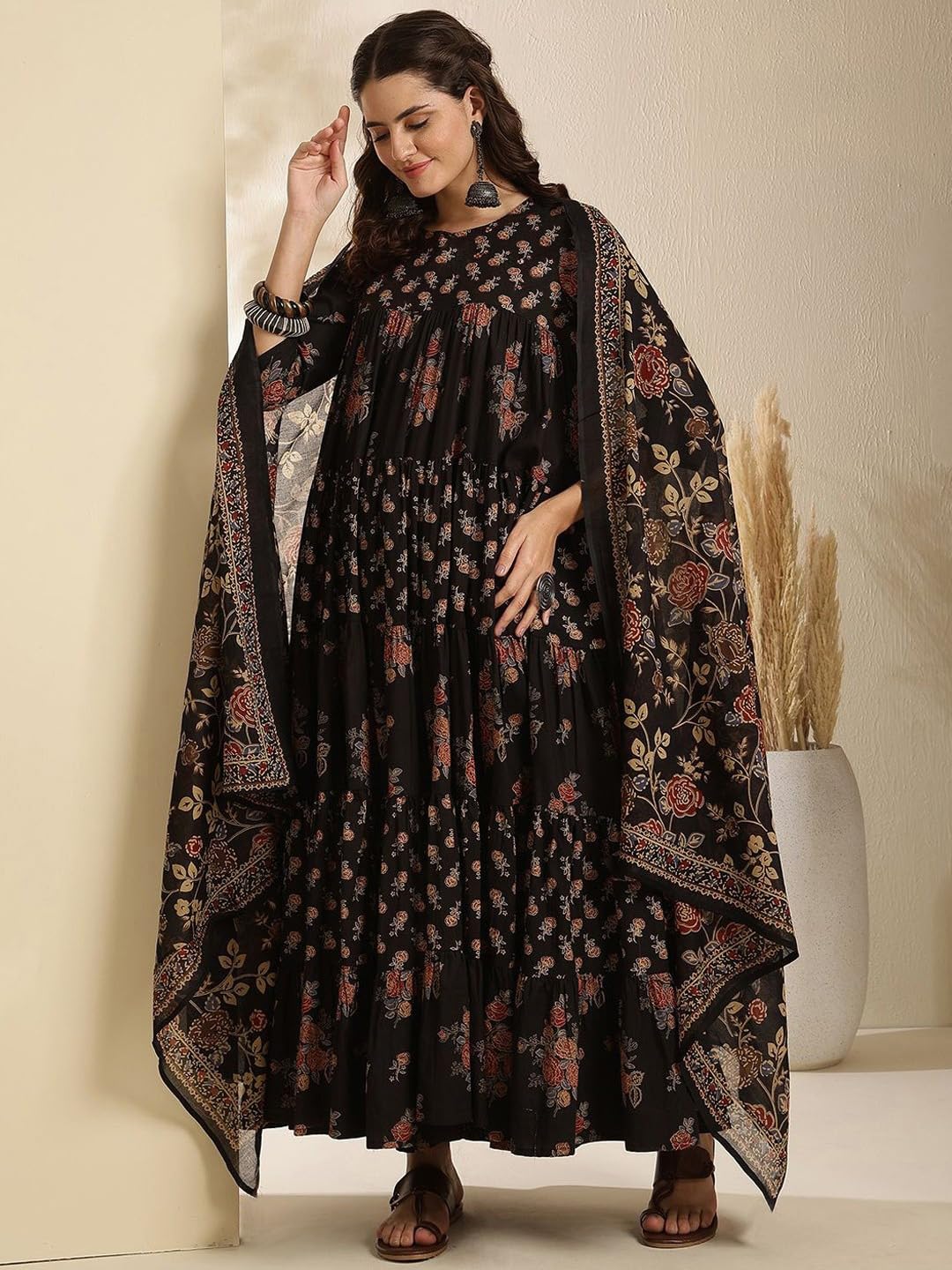 Elevate your ethnic wardrobe with the Anni Designer Women’s Pure Cotton Anarkali Kurta Set with Dupatta. Crafted from soft breathable cotton fabric, this block hand print floral printed kurta set blends traditional charm with modern elegance.The Anarkali flared hem style, keyhole neck, and three-quarter sleeves give it a graceful silhouette, making it suitable as a cotton kurta set for women for both daily and festive occasions. Designed as a 3-piece set with kurta, trousers, and dupatta, this Anarkali suit for women is a complete outfit that works beautifully for festive wear, party wear, and ethnic functions.Whether you are searching for a floral printed kurta with dupatta, a suit set for women cotton, or a stylish party wear kurta set, this piece by Anni Designer is the perfect addition to your ethnic collection.