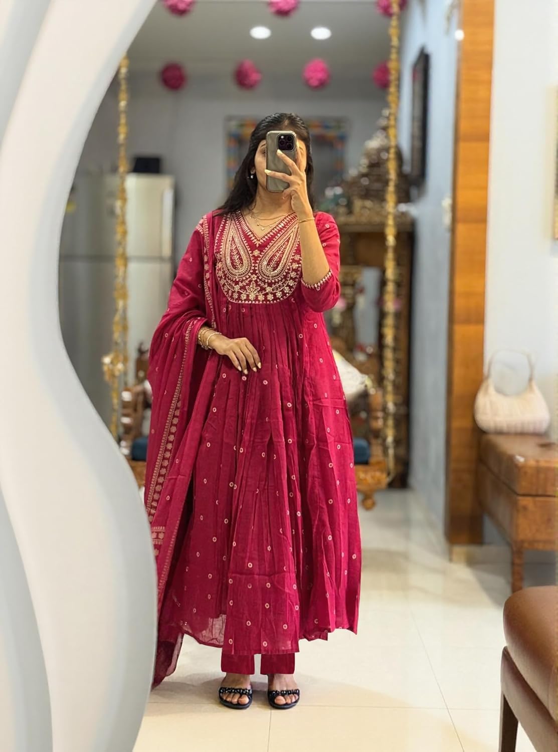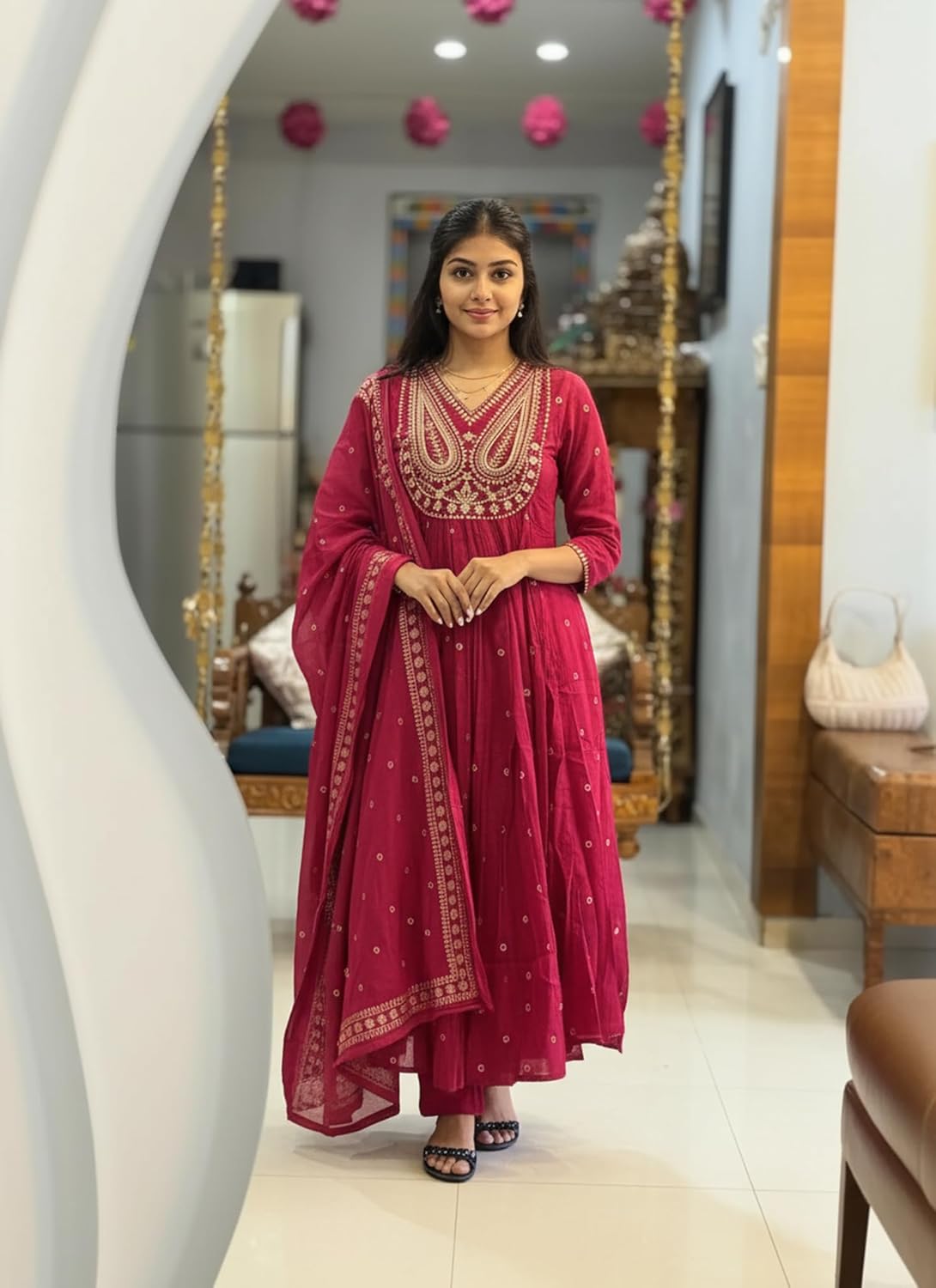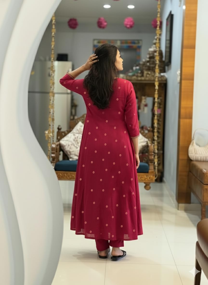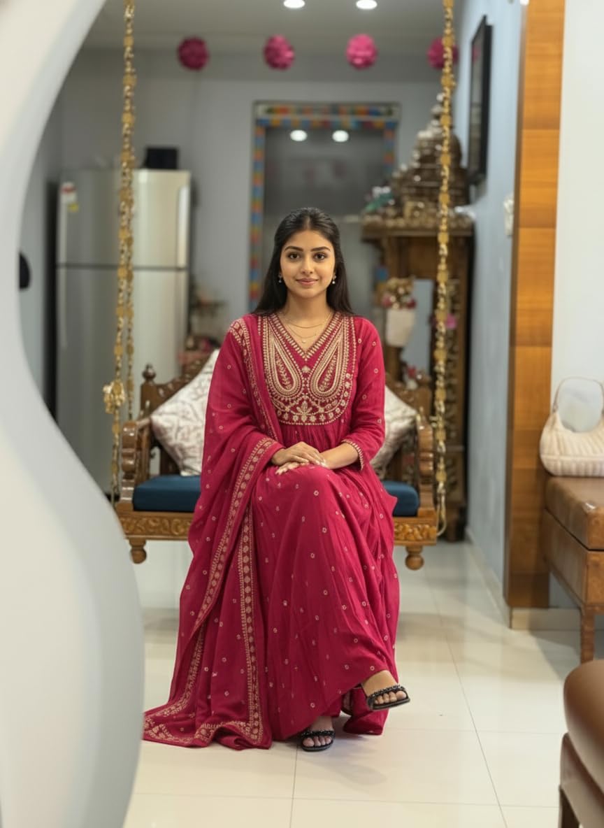Add elegance to your ethnic collection with this ANNI DESIGNER Women’s Rayon Viscose Printed Embroidered Anarkali Kurta with Pant & Dupatta. Made from soft and breathable rayon viscose fabric, this kurta set ensures comfort while maintaining a refined appearance. The beautifully printed Anarkali kurta features delicate embroidery that adds a touch of sophistication and traditional charm. The flaWINE silhouette creates an elegant flow, while the matching pant and dupatta complete the coordinated look. Designed for comfort and style, this three-piece set can be effortlessly styled with heels, juttis, or statement jewellery for festive occasions, office gatherings, or family events.