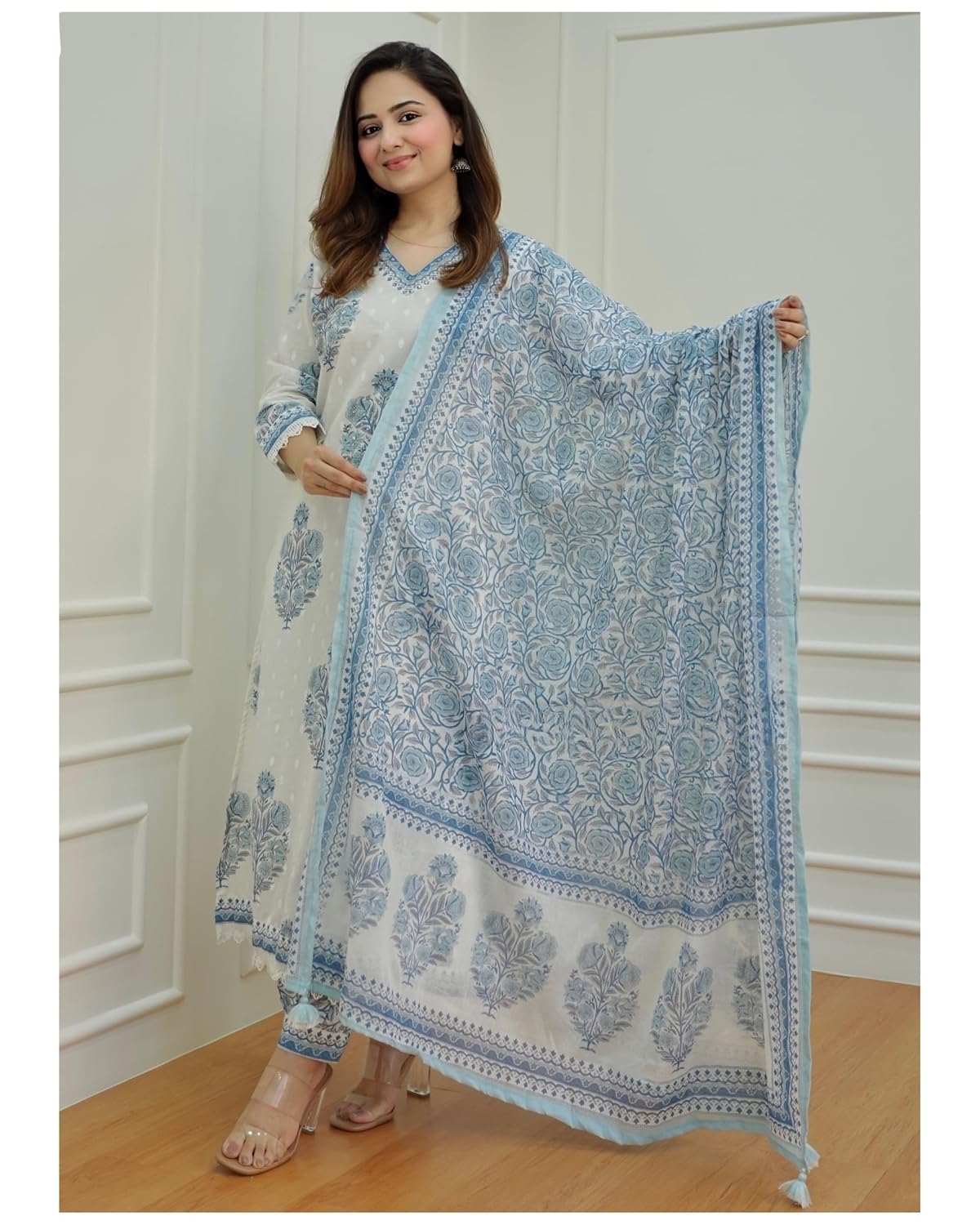 Embrace the grace of floral patterns with this intricately printed kurta set. The delicate floral motifs add a touch of natural beauty to your ensemble, exuding feminine charm. Crafted from premium quality cotton fabric, this outfit offers exceptional comfort, allowing you to move freely and confidently throughout the day. The breathable material is perfect for both warm and cooler weather.
