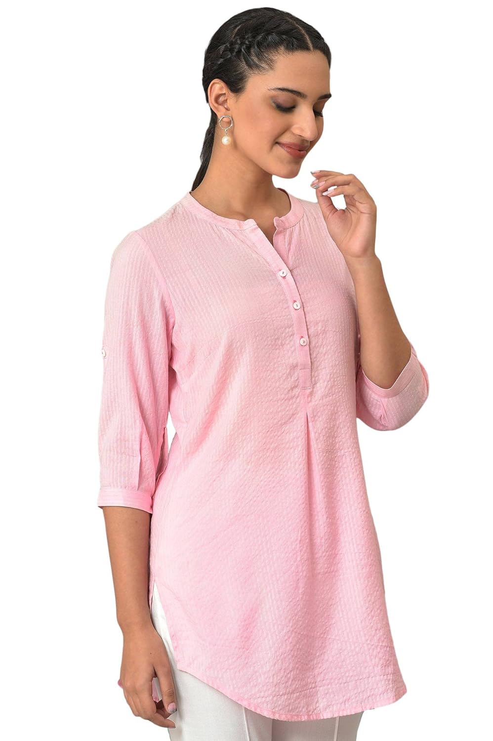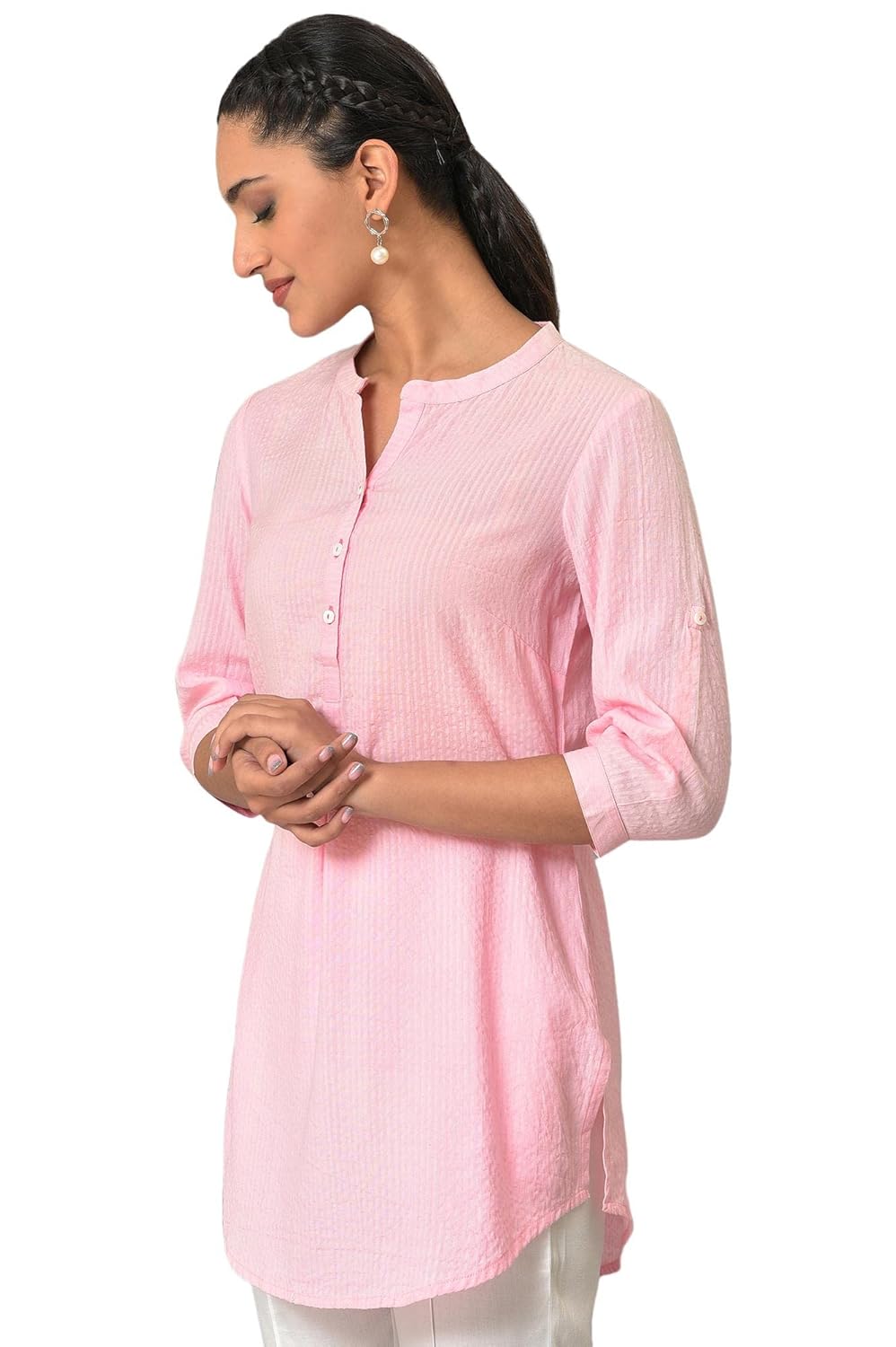 A Must Have Wardrobe Classic This Summer. Treat Yourself To This Amazing Basic Kurti Curated Just For You In Airy Seersucker Fabric. It Features A Mandarin Collar, Placket With Contrast Tonal Button Hole Detail, Shell Buttons And Sleeves With A Delicate Cuff. Available In Multiple Colors!!!