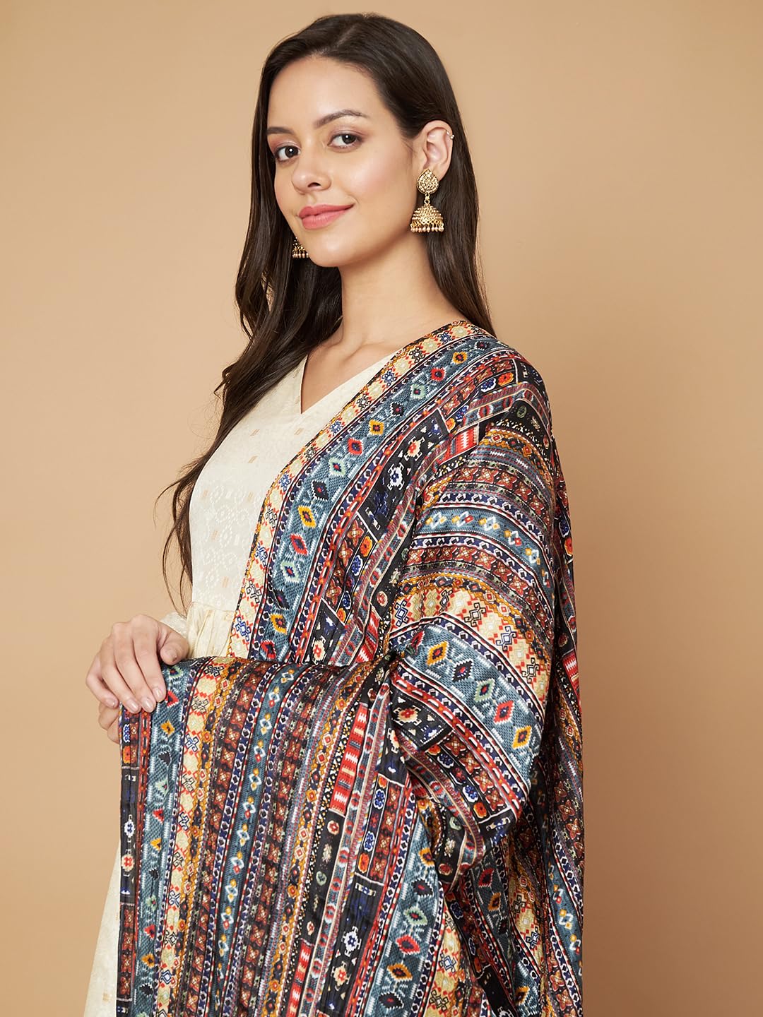 This dupatta features a carefully composed Patola-inspired print that reflects India’s rich textile heritage through detailed patterns and structured layouts. The design showcases repeating geometric and ethnic elements arranged to create balance and rhythm across the fabric. Each motif contributes to a layered visual story, making the dupatta stand out while still remaining elegant. The intricate print adds character to plain kurtas and enhances embellished outfits, offering a refined ethnic appeal that suits both traditional and modern wardrobes.