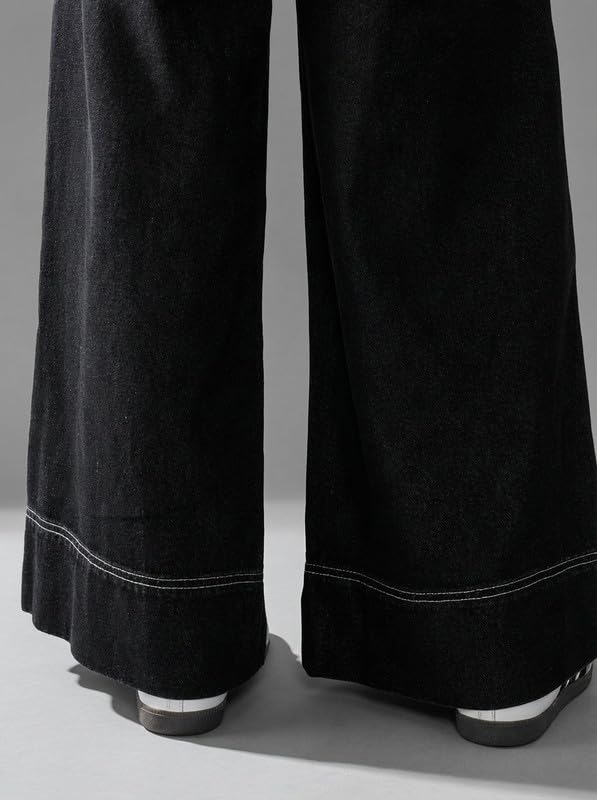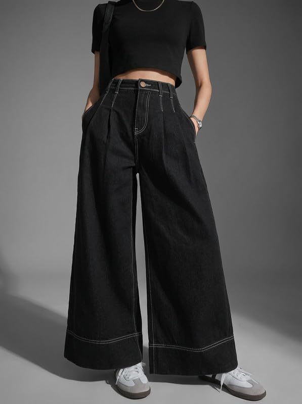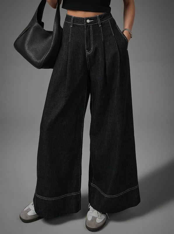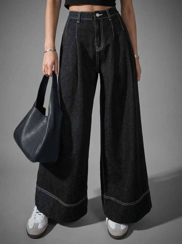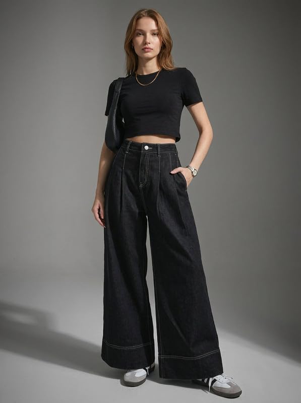 Elevate your everyday fashion with these stylish Korean Women Pleated Wide Leg Jeans, designed to blend elegance, comfort, and modern street style. Inspired by Korean fashion trends, these jeans feature a flattering high rise waist and a wide leg silhouette with front pleats that create a chic, elongated look suitable for daily wear, travel, shopping, college, or casual outings. Crafted from premium quality black denim fabric, these jeans are soft, breathable, and durable, making them perfect for all-day comfort in every season. The high waist design enhances your natural curves while offering a sleek and structured fit. A secure button closure ensures the jeans stay comfortably in place throughout the day. The pleated front detailing adds a sophisticated touch while allowing extra room for movement and comfort. Functional side pockets provide practical storage for your phone, wallet, or keys without compromising style. These Korean-style jeans can be effortlessly paired with crop tops, fitted t-shirts, blouses, hoodies, sneakers, or boots for a relaxed streetwear vibe. Dress them up with a blazer and heels for a smart-casual or office-inspired look. Perfect for women and girls who love trendy yet comfortable denim, these jeans are ideal for everyday wear, office casuals, travel, shopping, and casual outings. A must-have staple piece for a modern wardrobe.