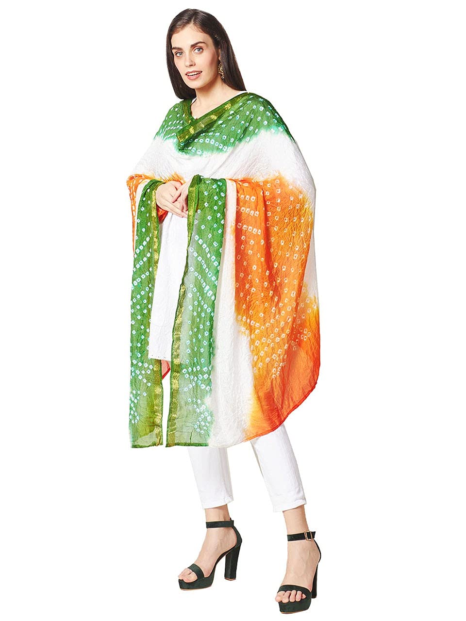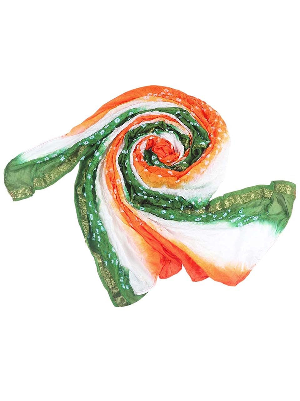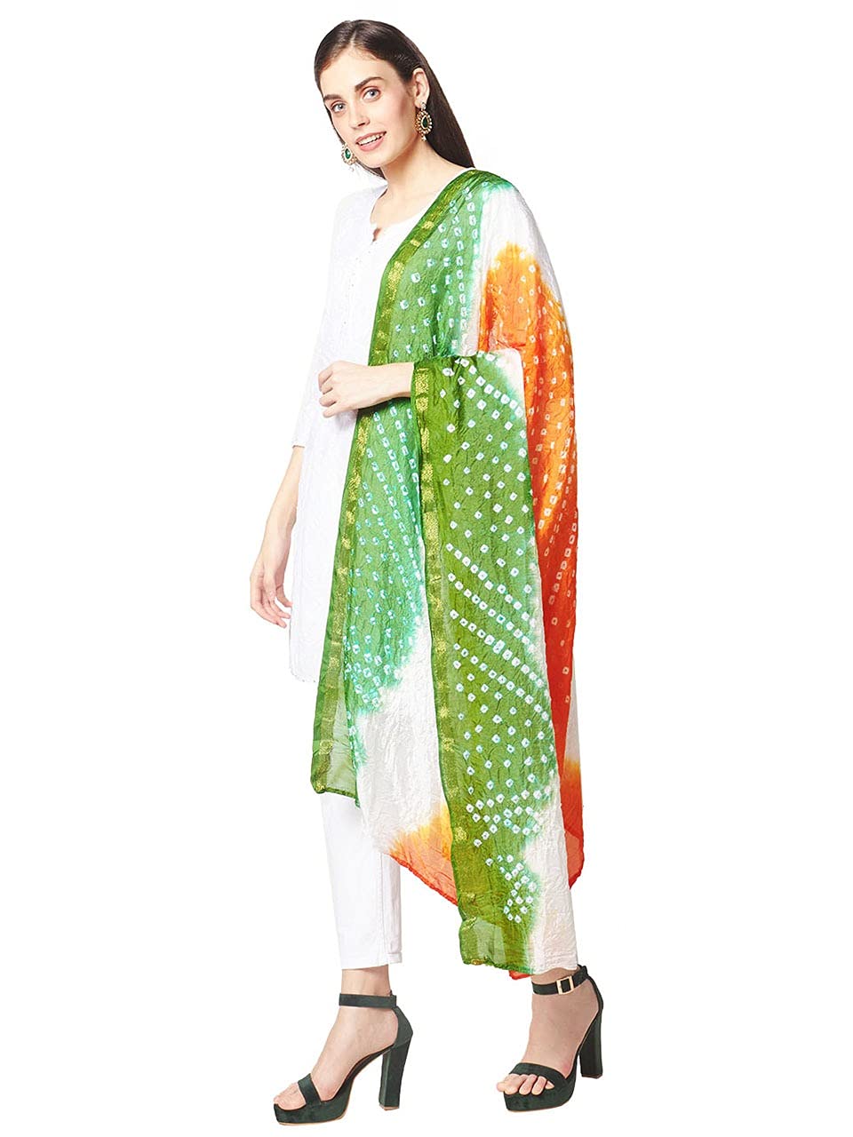 Our “Original” tri colour (Tiranga) Dupatta is perfect for Indian Independence day Fashion. Celebrate your Independence Day/Republic or any other patriotic day by clubbing this beautiful bandhini silk Dupatta with ethnic or western outfits. We specialize in women’s unique, one of a kind Dupattas.