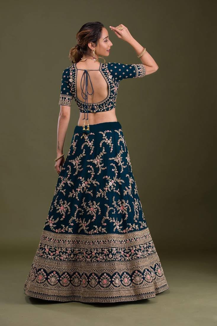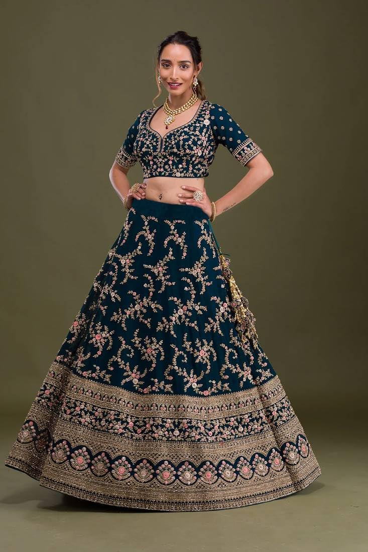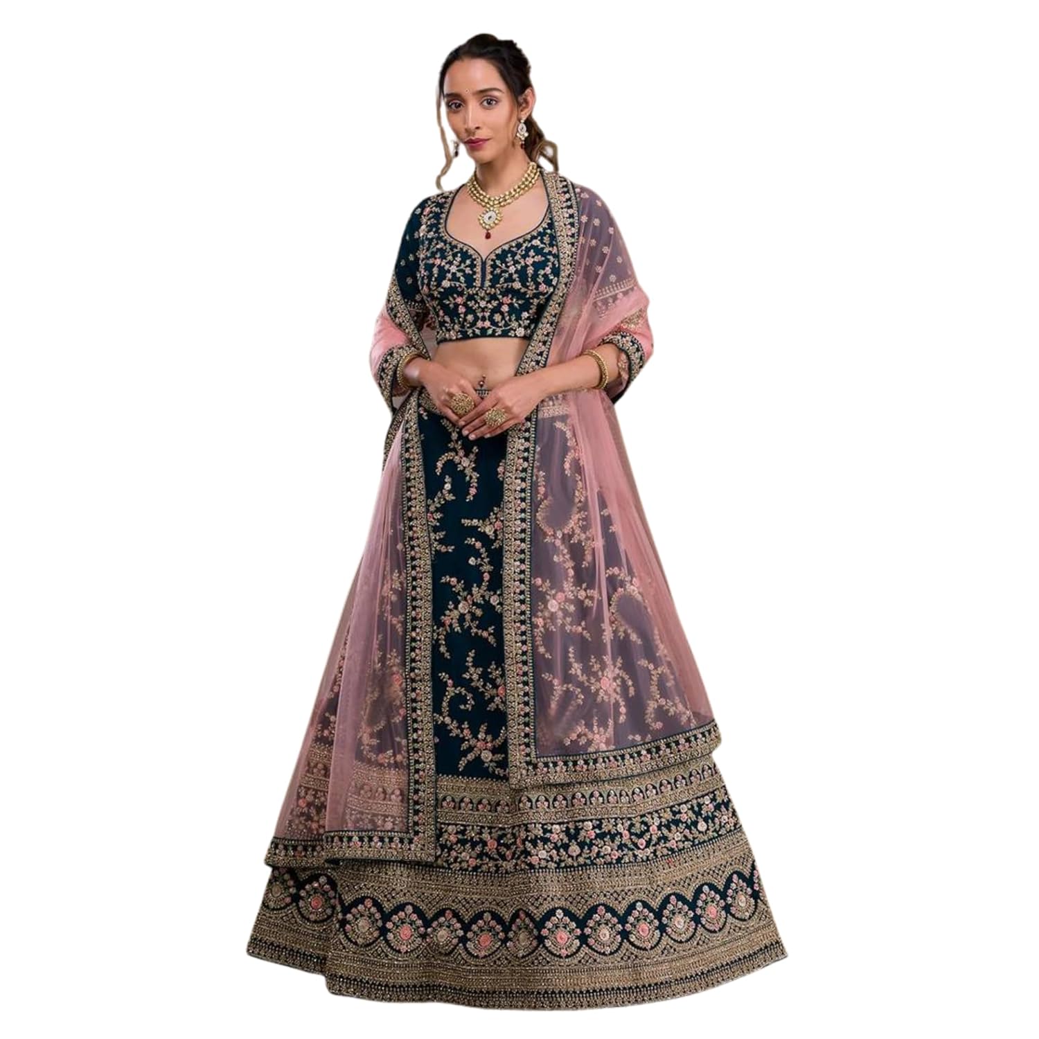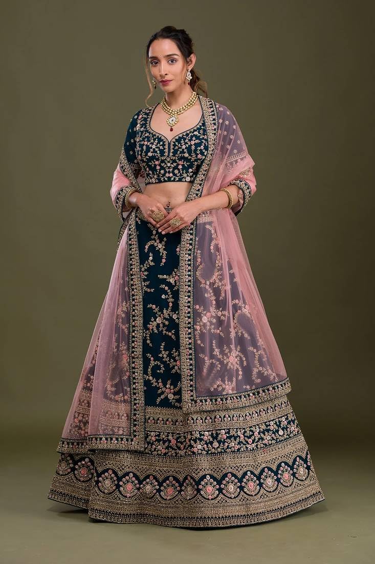 Indulge in timeless luxury and royal elegance with this exquisitely crafted Velvet Lehenga, designed for women who appreciate rich textures, classic beauty, and graceful ethnic fashion. Velvet has always been associated with grandeur and sophistication, and this lehenga embodies that heritage while blending modern sensibilities for today’s confident woman. Whether worn for weddings, festive celebrations, or grand evening events, this velvet lehenga promises to make a lasting impression. The lehenga is crafted from premium-quality velvet fabric, known for its soft touch, rich appearance, and regal charm. The plush texture of velvet adds depth and dimension to the outfit, giving it a luxurious finish that instantly elevates your look. The fabric reflects light beautifully, enhancing the richness of the color and creating a graceful, eye-catching effect with every movement. Despite its opulent look, the velvet is carefully selected to ensure comfort and ease of wear during extended occasions. Designed with a flattering flare and structured silhouette, the velvet lehenga drapes elegantly around the waist and flows smoothly to create a majestic presence. The fabric provides a perfect balance between structure and fluidity, allowing the lehenga to hold its shape while offering a graceful fall. The voluminous flare adds drama and elegance, making it ideal for bridal functions, receptions, and festive gatherings where statement attire is essential.