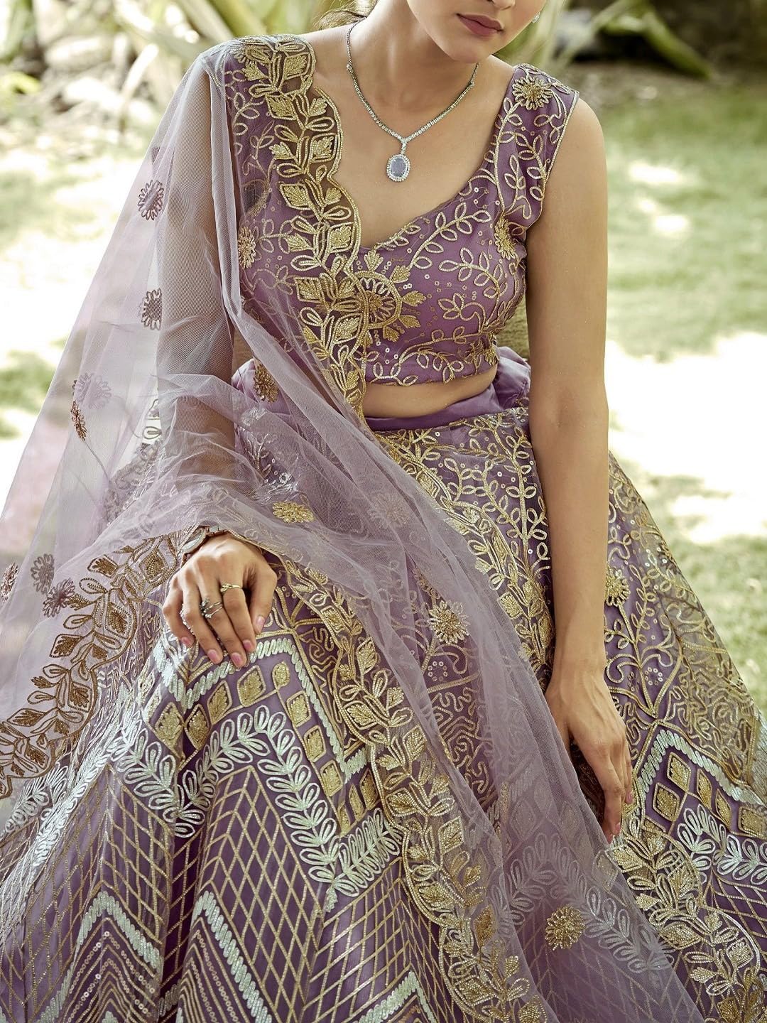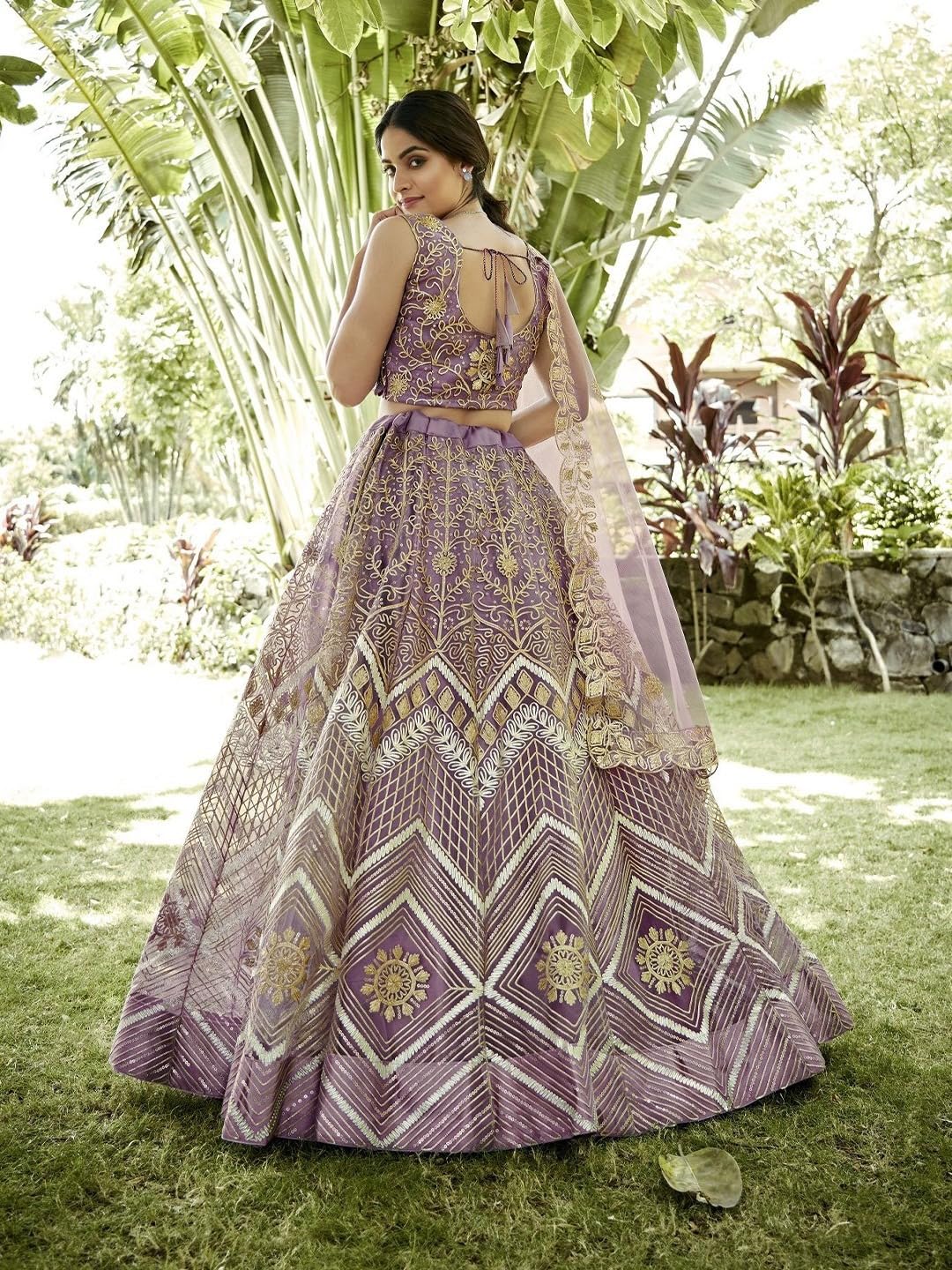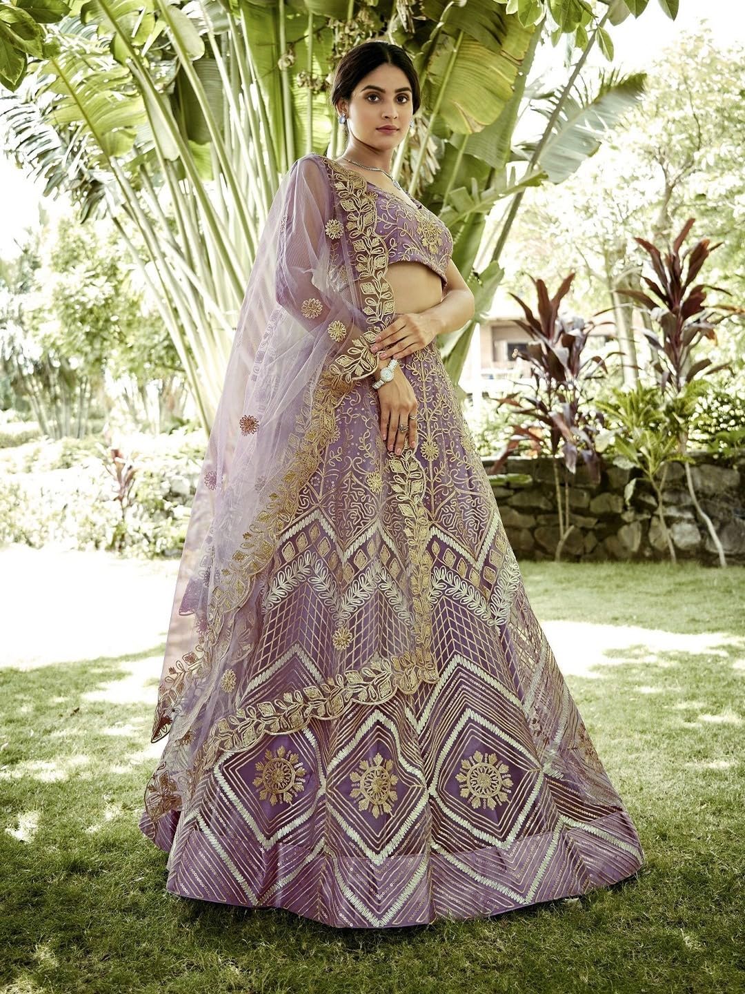 This striking lavender lehenga choli set radiates royal elegance with its intricate golden thread and zari embroidery. The sleeveless blouse features a sweetheart neckline adorned with ornate floral motifs, creating a flattering and sophisticated silhouette. The voluminous lehenga is a visual masterpiece, combining geometric patterns, chevron lines, and elaborate floral medallions in shimmering gold over the rich lavender base. The design seamlessly blends traditional craftsmanship with modern styling. The matching net dupatta is finished with an embroidered floral border and scattered butis, enhancing the regal appeal. Perfect for weddings, receptions, and grand festive occasions, this ensemble captures attention with its luxurious detailing and bold color palette.