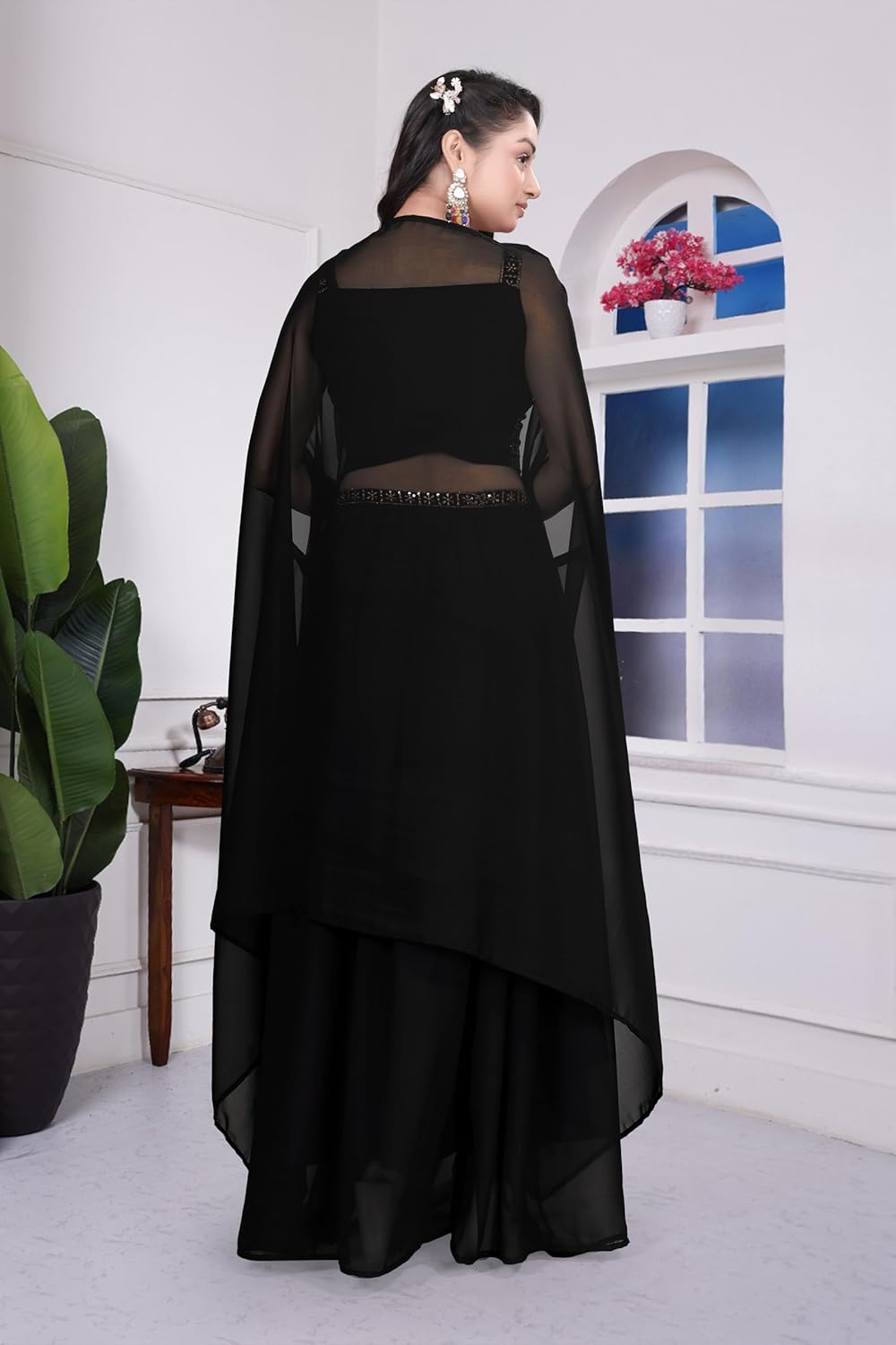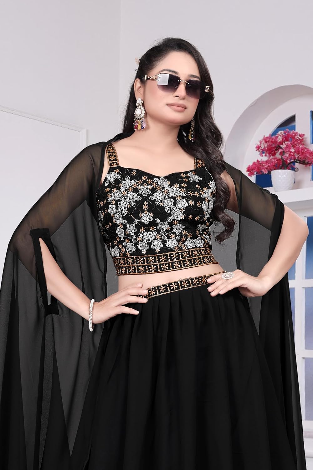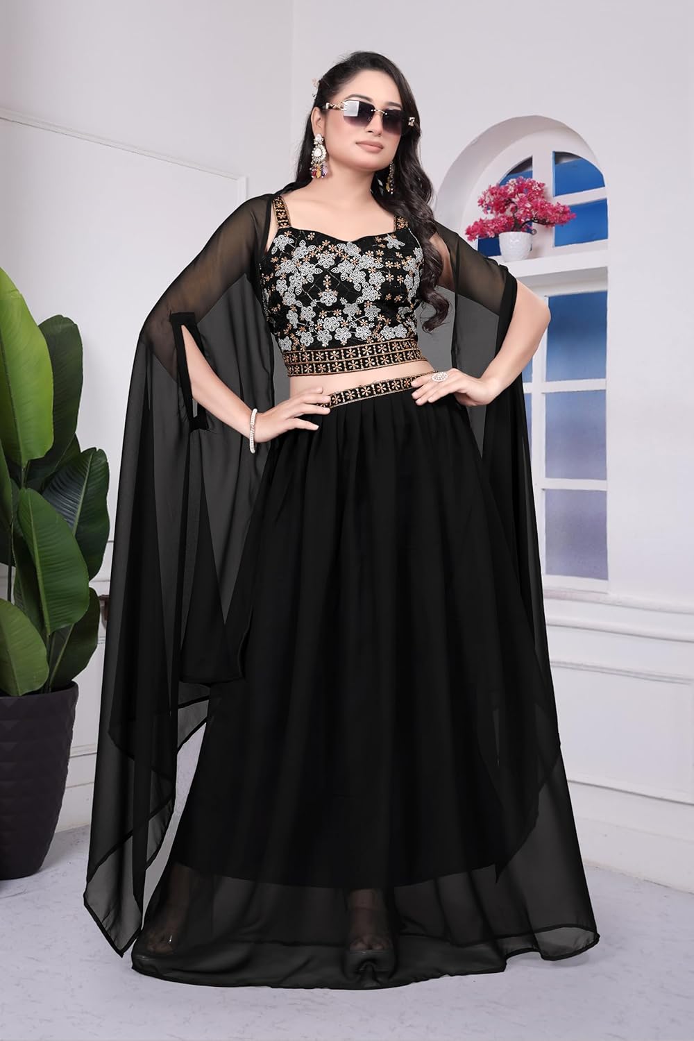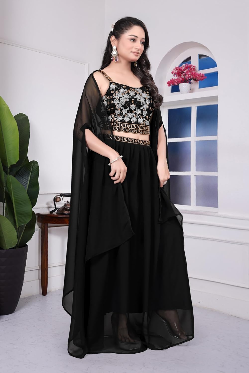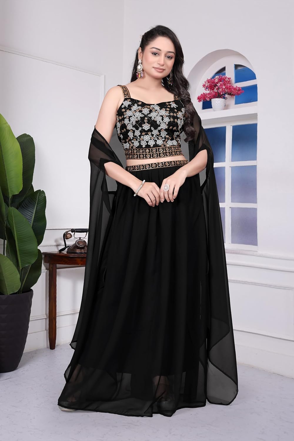 This stunning black embroidered lehenga choli set is the epitome of traditional Indian elegance and sophistication. The ensemble features an exquisitely crafted choli adorned with intricate embroidery work in gold and silver tones, creating a mesmerising floral pattern that catches the eye. The bodice showcases detailed embellishments along the neckline and waistband, adding a touch of opulence to the design. The flowing lehenga skirt drapes beautifully, offering both comfort and grace with its generous silhouette. Complementing the set is a delicate sheer dupatta with matching borders, perfect for draping elegantly over the shoulders. The sheer sleeves add a contemporary touch whilst maintaining the outfit’s traditional charm. This ethnic set is ideal for weddings, festive celebrations, and special occasions where you want to make a memorable impression. The timeless black colour provides versatility, allowing you to accessorise with statement jewellery and create your own unique style. Whether you’re attending a sangeet, reception, or cultural event, this lehenga choli set promises to make you stand out with its perfect blend of classic design and modern sensibility.