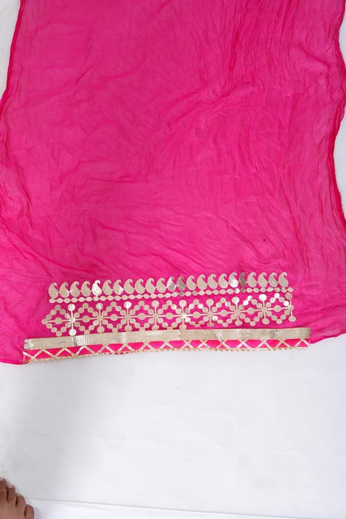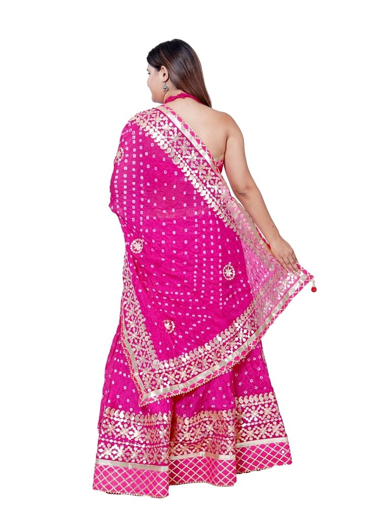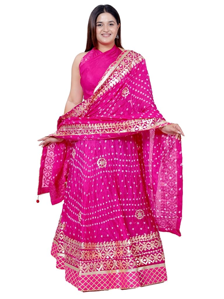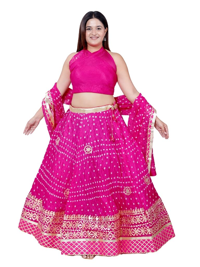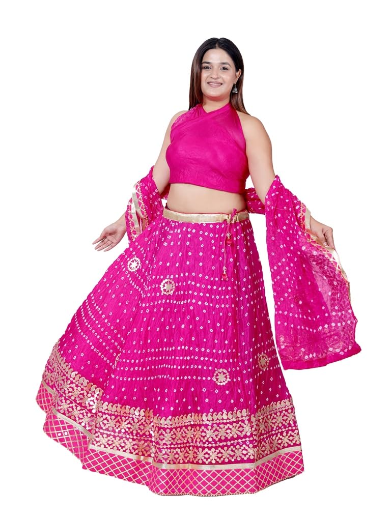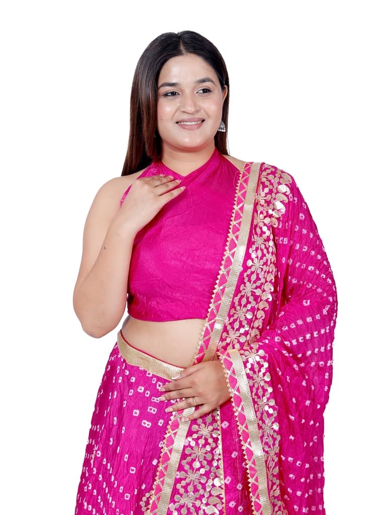 The Vibrant, Lovely and Beautiful “Bandhani Lehenga” are an Integral part of the upcoming wedding and festivals. Steal the spotlight with this absolute stunner is this bandhani Lehenga and Choli set with Dupatta in art silk with gota patti work all over the lehenga and heavy gota border. This Beautiful Art Silk Lehenga Is paired with A MULTI Color Silk Lehenga Choli and MULTI Color Silk Dupatta Embellished With Gota Patti.