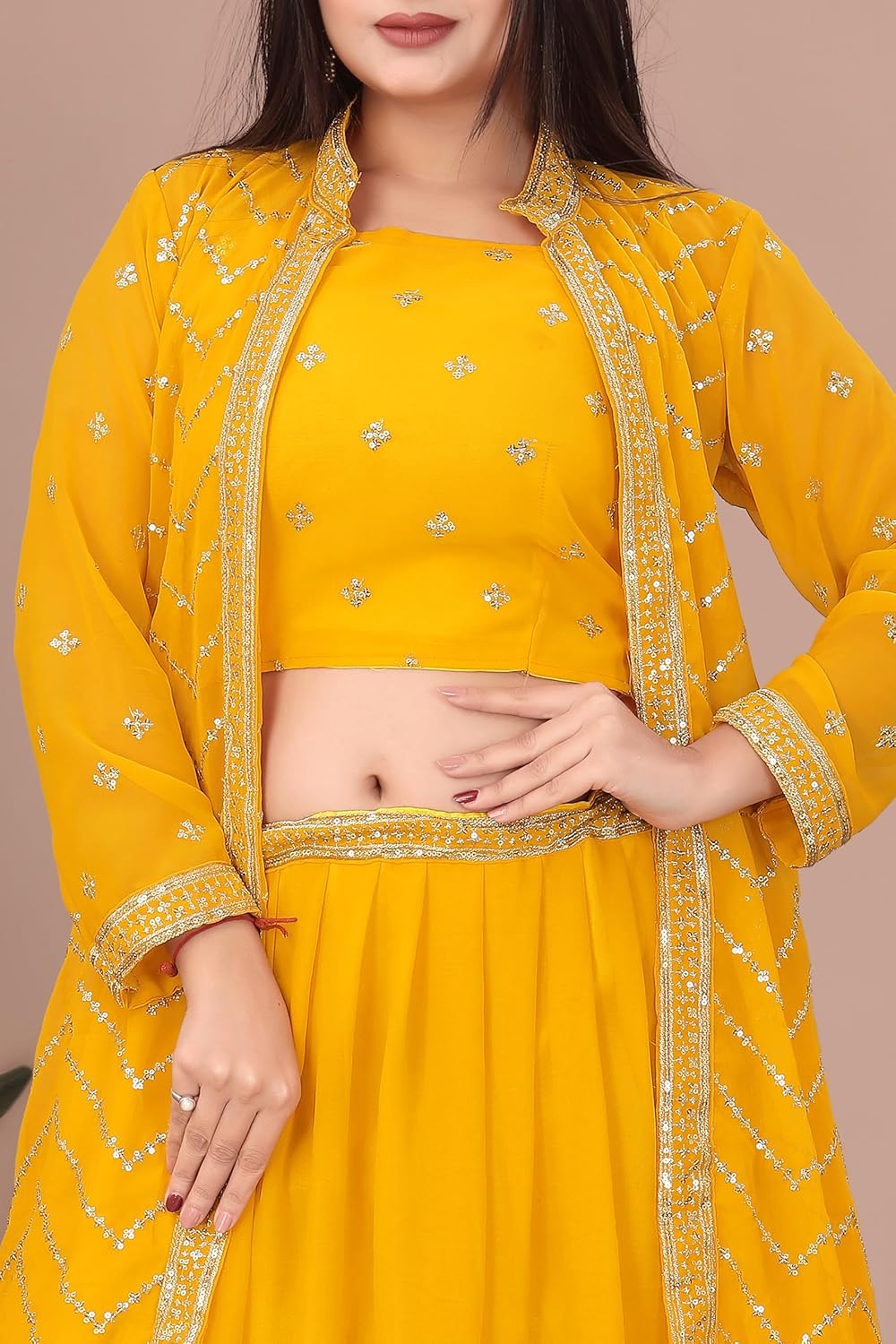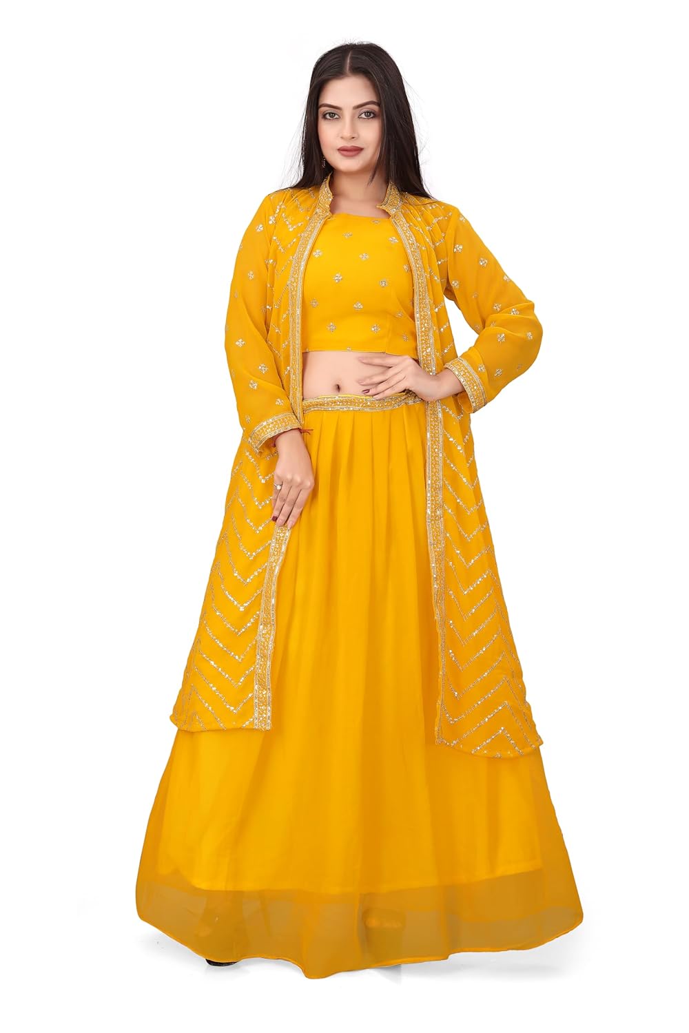 This stunning women’s lehenga choli set from Driftloom is designed to make you stand out at every special occasion. Crafted from luxurious georgette fabric, this three-piece ensemble features a beautifully embellished crop top, a flowing lehenga skirt, and an elegant full-sleeve jacket with intricate chevron pattern detailing. The rich teal blue colour exudes sophistication and grace, making it perfect for weddings, festivals, receptions, and celebratory events. The jacket showcases exquisite embellishment work along the borders and throughout, whilst the crop top is adorned with delicate motifs that add a touch of glamour. The lehenga skirt flows gracefully with its solid georgette construction, creating an ethereal silhouette. This modern style outfit combines traditional Indian aesthetics with contemporary design elements, offering versatility for various occasions from Diwali celebrations to sangeet ceremonies. The pull-on closure ensures easy wearing, whilst the free size design provides comfortable fit. Weighing just 170 grams and carefully packaged in compact dimensions, this ethnic ensemble is both practical and elegant. To maintain the beauty and longevity of this special garment, we recommend hand washing only. Make this festive season unforgettable with this designer lehenga set that perfectly balances tradition and modern fashion sensibilities.