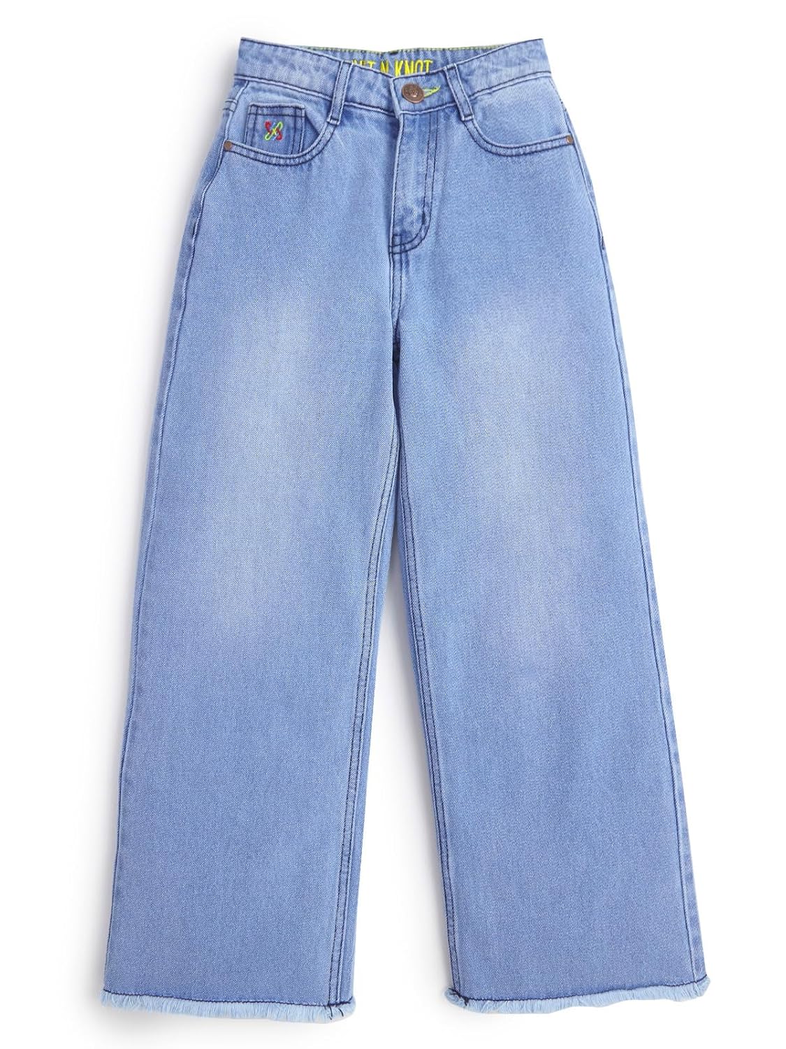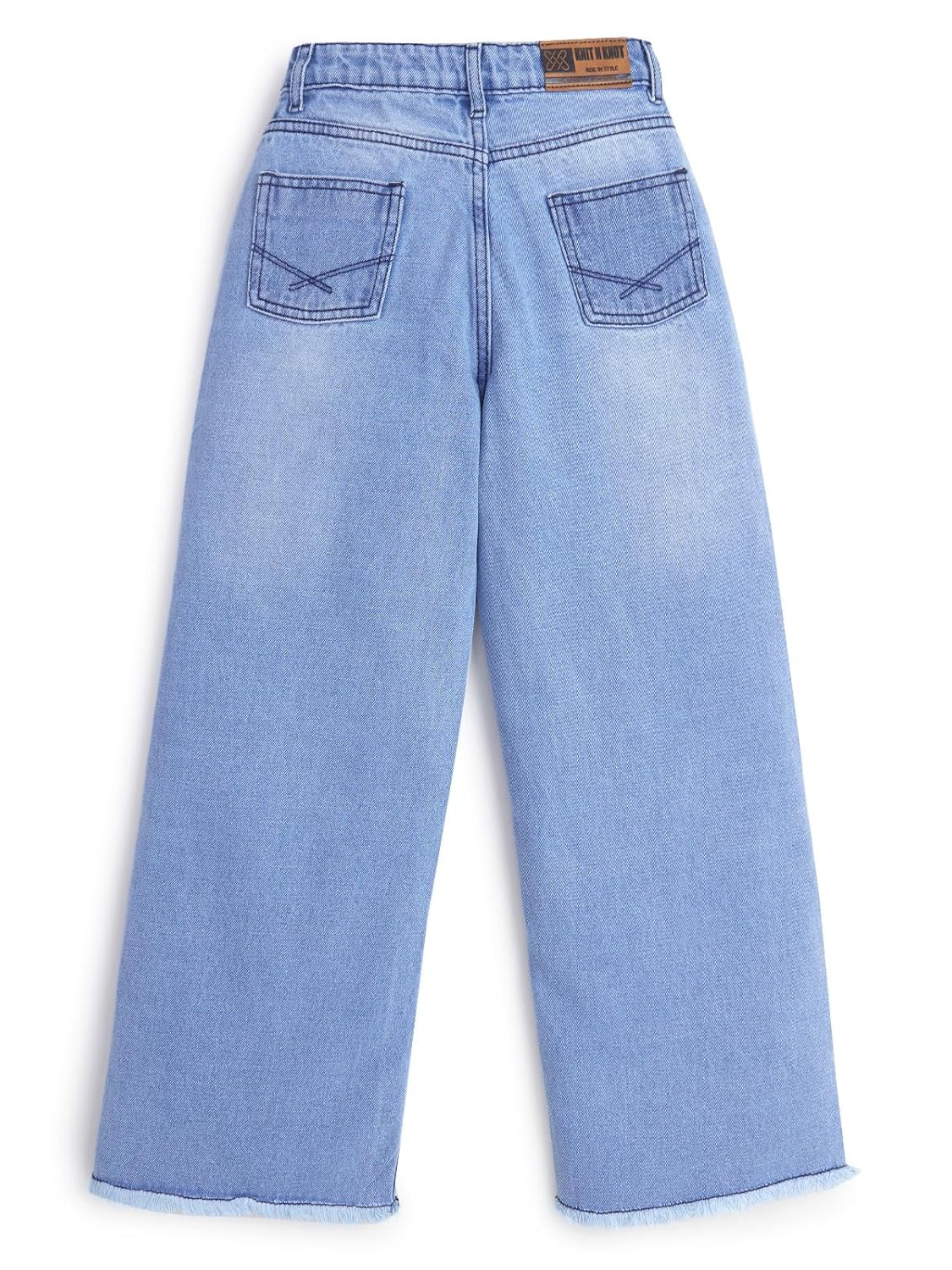 These stylish wide-flare fit jeans are a must-have for every girl’s wardrobe, combining fashion, comfort, and durability in one trendy package. Made from premium non-stretch denim, these jeans feature a structured silhouette that maintains its shape and provides a classic look. The light blue wash enhances versatility, making it easy to pair with a variety of tops and accessories for casual or semi-formal occasions. Designed with trendy distressed detailing, these jeans feature ripped accents and frayed hems for a contemporary, laid-back vibe. The adjustable waistband ensures a perfect fit for growing kids, while the secure zip fly and button closure provide convenience and practicality. The classic five-pocket design adds functionality, offering space for small essentials during daily adventures. These jeans stand out with their signature Knit N Knot branding, including vibrant logo detailing on the inner waistband, adding a playful and unique touch. The breathable fabric ensures all-day comfort, while reinforced stitching enhances durability, making them perfect for active kids. Whether paired with a T-shirt for a casual outing or a sweater for a cozy winter look, these jeans are versatile enough for year-round styling. Easy to care for and eco-consciously washed, they cater to both fashion-forward parents and kids. Elevate your child’s wardrobe with these effortlessly chic and functional wide-leg jeans!