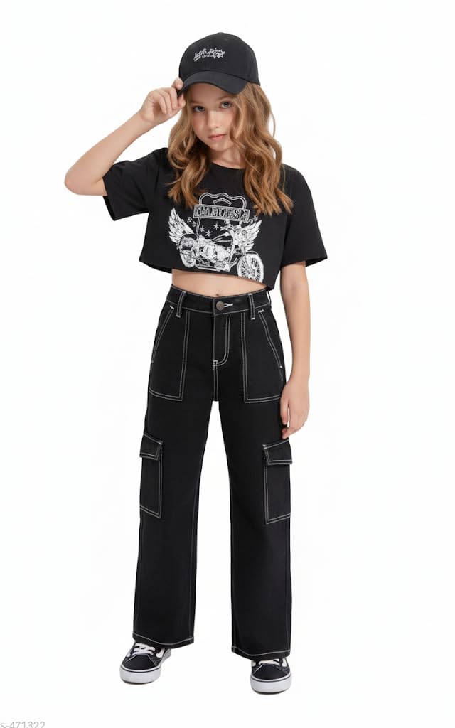 Girls Six Pocket Black Denim Cargo Jeans | Stylish Black Cargo Pants for Girls & Teens | Comfortable & Trendy Casual Wear