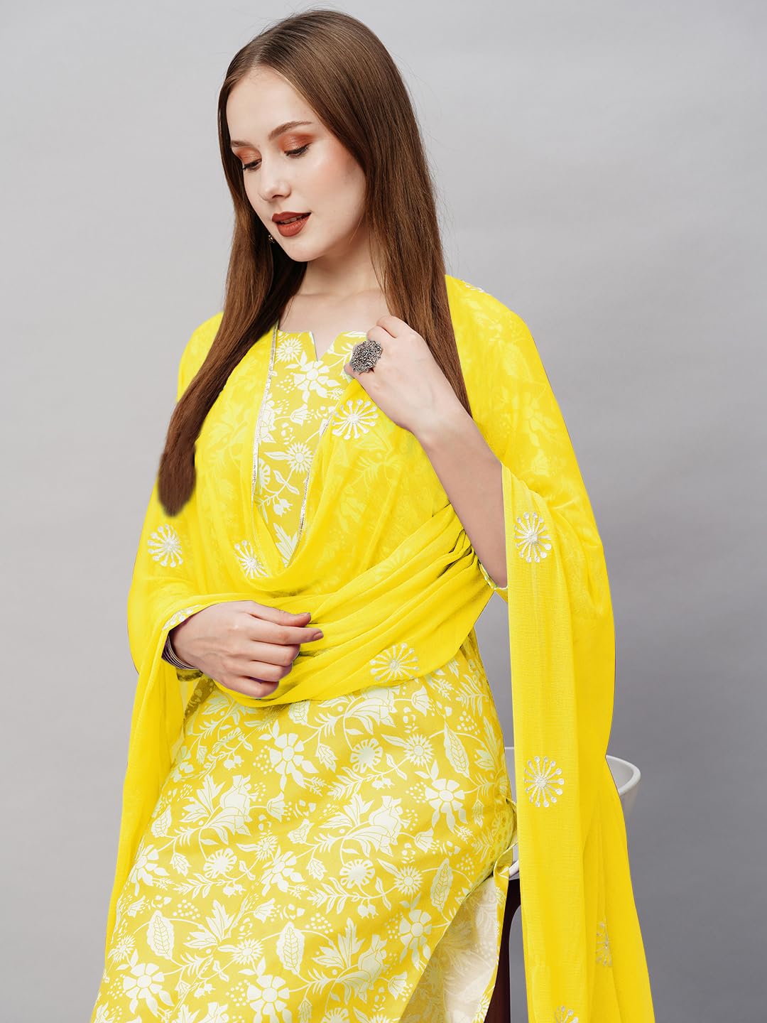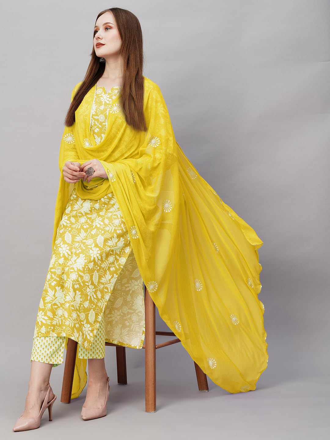 GoSriKi Women’s Cotton Blend Printed Straight Kurta with Pant & Dupatta