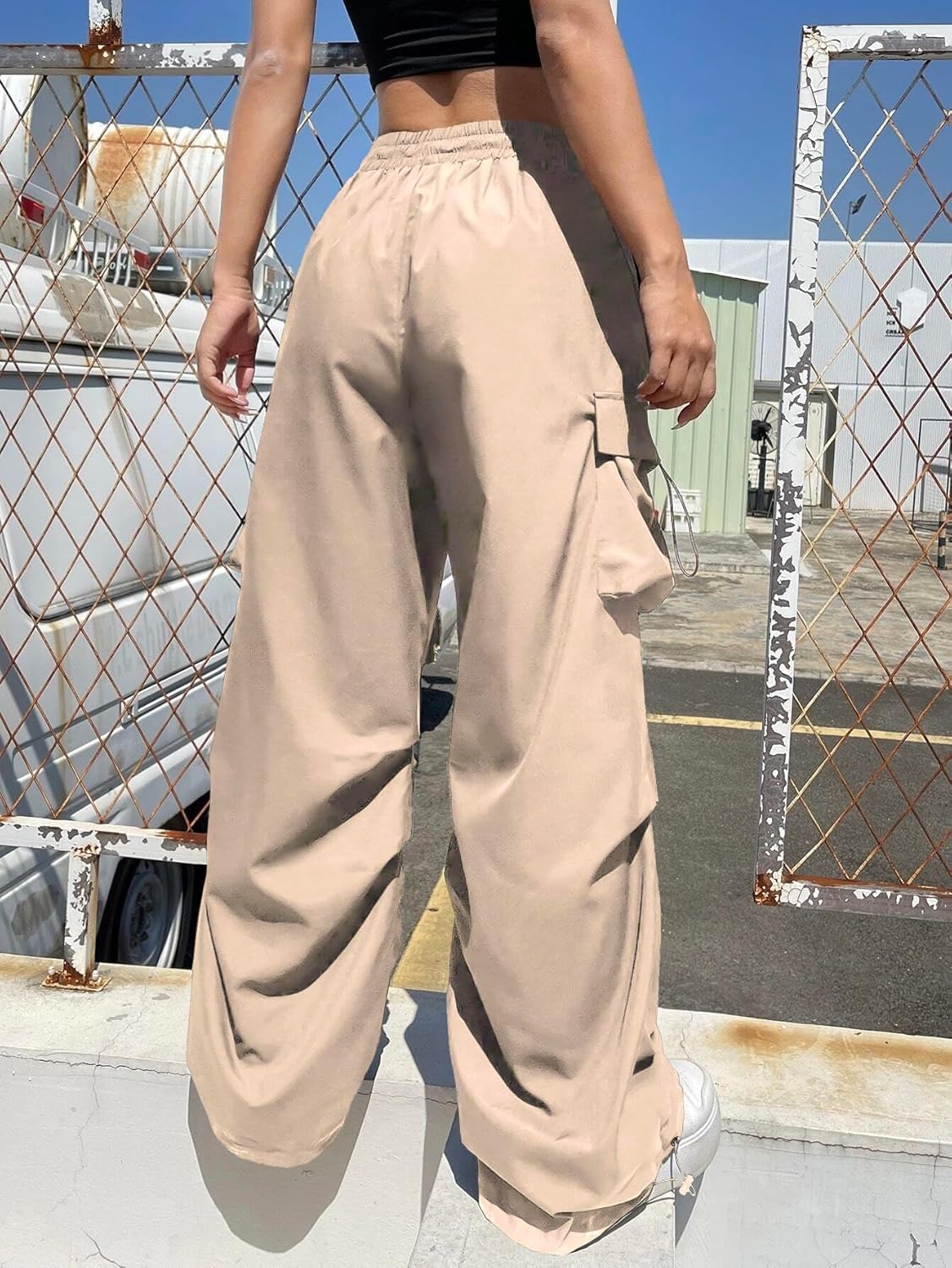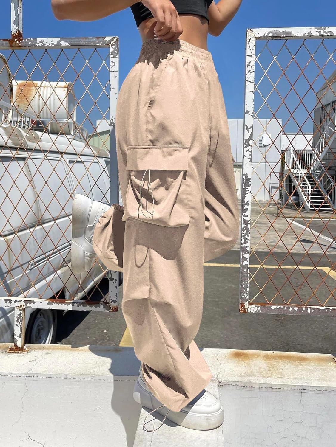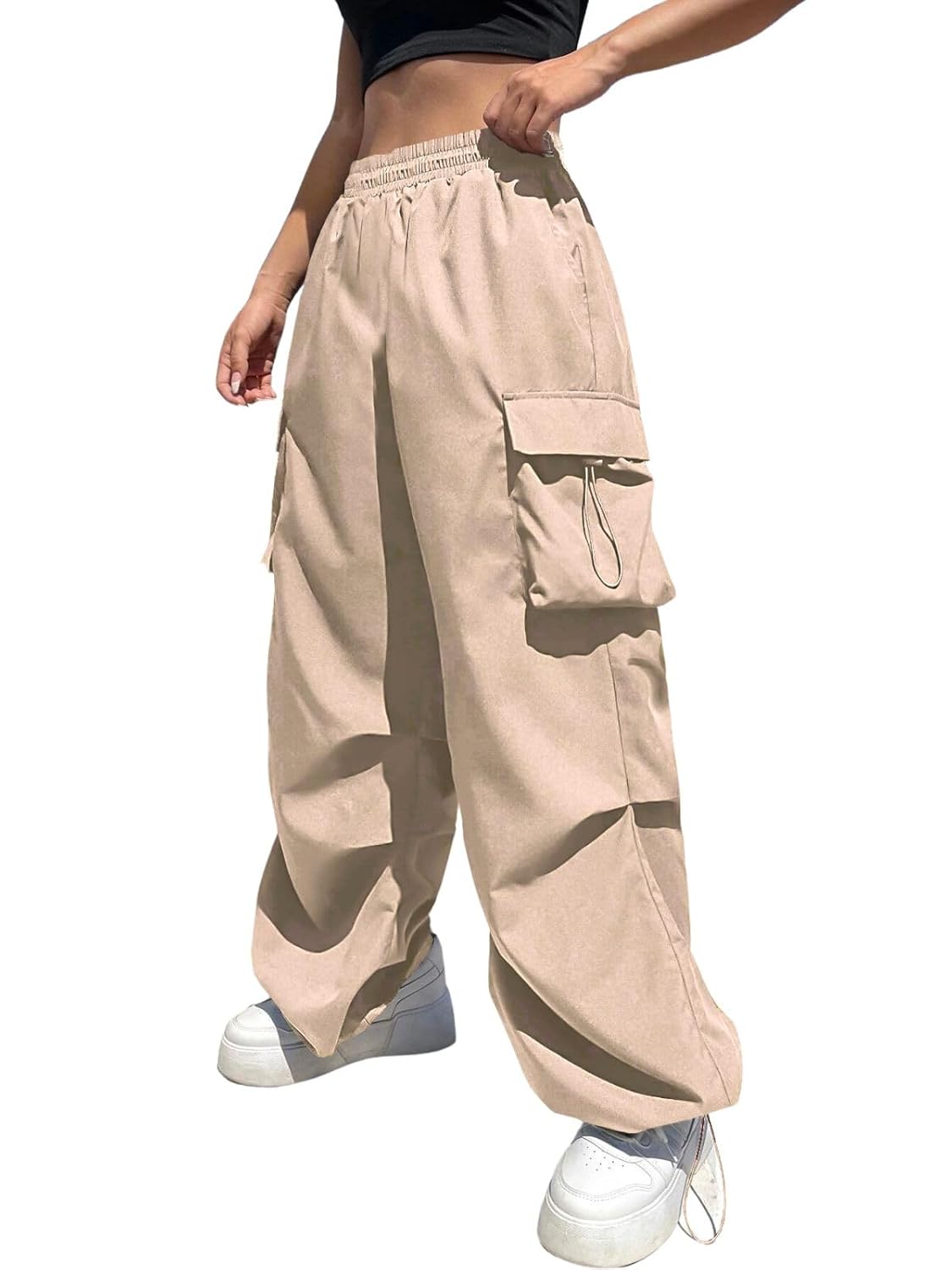 These black cargo pants feature a high-waisted design and multiple utility pockets, perfect for a trendy streetwear look.