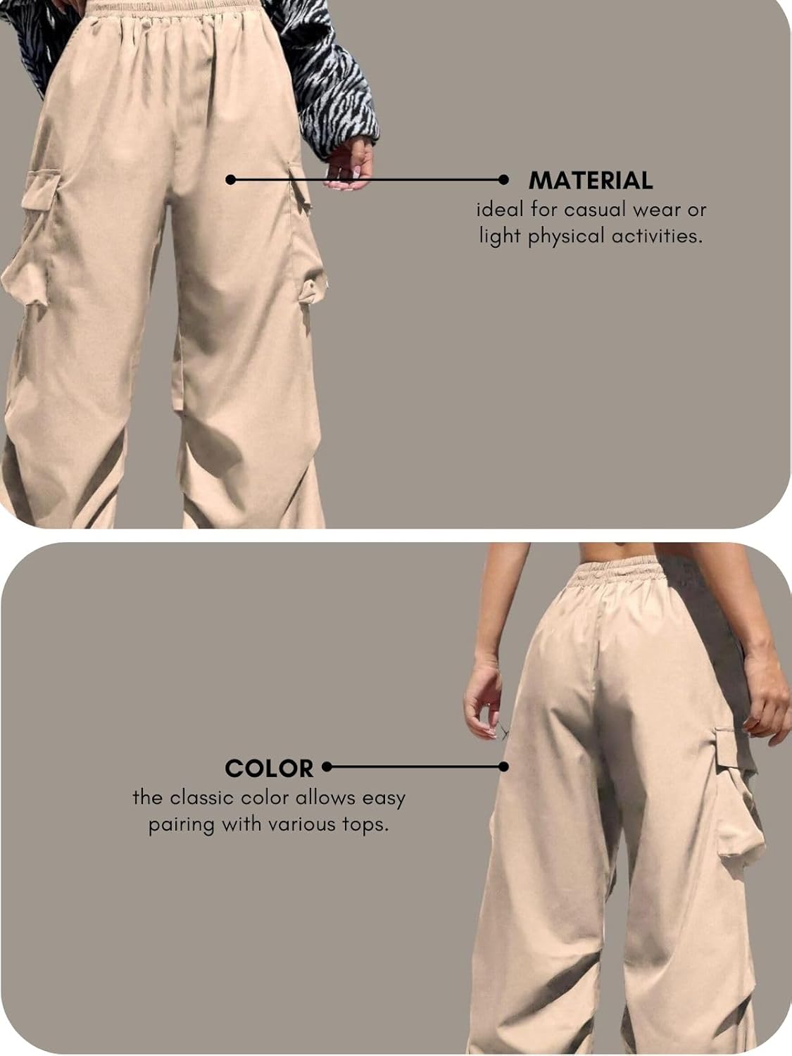Comfortable high-waist cargo pants with soft cotton fabric suitable for daily wear.Good fit with functional pockets and a stylish, versatile look.Great value for money, though sizing should be checked before purchase for best fit.