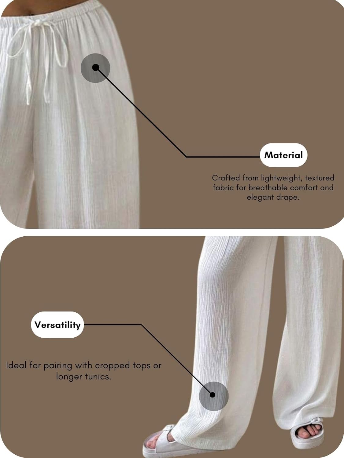 Designed for effortless comfort and flow, these wide-leg trousers feature a relaxed silhouette and an elastic waistband for flexible sizing. Refer to our size chart for waist, hip, and length measurements. For a breezy fit, choose your regular size; size down for a more tapered look.