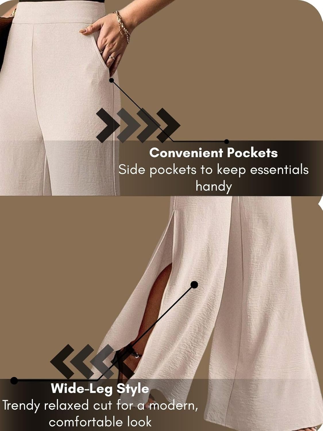 Step into effortless sophistication with these wide-leg trousers featuring a dramatic high slit and graceful drape. Crafted from lightweight fabric for all-day comfort, they pair seamlessly with heels, bodysuits, or blouses—perfect for brunch, evening outings, or resort looks.