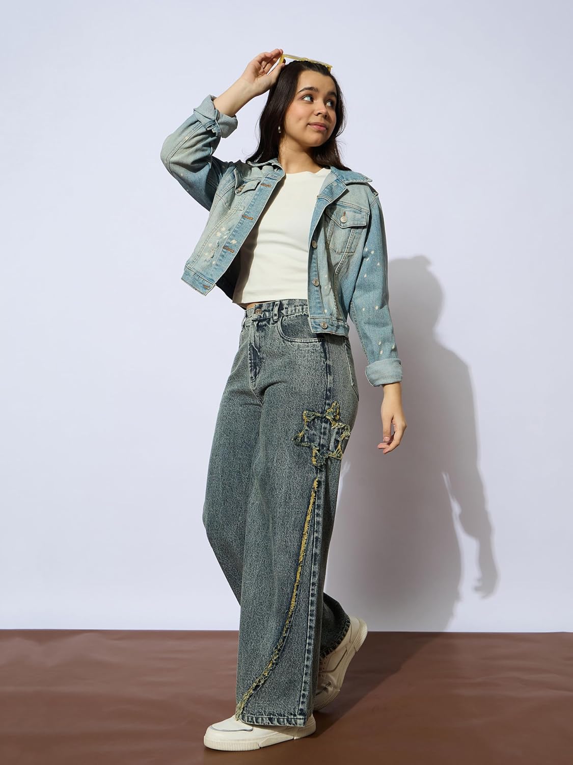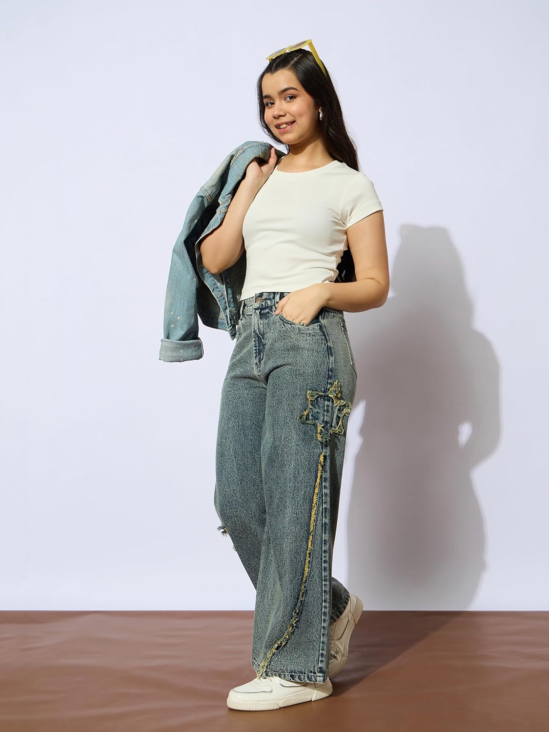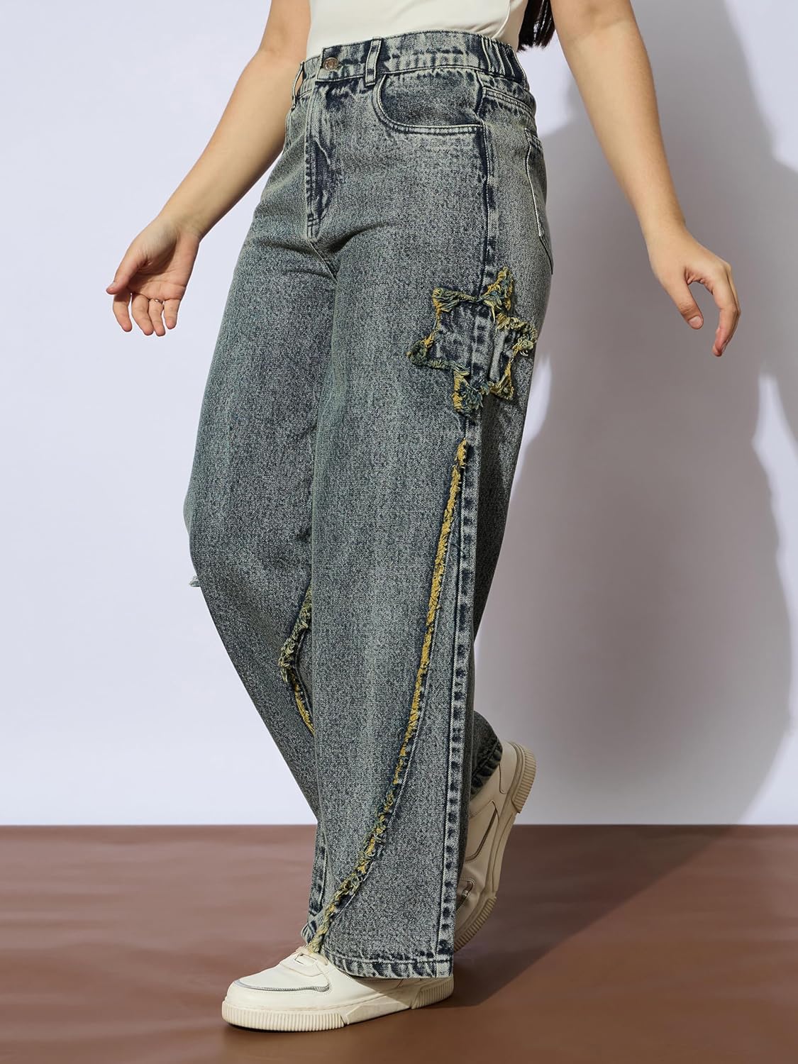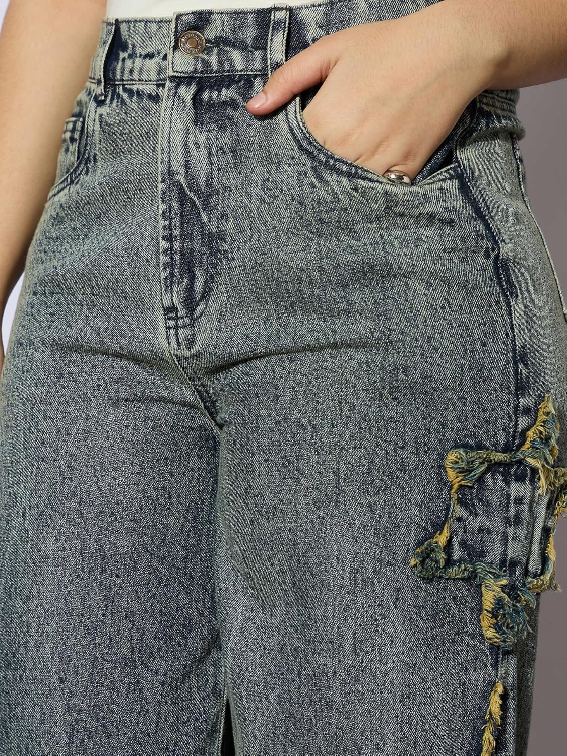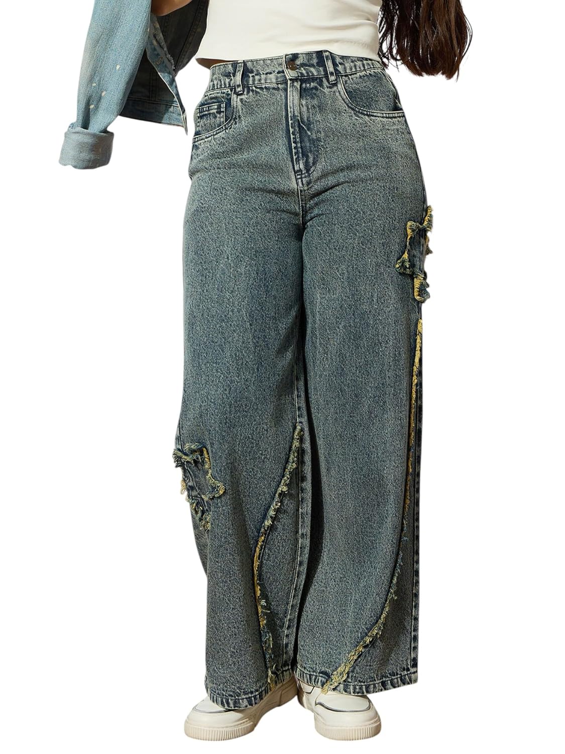 Ice Blue Front Distrace Straight Jeans, in Denim fabric, Unlined, Full Length , Straight Fit, Button Closure, Straight Hemline and features Star Patch Detail At side