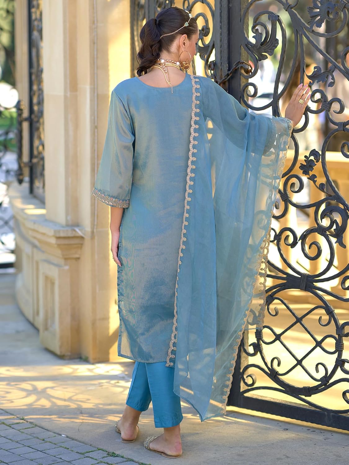 INDO ERA Women’s Silk Blend Embroidered Straight Kurta and Pant with Dupatta Set (KH9BK6210)