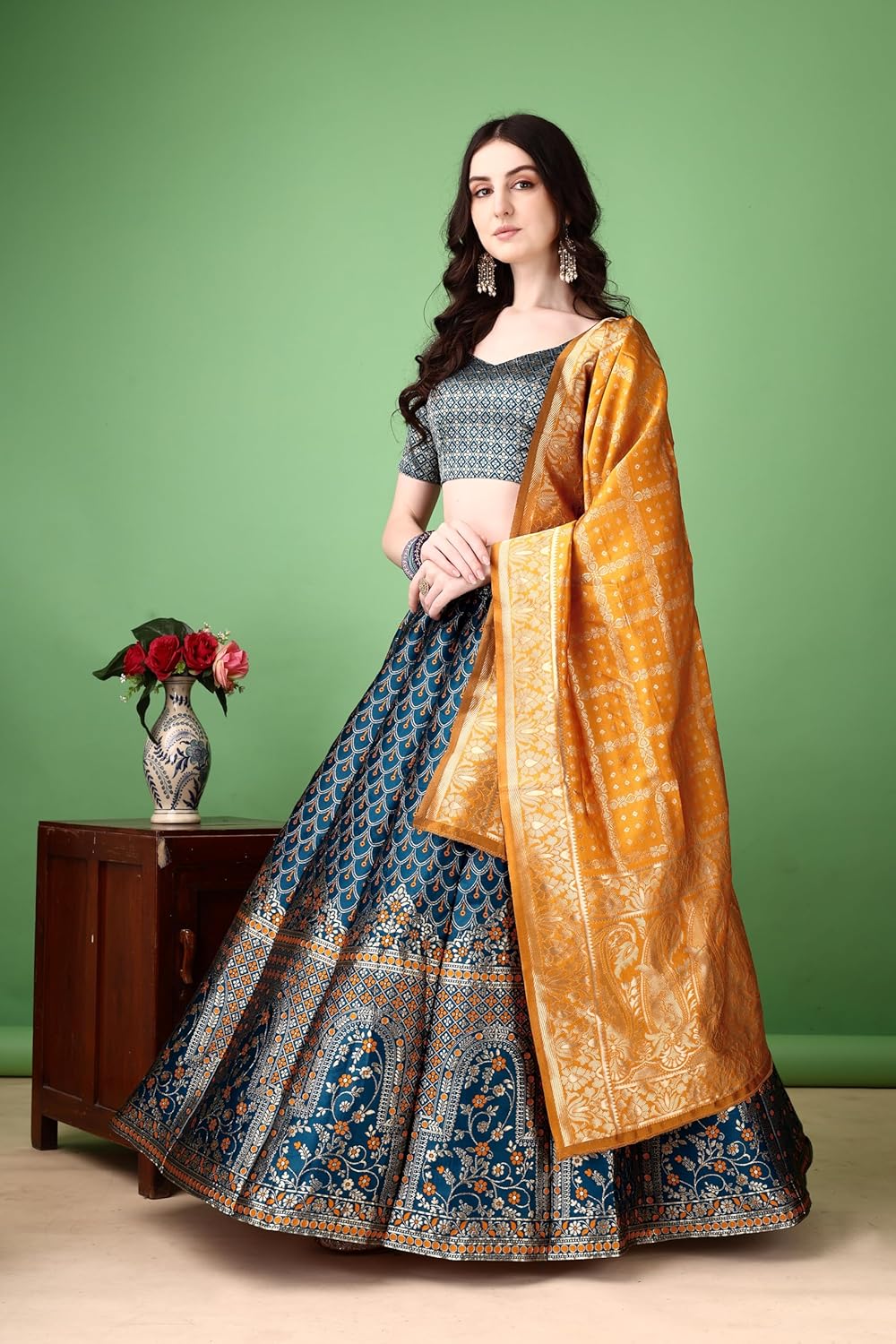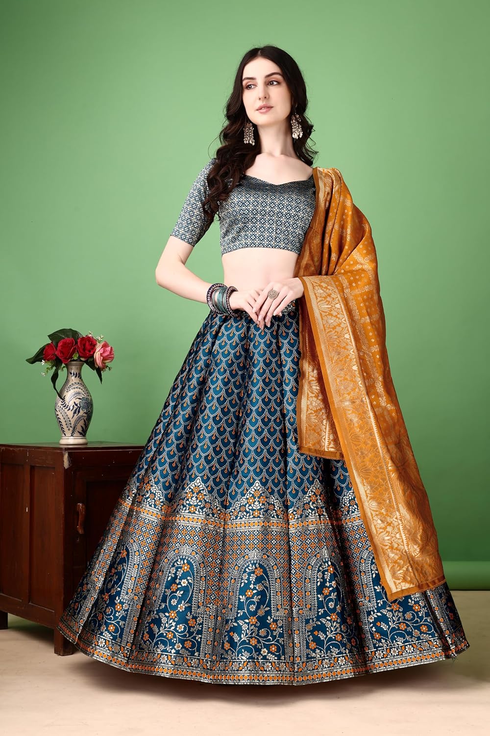 Art Silk. ‘Print or Pattern Type’ : Zari. ‘Sizes’ : Lehenga Waist Size : 38 inch, Lehenga Length Size: 41 inch.Waid : 44″ inch. ‘Lehenga’ : -Solid With Woven. ‘Type’ : Stitched. ‘Clothing filling’ : : Litchi Silk With Smuth,Soft And Shine Base.