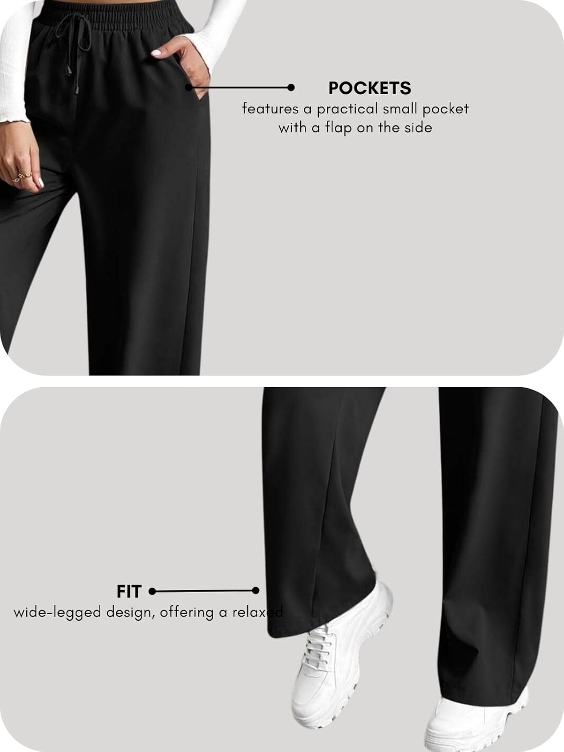These black wide-leg pants offer a relaxed fit and a drawstring waist for easy adjustment. Perfect for lounging or running errands in style.