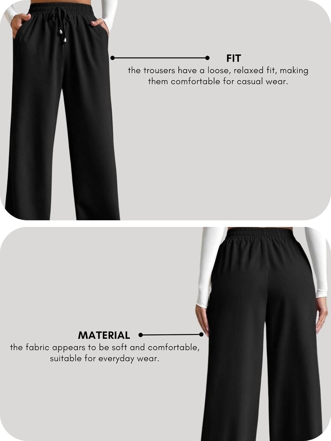 Elevate your everyday style with these sophisticated black pants. The elastic waistband and wide-leg design offer both comfort and elegance.