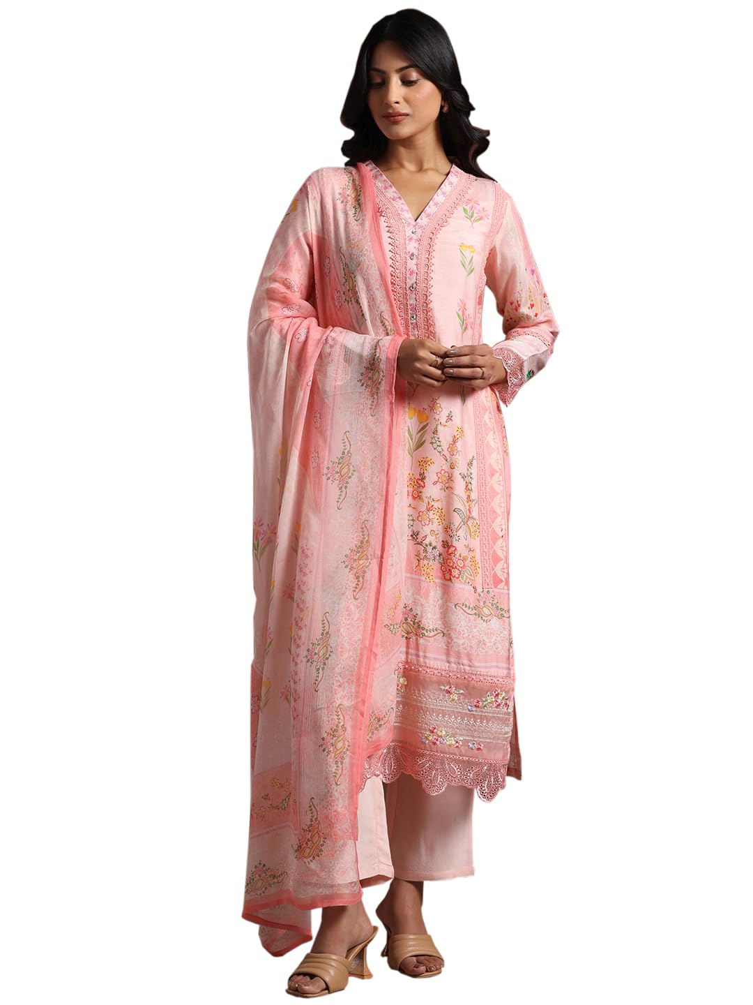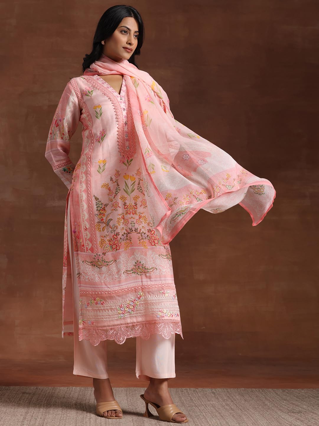 Women pink floral printed muslin kurta with lining and solid trousers with floral printed dupatta