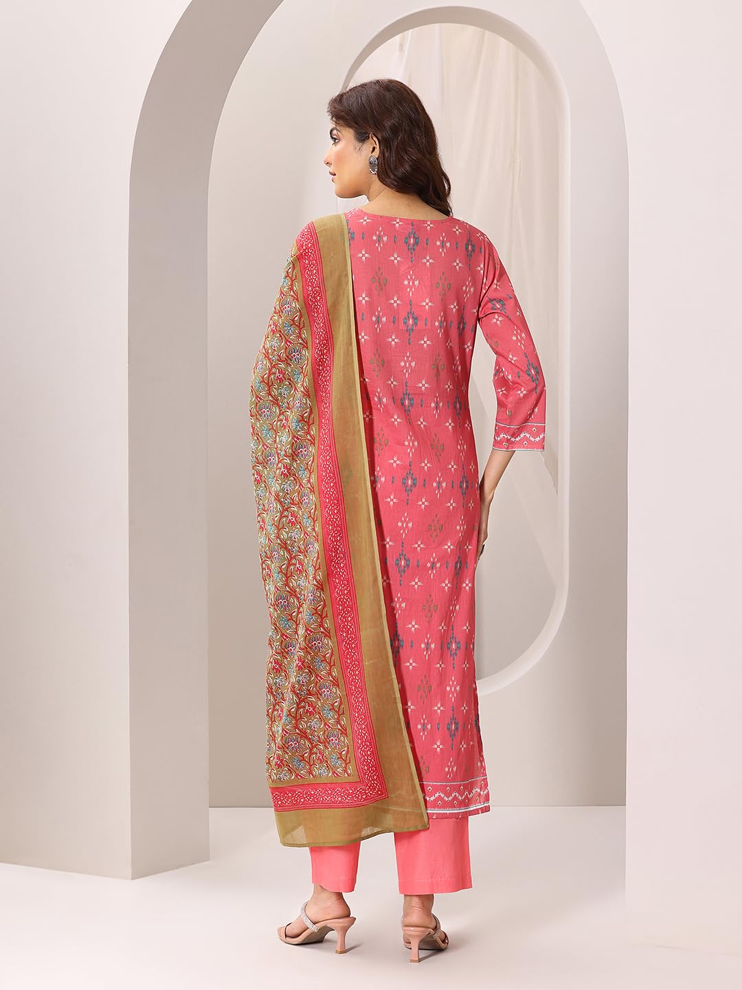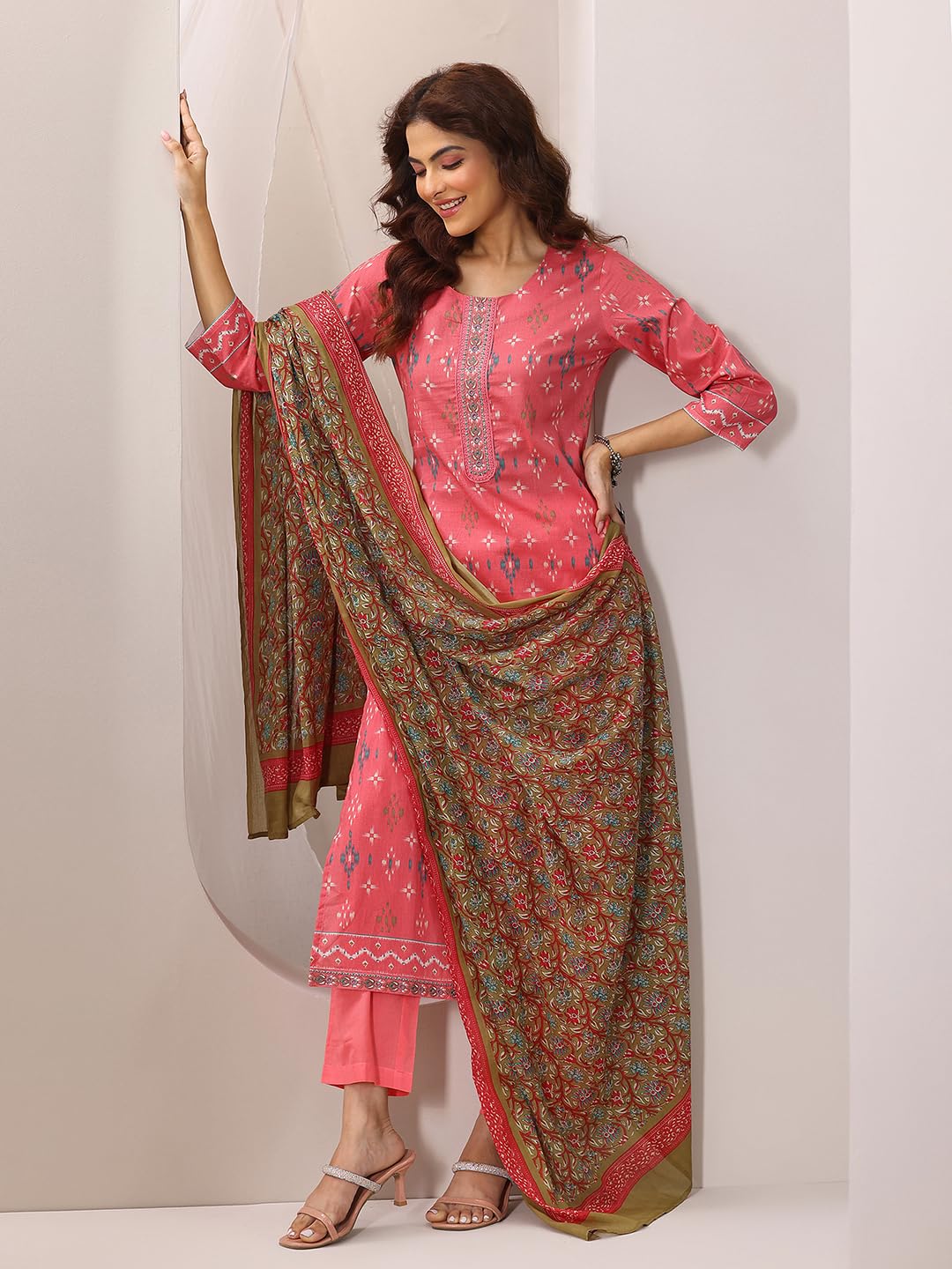 Coral abstract printed straight kurta with solid trouser and floral printed dupatta
