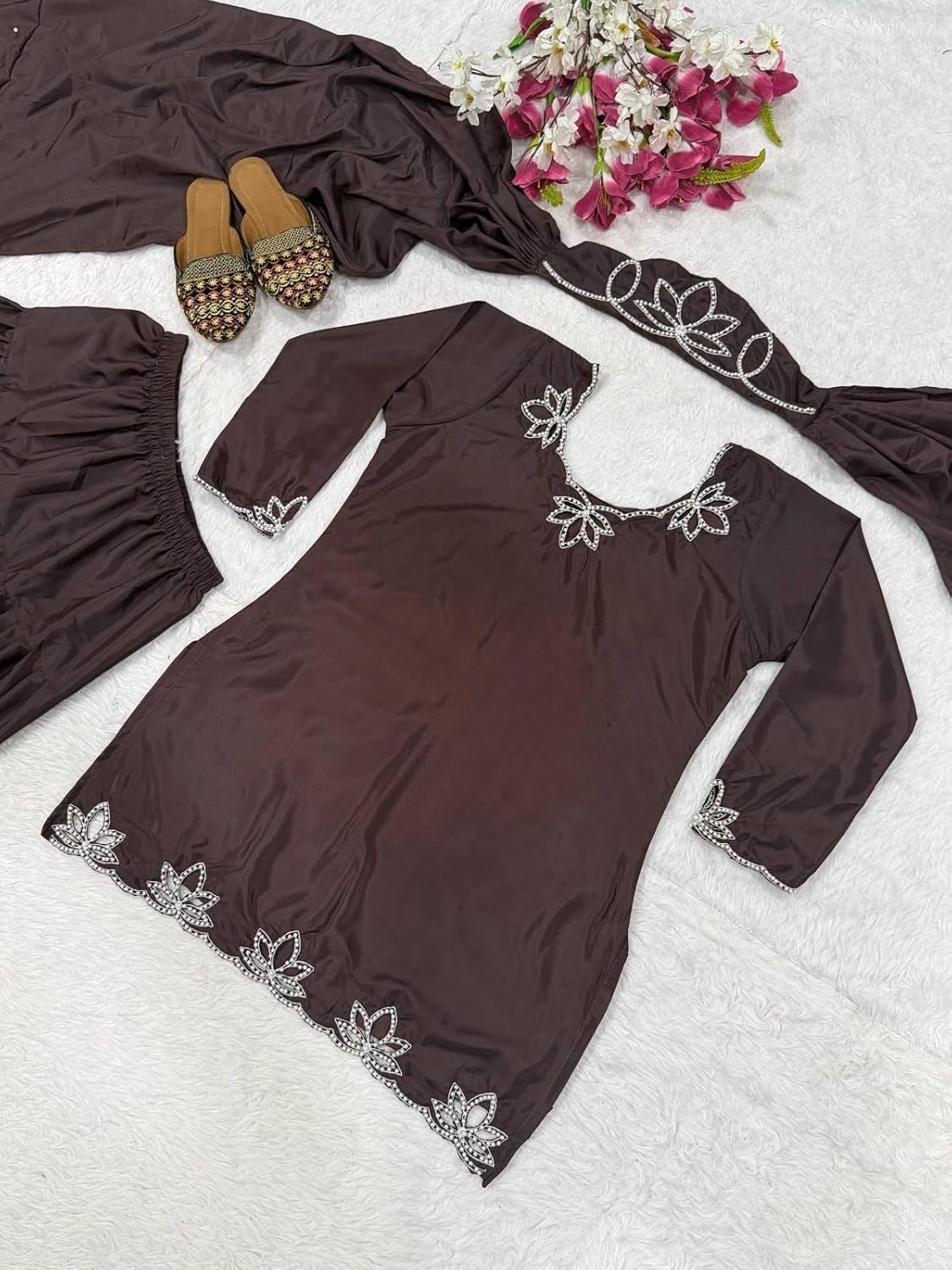 Make a refined and unforgettable statement with this Luxury Black Embroidered 3-Piece Suit Set, a sophisticated ensemble designed for women who appreciate timeless elegance and modern grace. Crafted in a rich black tone, this outfit exudes understated luxury while highlighting intricate silver leaf embroidery that adds a delicate yet eye-catching contrast.
