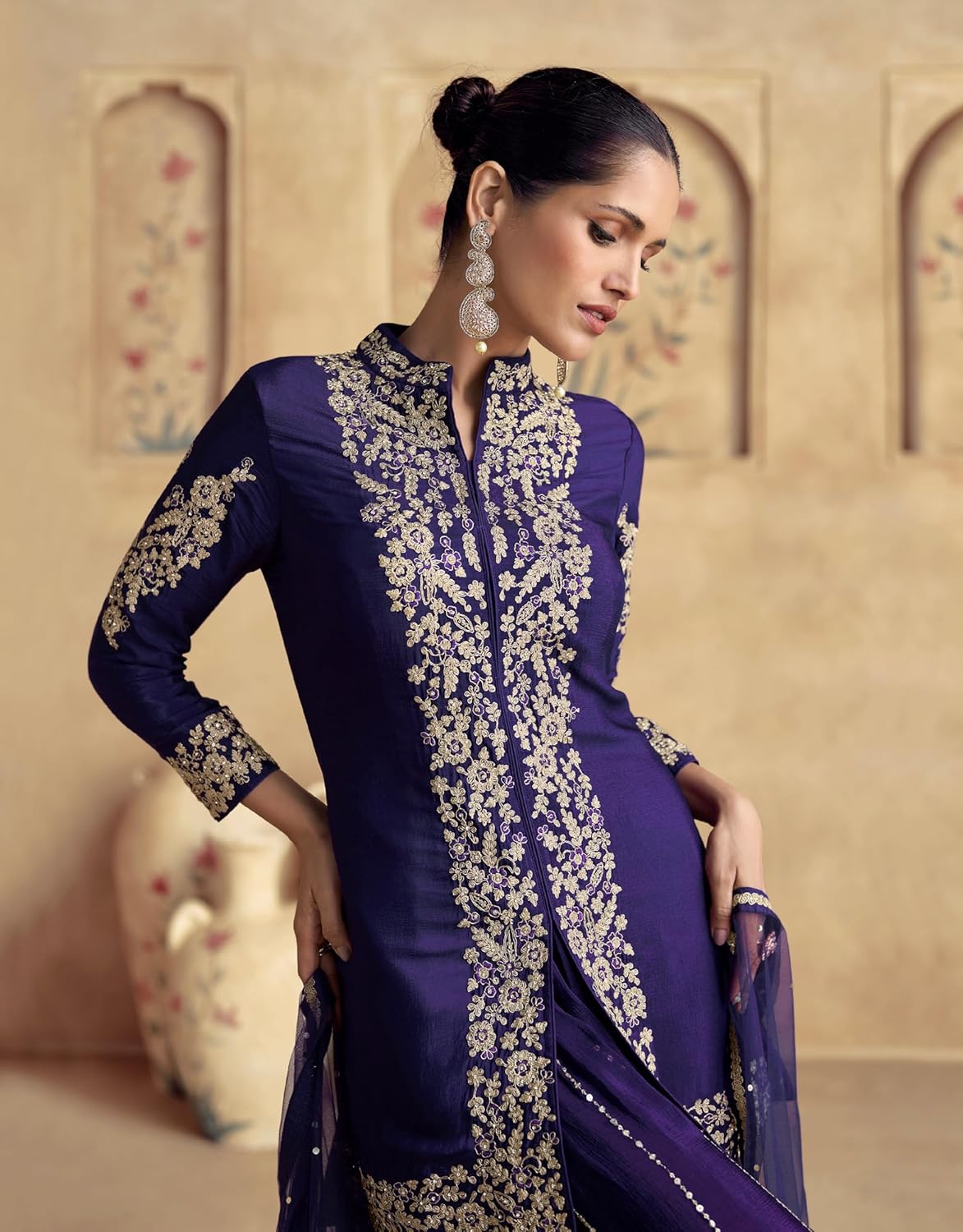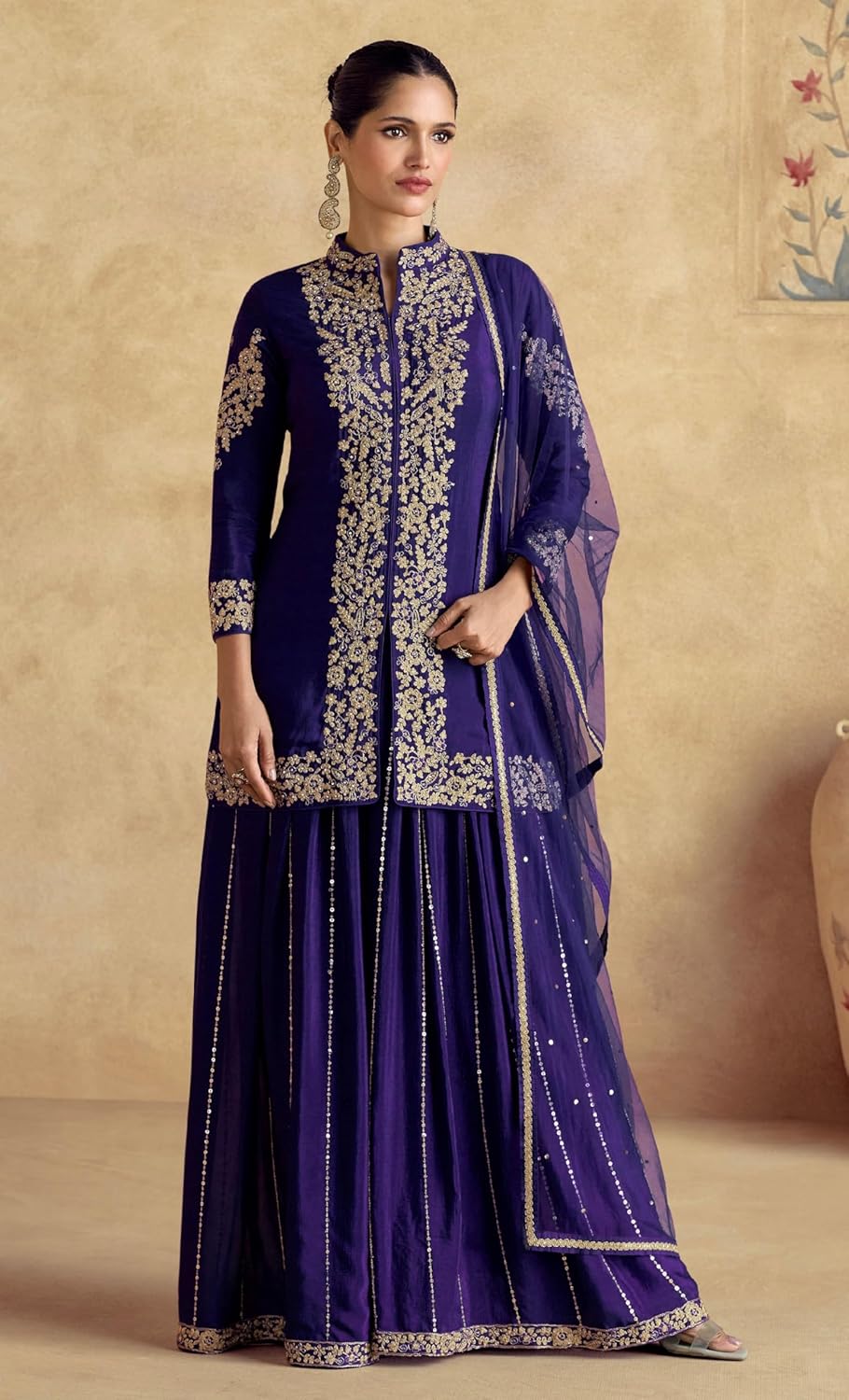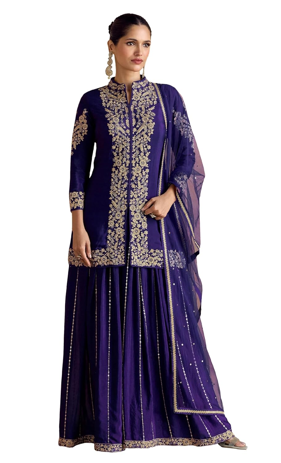 Top Details : Color : Purple, Top Fabric : Chinon, Top Stitching : Stitched, Top Work : Embroidered, Top Length : 33 Inches , Top Type : Straight Kurta, Product Type : Kurta Palazzo Set Bottom Details : Bottom Fabric : Chinon, Bottom Inner : Santoon, Bottom Stitching Type : Stitched, Bottom Length : 41 Inch, Bottom Waist : 48 Inch Dupatta Details : Dupatta Fabric : Chinon, Dupatta Work : Embroidered, Dupatta Fabric Length : 2.15 Mtrs