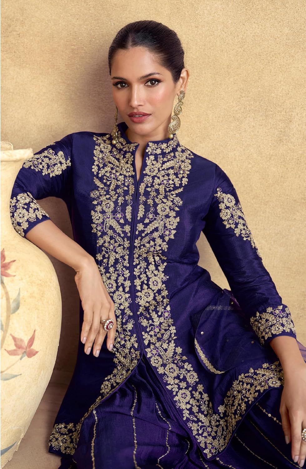 8 reviews for Miss Ethnik Women’s Purple Chinon Stitched Top With Bottom and Dupatta 3/4 Sleeve Embroidered Kurta Palazzo Set (ME-1245)