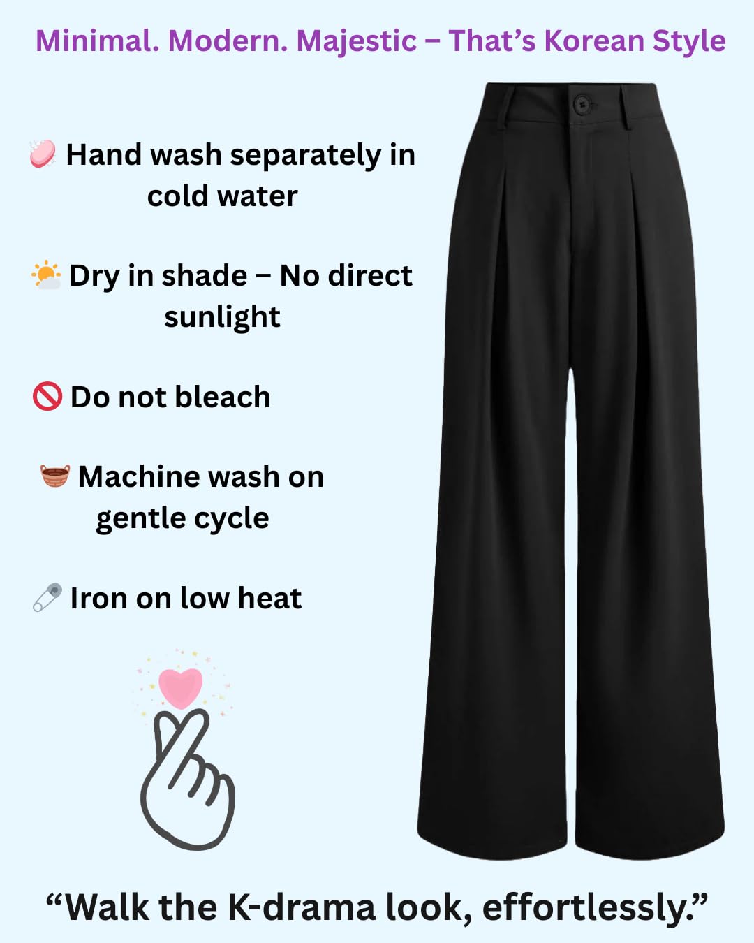 These Korean pants are great. The fabric is very soft and comfortable. The fit is also proper, true to size. It looks so smart and elegant.