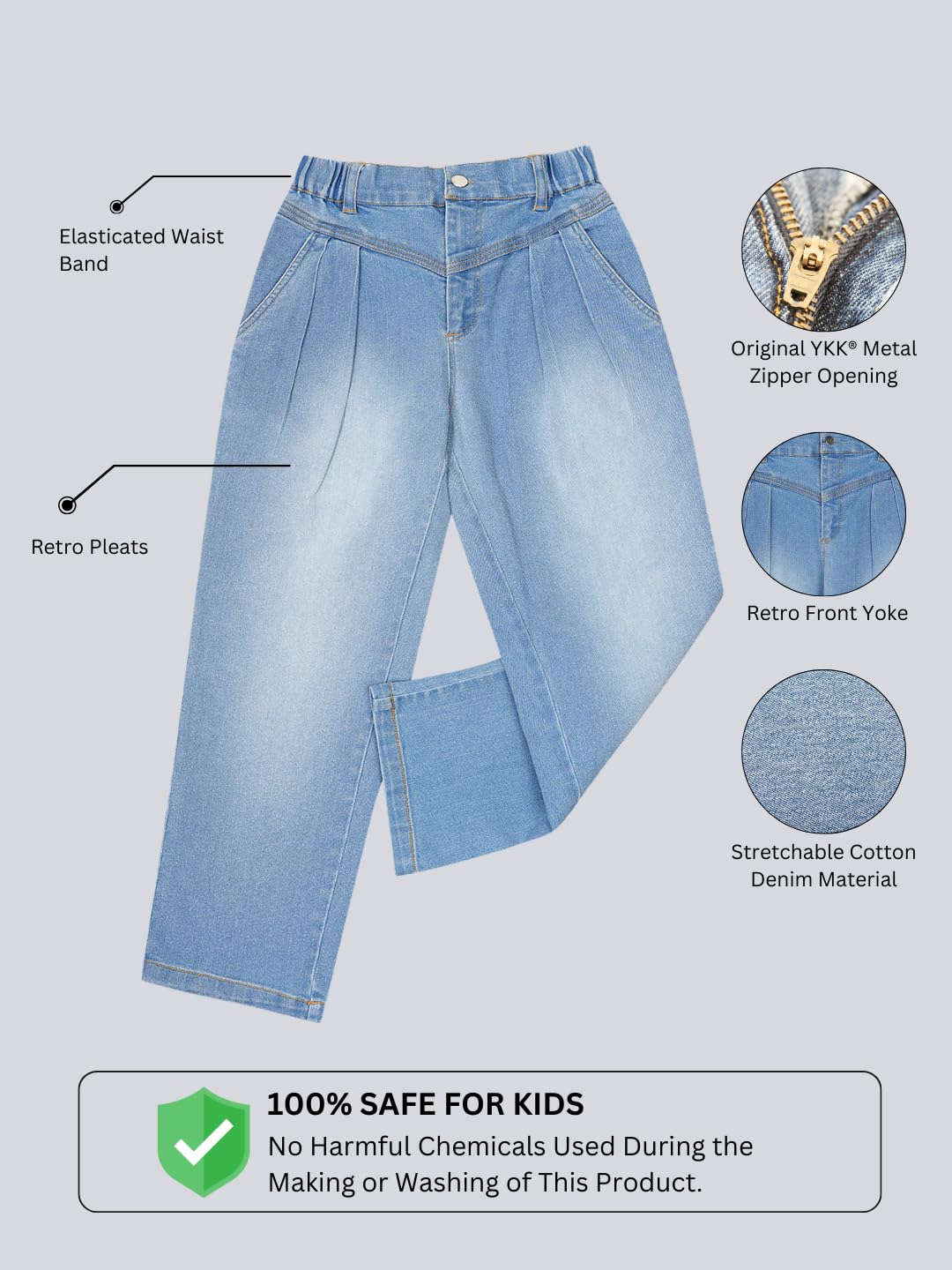 The Olele Girls Wide Leg Baggy Jeans offer a trendy yet comfortable style, crafted for kids aged 4 to 14 years. Made from high-quality cotton denim and handcrafted in India, these jeans are designed to provide a relaxed, wide-leg fit that ensures both comfort and mobility for active kids. Featuring an original YKK metal zipper opening, these jeans are built for durability and ease of use. The raw edge bottom hem adds a touch of modern flair, while the raw denim bio-wash ensures a soft, skin-friendly finish that’s perfect for everyday wear. Whether paired with a casual t-shirt or a stylish top, these baggy jeans bring a chic and contemporary vibe to any outfit. Designed with attention to detail, Olele combines premium craftsmanship with fashion-forward design to deliver a wardrobe essential for your little one.
