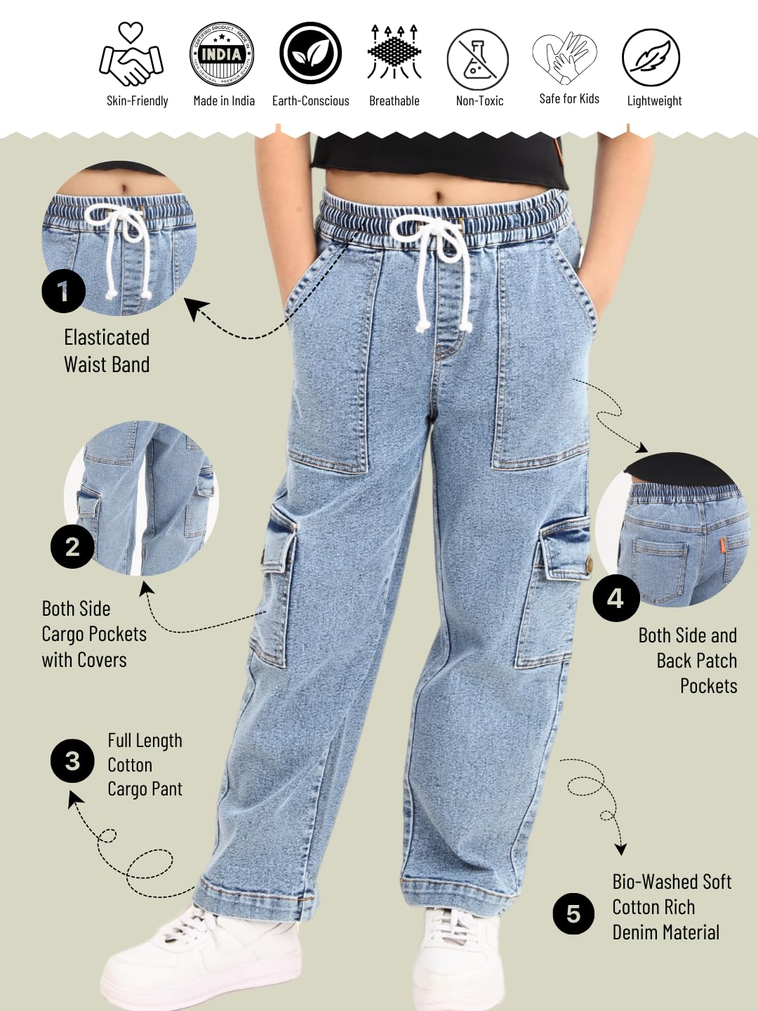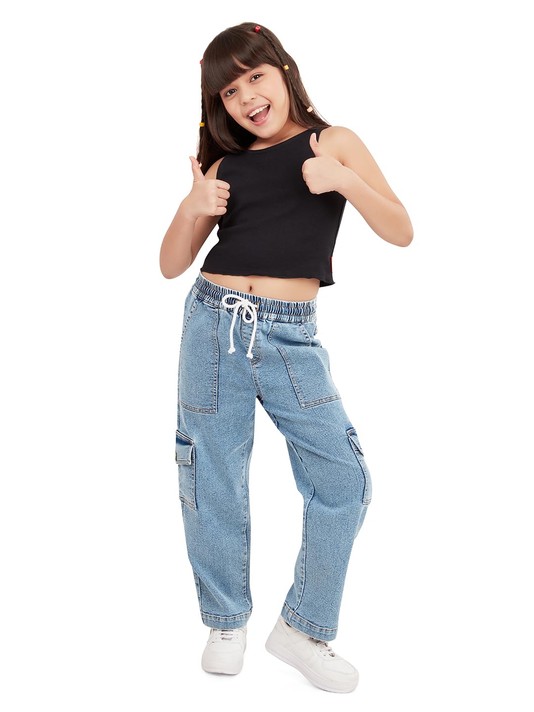 olele® Girls Super Jeans Collection for 4–14 Yrs | Stretchable Cotton Denim Trousers | Blue Jeans for Kids | Baggy Denim Pants | Cargo Pants for Girls
