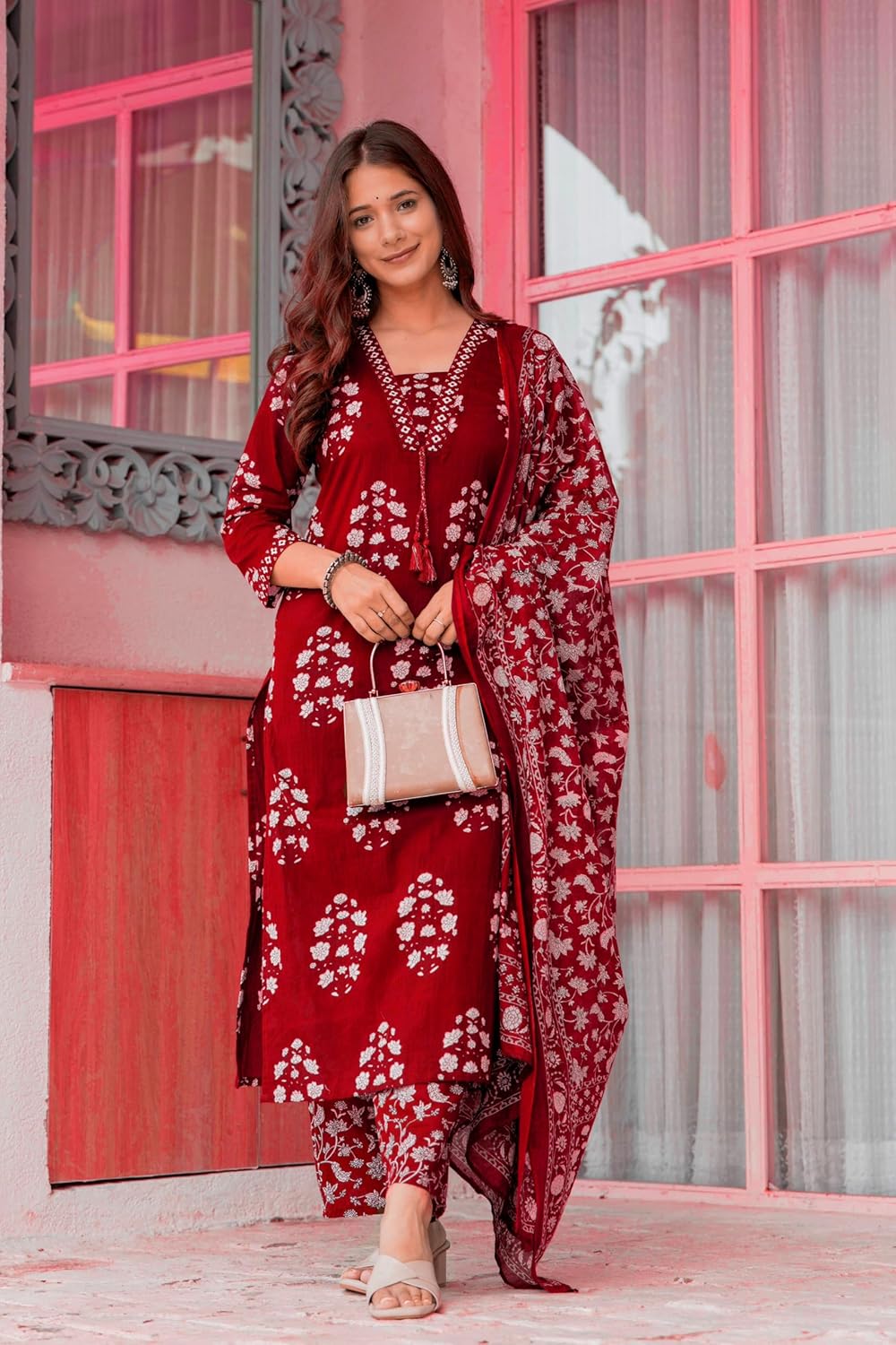 This set includes: 1 Kurta and 1 Pant with Dupatta || Work :- Printed|| Neck Style:-V-Neck Colour Declaration : There might be slight variation in the actual color of the product due to different screen resolutions.