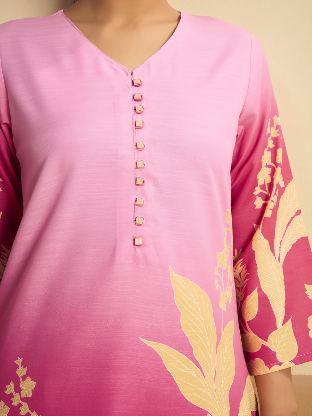 Upgrade your ethnic wardrobe with this elegant Pinkmint Women Kurta Pant Dupatta Set, designed to offer both comfort and style. The kurta is crafted from premium cotton blend fabric and features a classy V-neck design with front button detailing, giving it a modern yet traditional touch.The set includes printed cotton blend pants that ensure ease of movement and a flattering fit. Completing the look is a beautifully designed lace border dupatta, adding charm and sophistication to the outfit.With its floral prints and soothing color palette, this kurta set is ideal for festive occasions, office wear, casual gatherings, and traditional events. Pair it with ethnic footwear or minimal accessories for a graceful look.