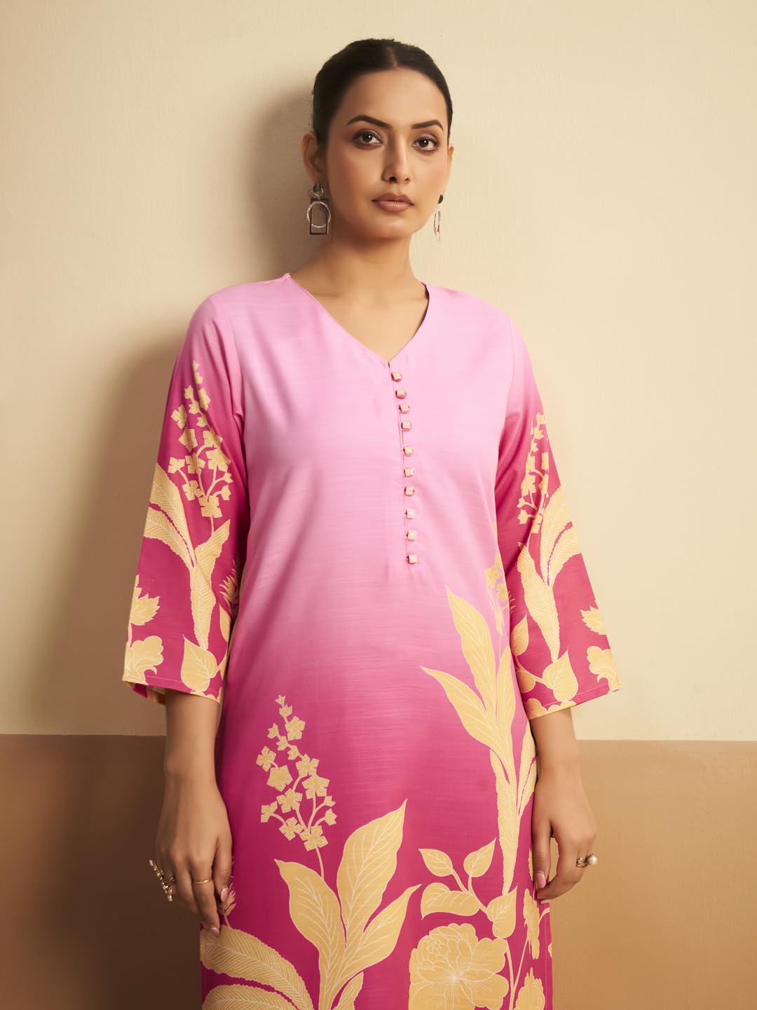 Generic Name : Cotton Blend Kurta Pant Dupatta Set | V-Neck Kurta with Front Buttons | Printed Pants | Lace Border Dupatta | Ethnic Wear Kurta Set