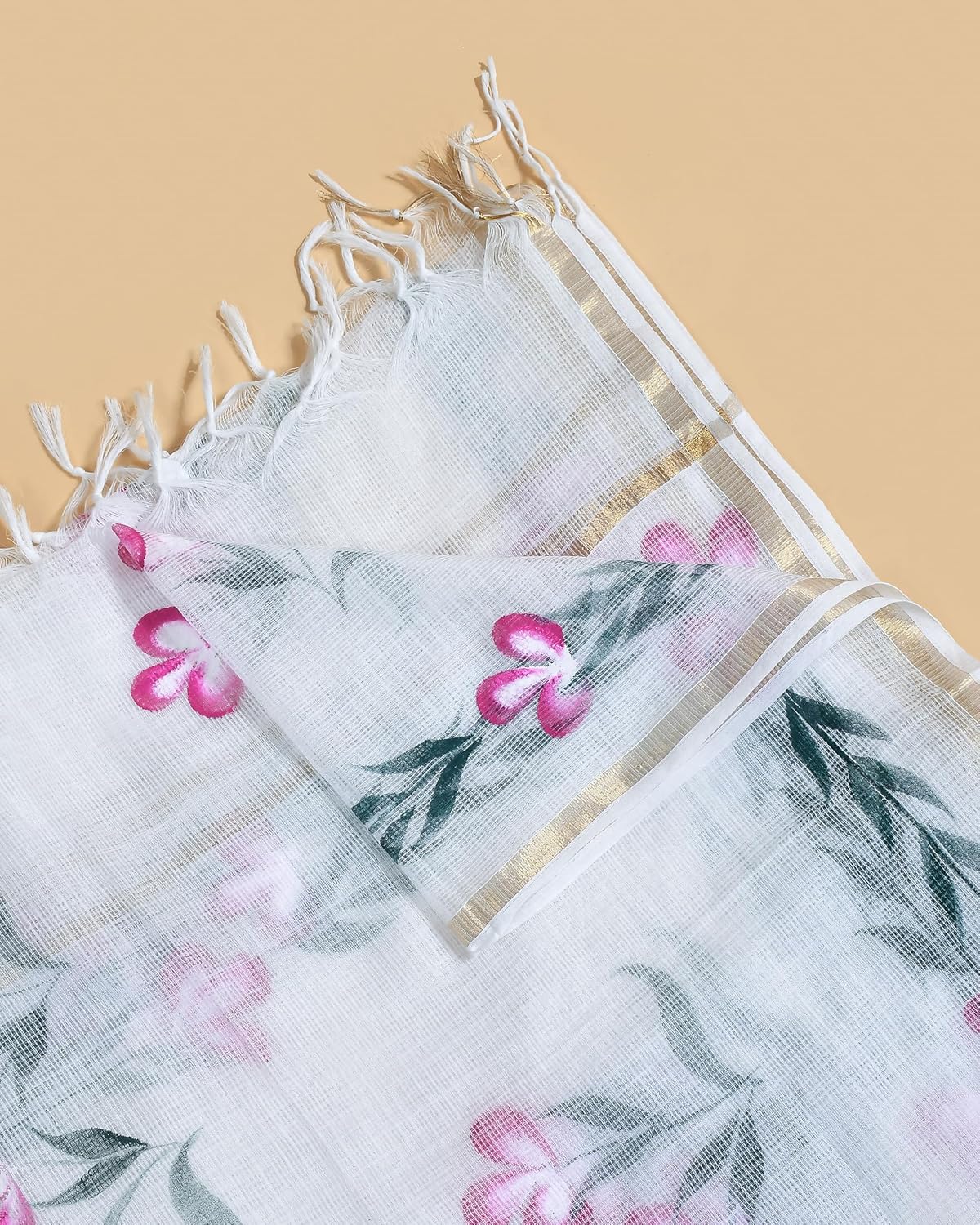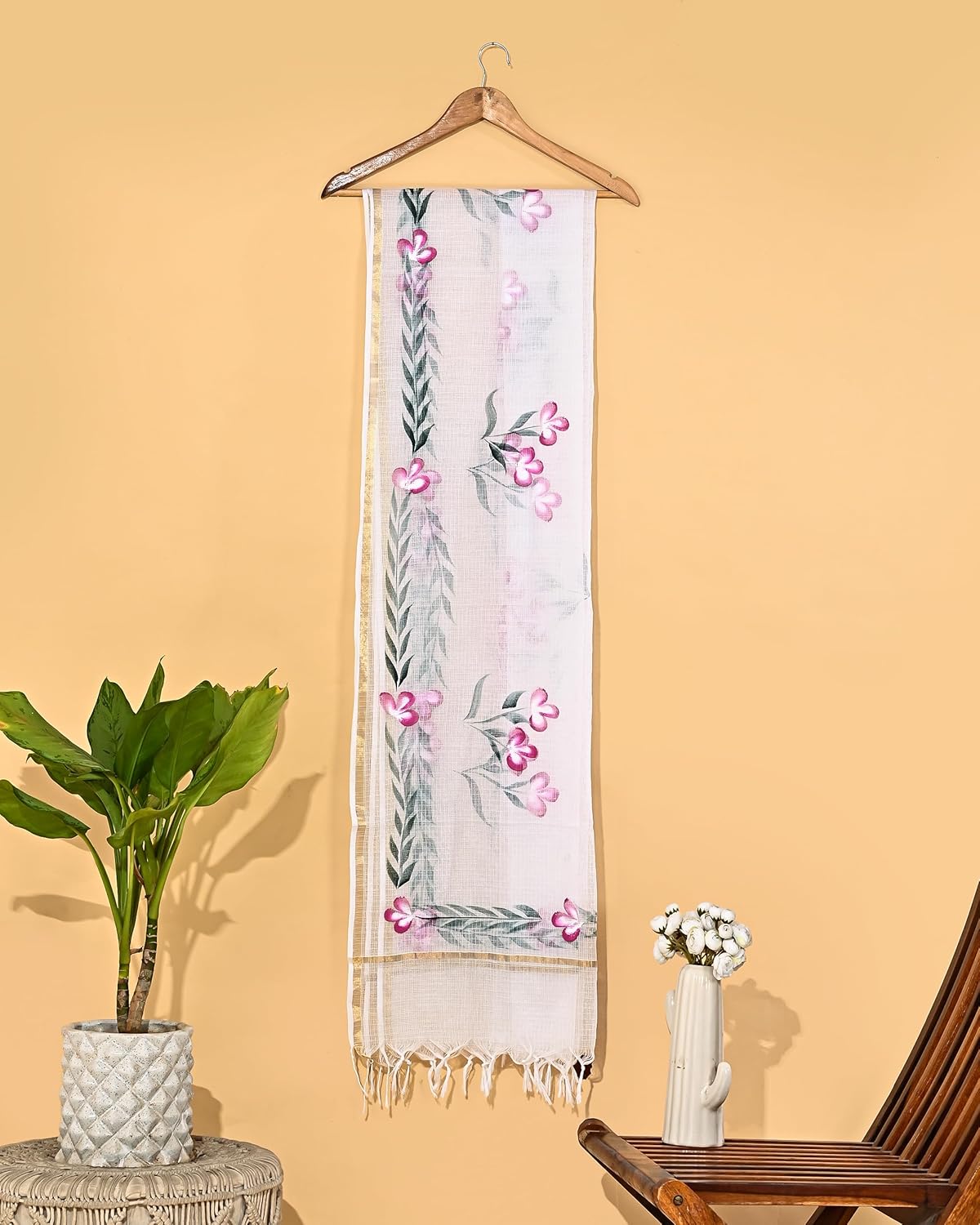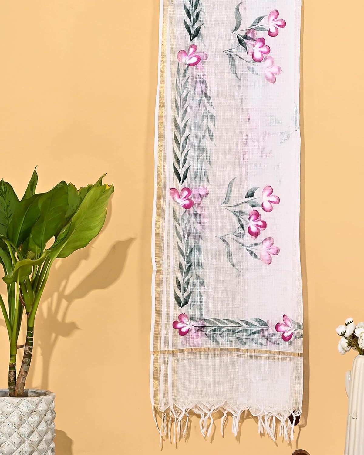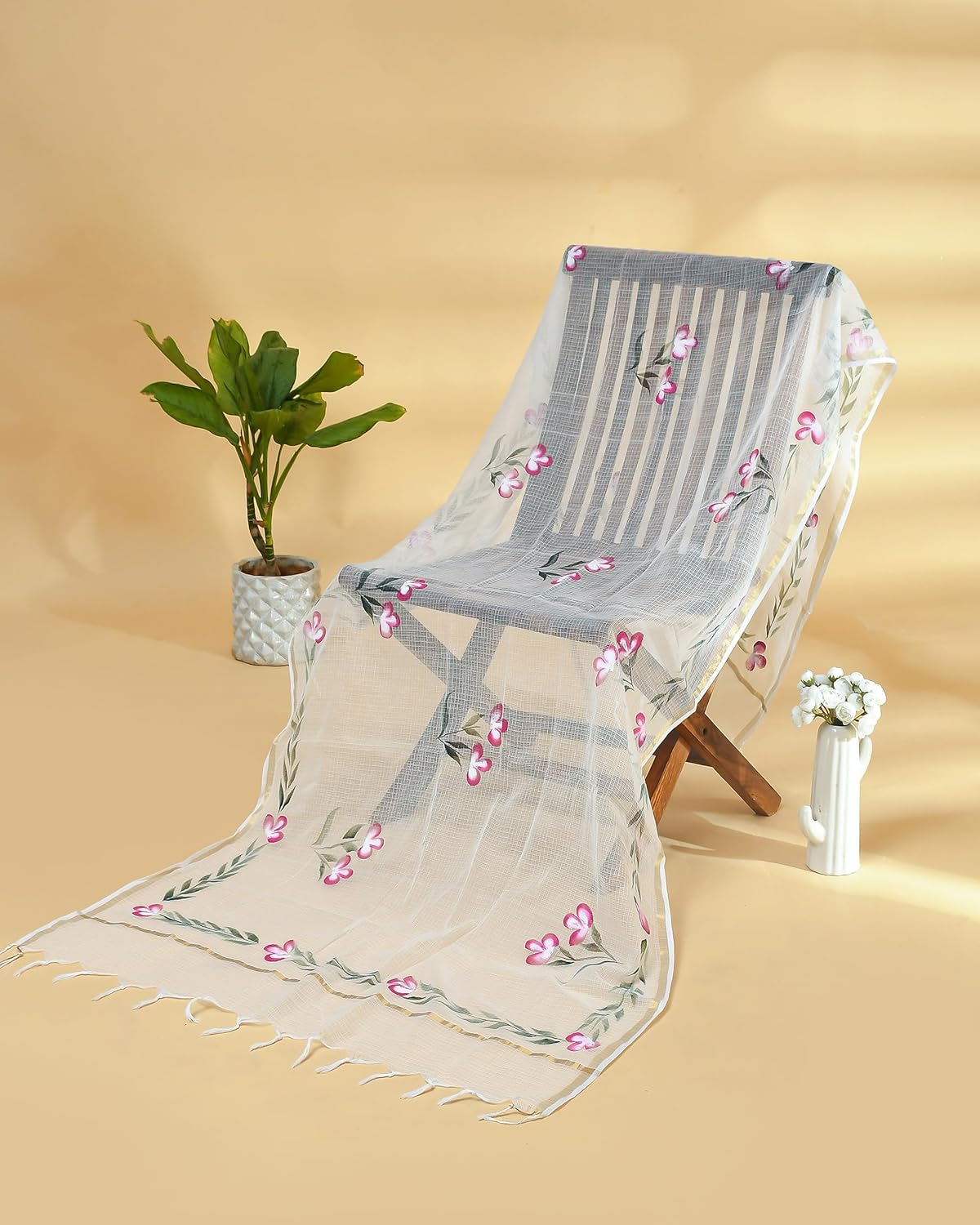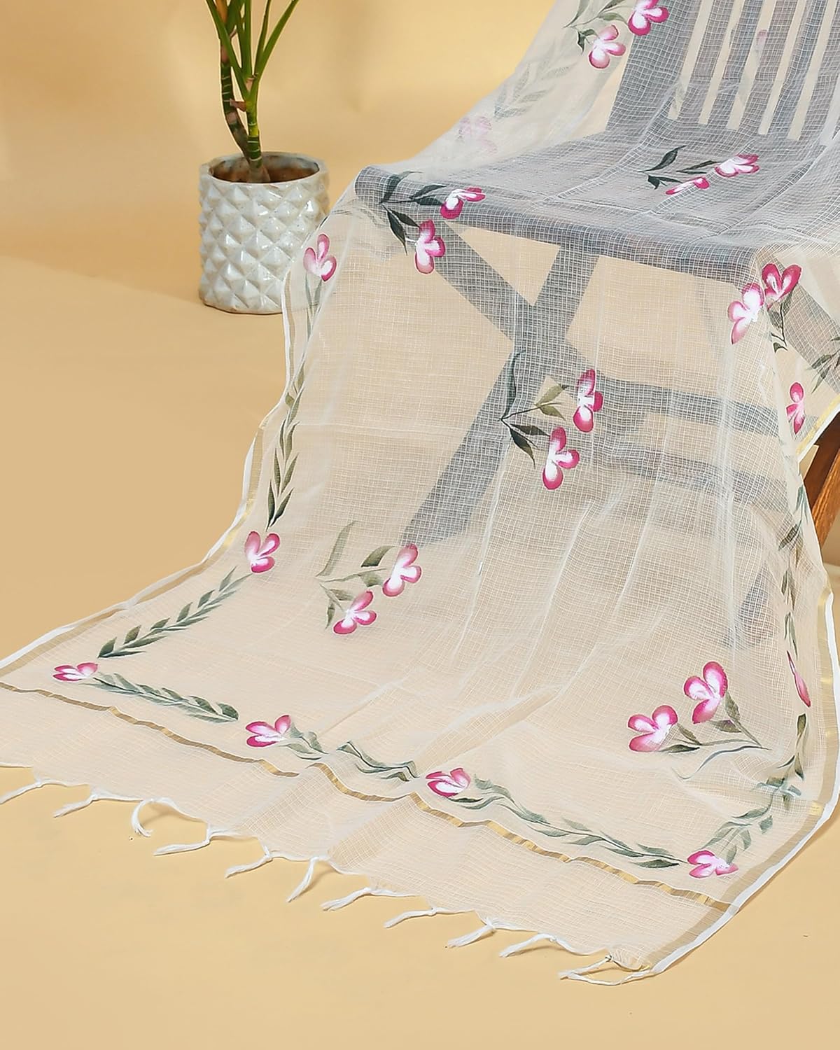 Enhance your attire with the Hand Painted Kota Doria Dupatta, an exquisite piece of clothing that exudes elegance. This beautiful dupatta is hand-painted and made of kota doria fabric, making it a perfect addition to your wardrobe.