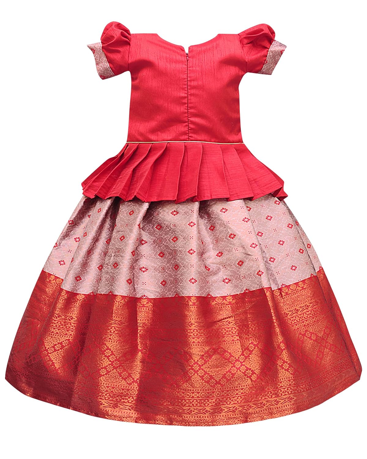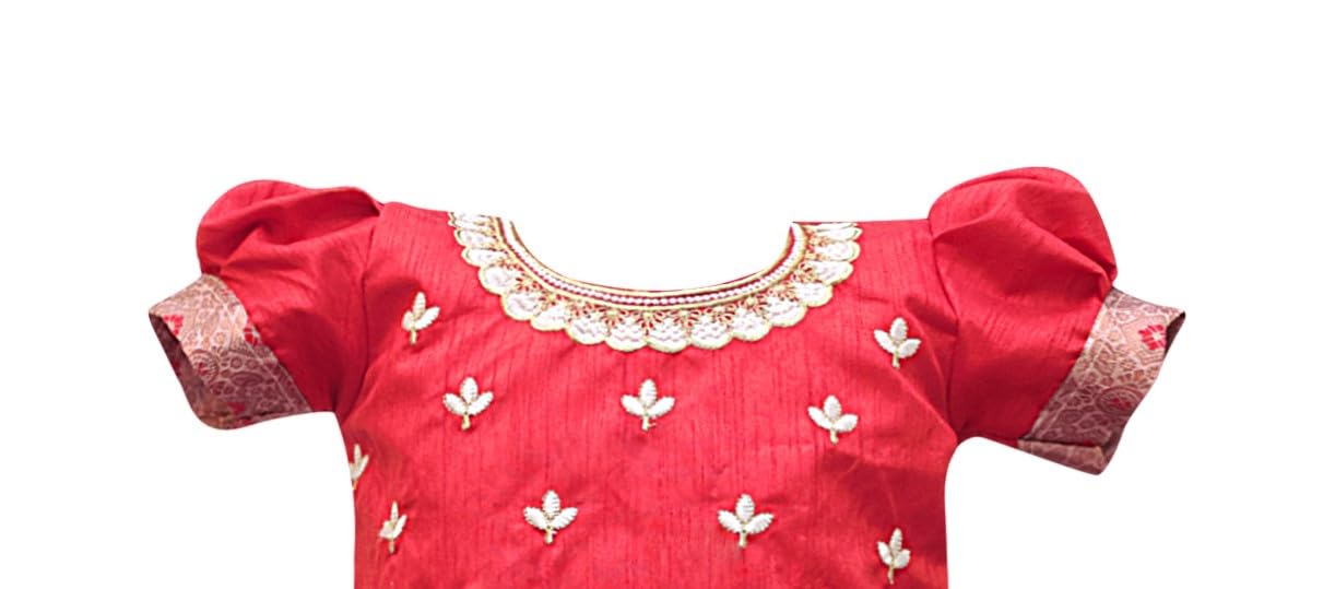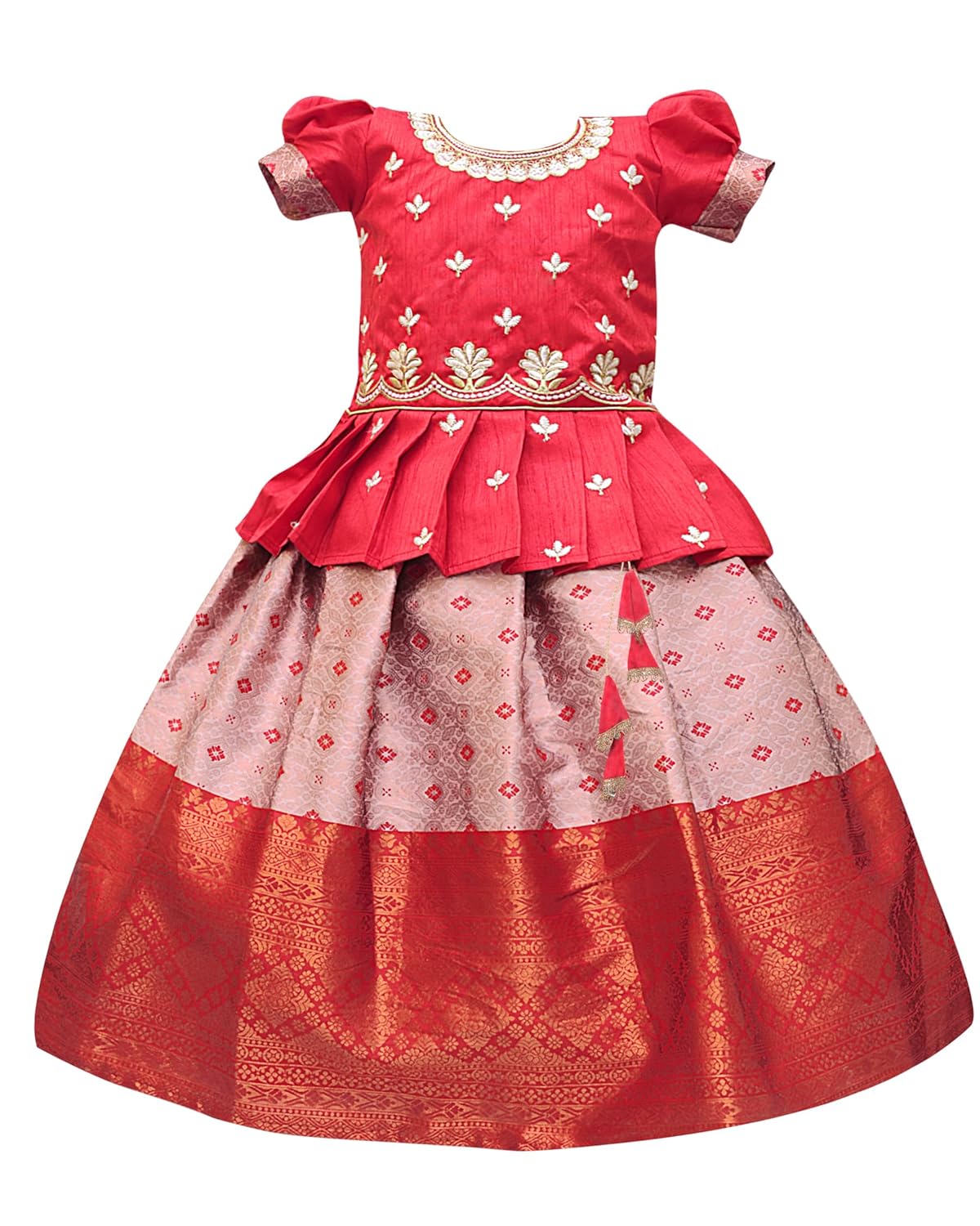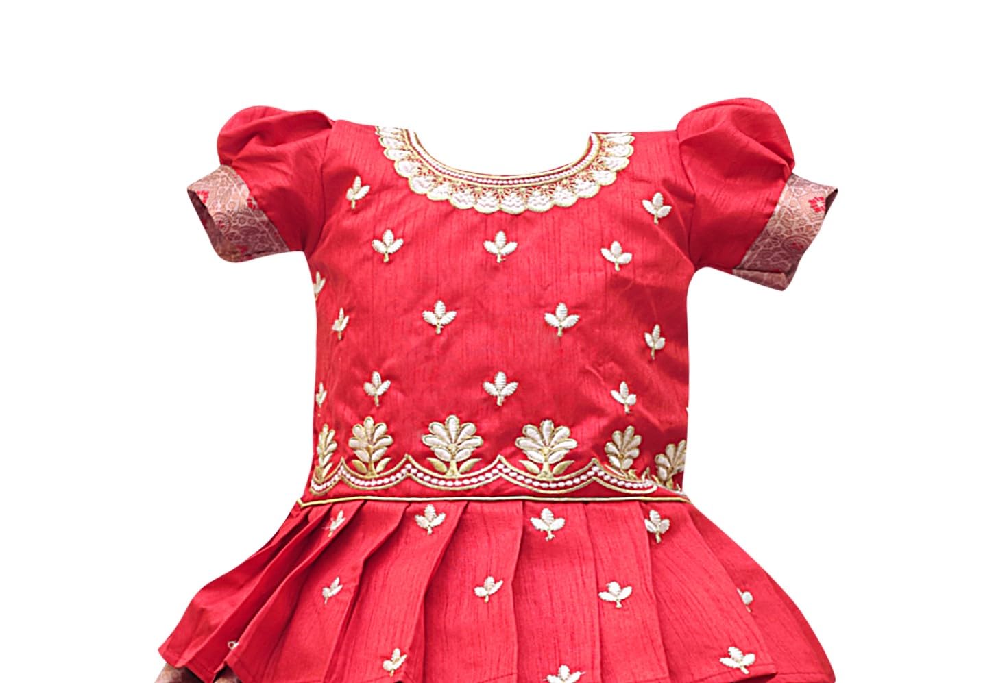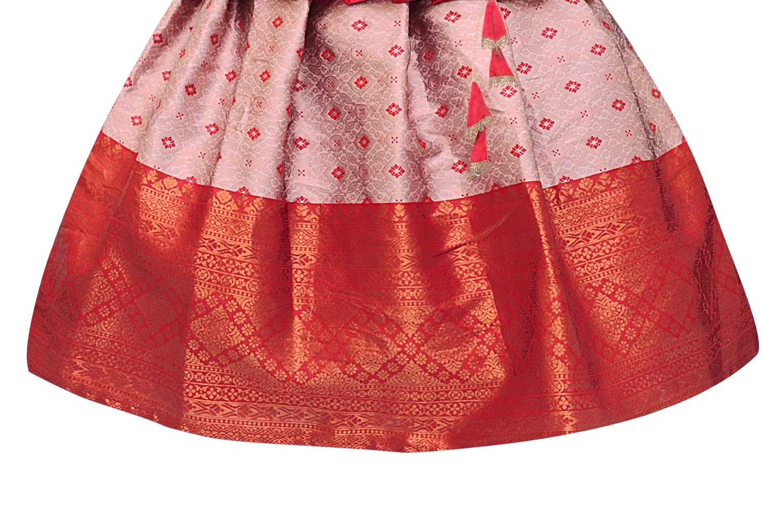 South Indian Traditional Pattu Pavadai Flower Buttas with Broad Annam Border-Made from best quality silk material. The blouse has golden embroidery zari work in the neckline. The skirt is fulfilled with Jacquard design that looks stunning.Stitched with the inner lining for the better Inner fabric-Soft Cotton.Buy this cute pattu pavadai for your little daughters. Back Side Zipper Closures Available.This product can be shipped anywhere in the India.