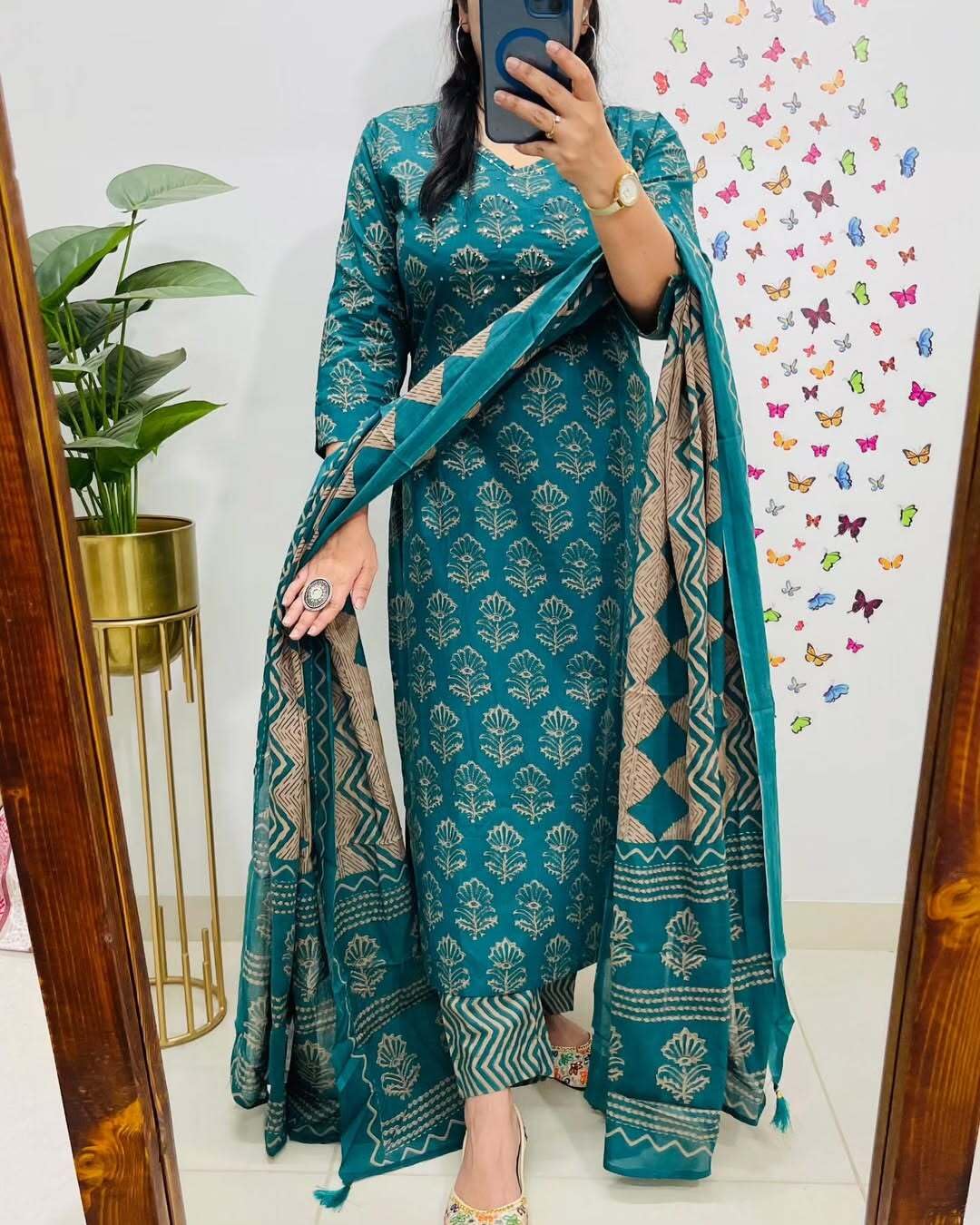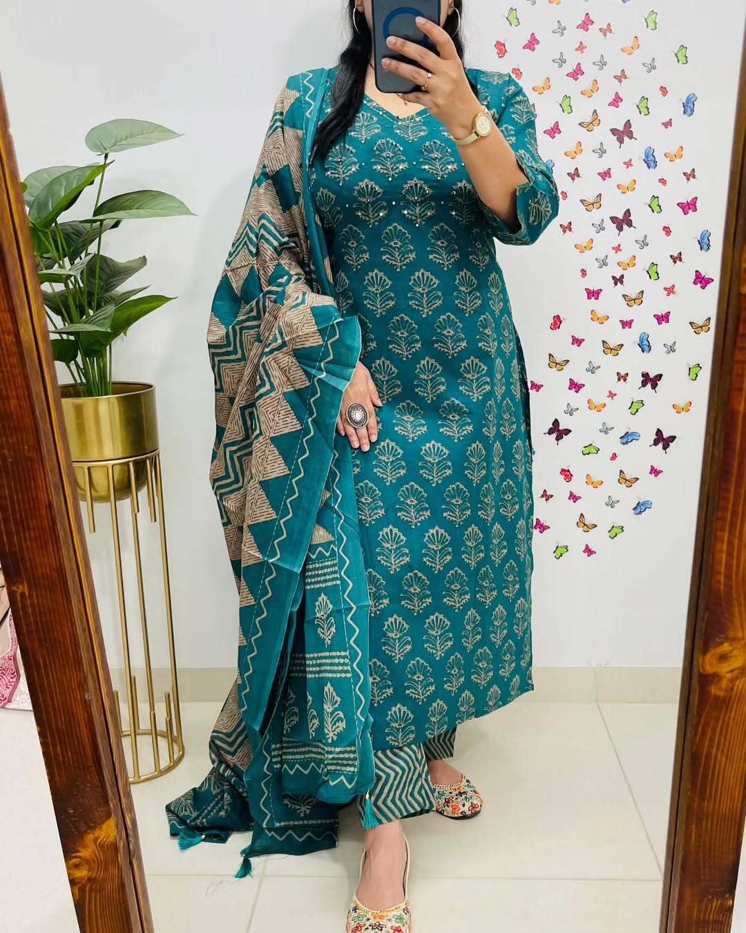 Rangnavi Women’s Cotton Trending Straight Kurta with Pants and Dupatta Set | Ethnic Set (Teal)