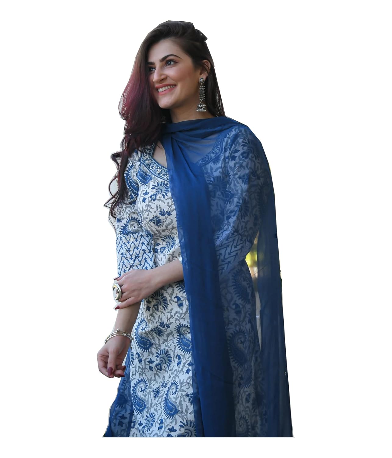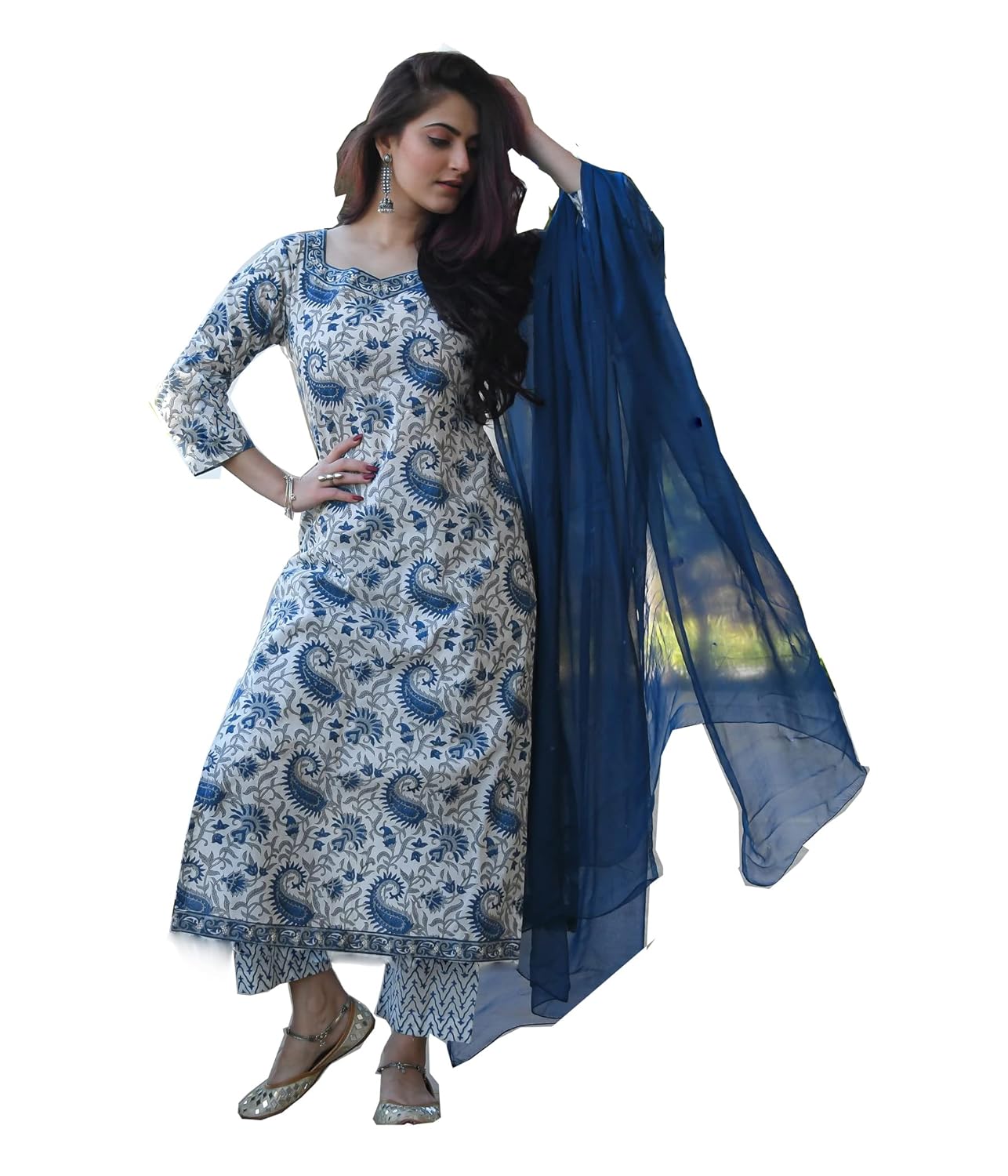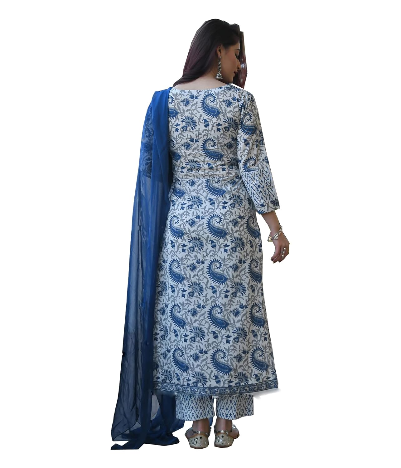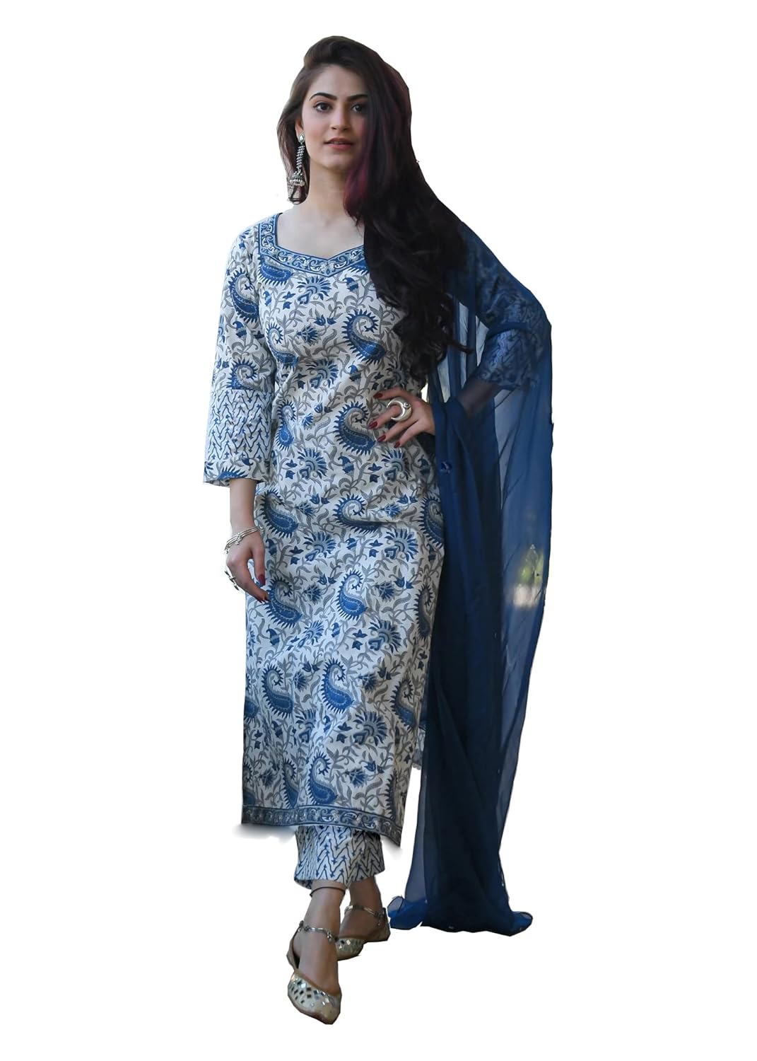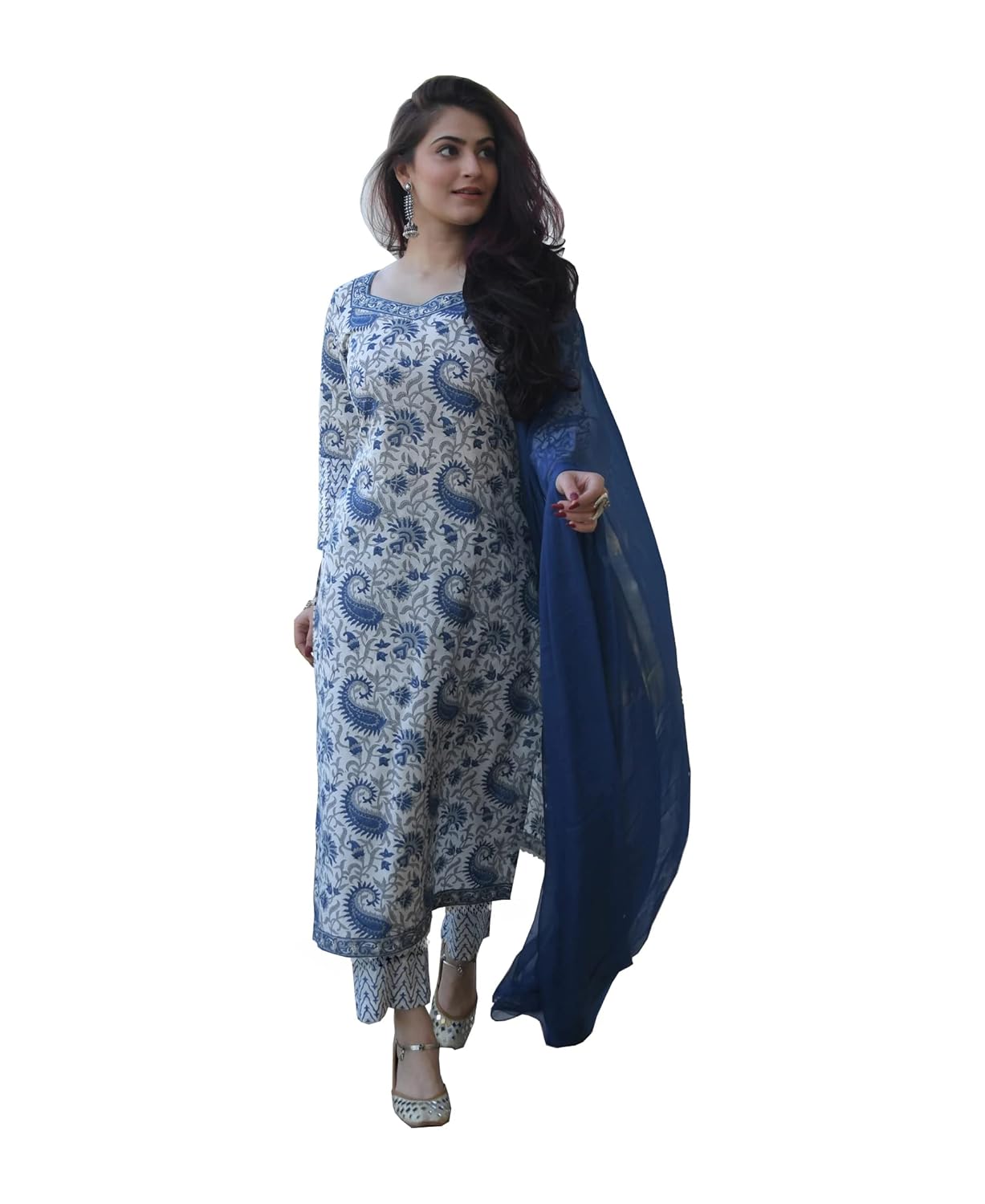 ROYAL EXPORT Women’s White color Cotton Printed Straight Kurti Palazzo Pants Set with Dupatta (Small, white blue)