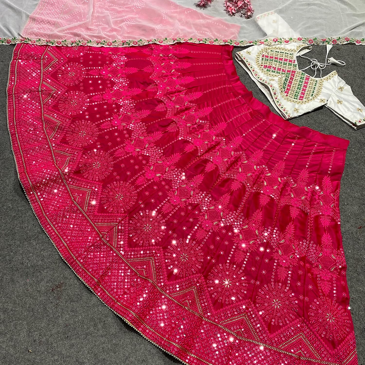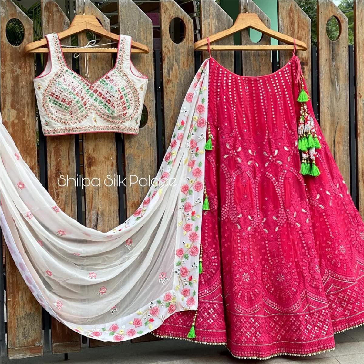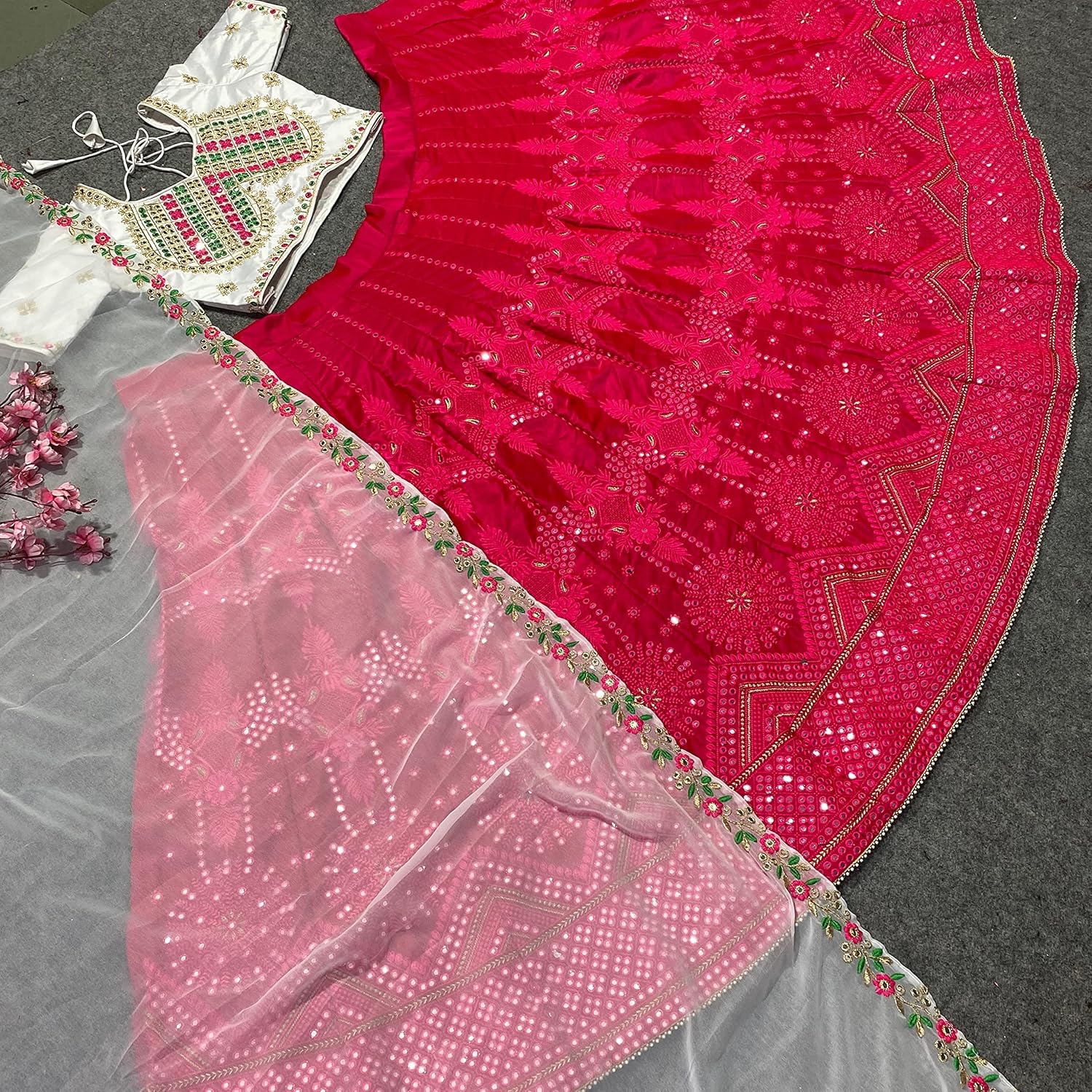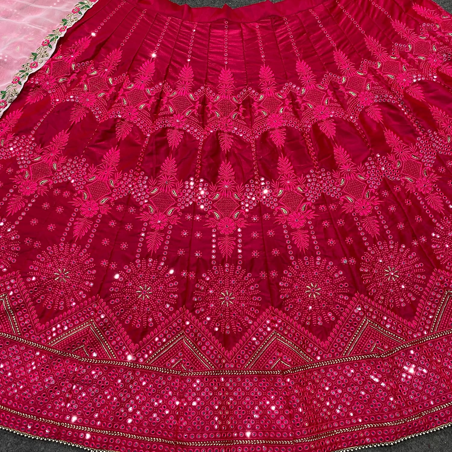 Lehenga choli detail Lehenga Choli Fabric Lehenga Fabric :- Malay Silk Material Choli Fabric:- Malay Silk Material Dupatta Fabric:- NET Lehenga Choli Inner:- Raw Micro Silk Lehenga Choli Work:- Sequence 3mm, Multi Niddle Work, Embroidery Work, Zari Work Lehenga Choli Stitching Type :- Lehenga Semi Stitched , Blouse Unstitched Dupatta Length :- 2.20 mtrs Lehenga Flair:-2.70 Mtrs