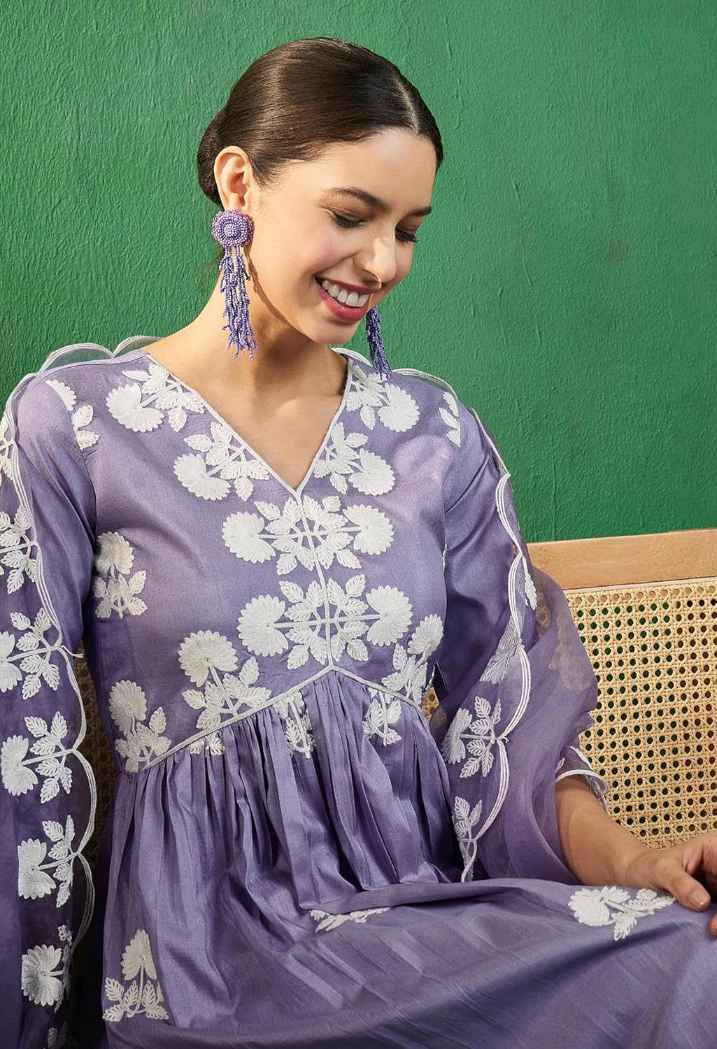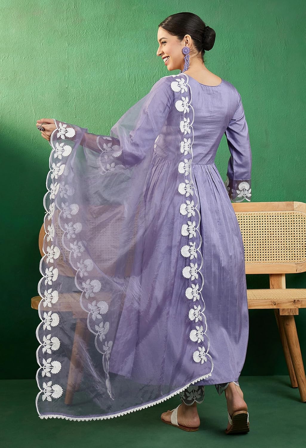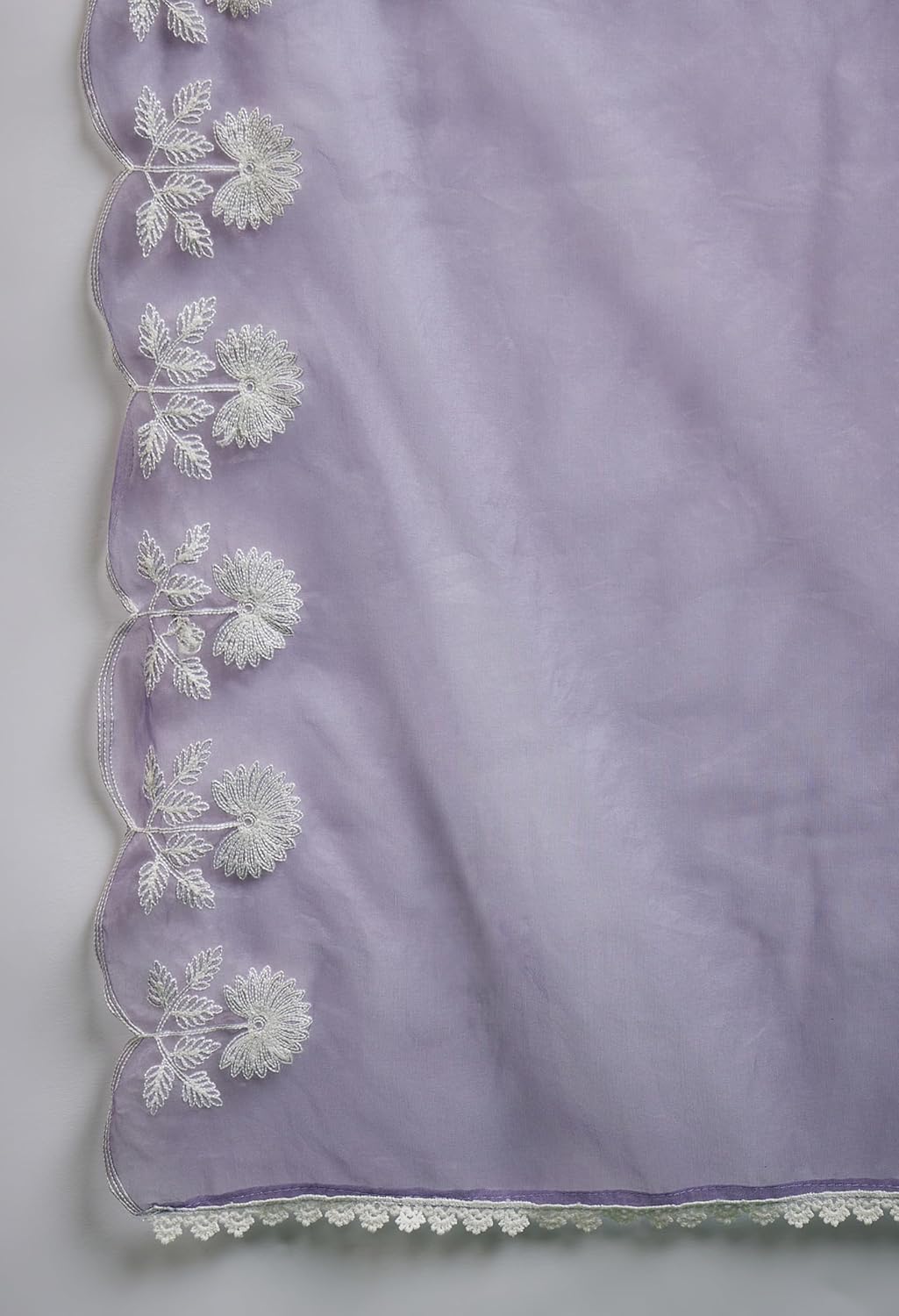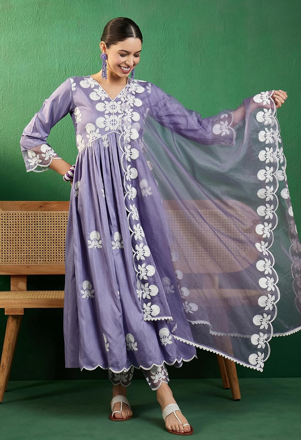 SheWill Embroidered A-Line Kurta With Trouser & Dupatta Kurta Design : Lavender-coloured and white Kurta Embroidered with yoke border details V- neck Three-quarter, regular sleeves A-Line shaped Calf-length with flared hem Machine weave regular silk blend Trousers Design: Lavender-coloured embroidered trousers Partially Elasticated Waistband Slip-on closure Dupatta Design: Lavender-coloured Dupatta Embroidered Taping border Material: Kurta – Silk Blend || Trouser – Silk Blend || Dupatta – Organza || Lining – Crepe