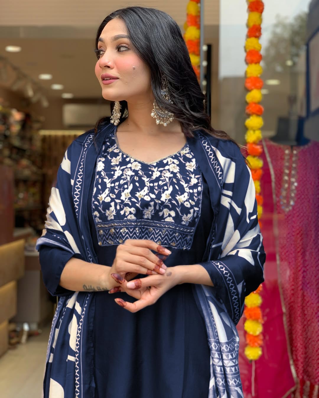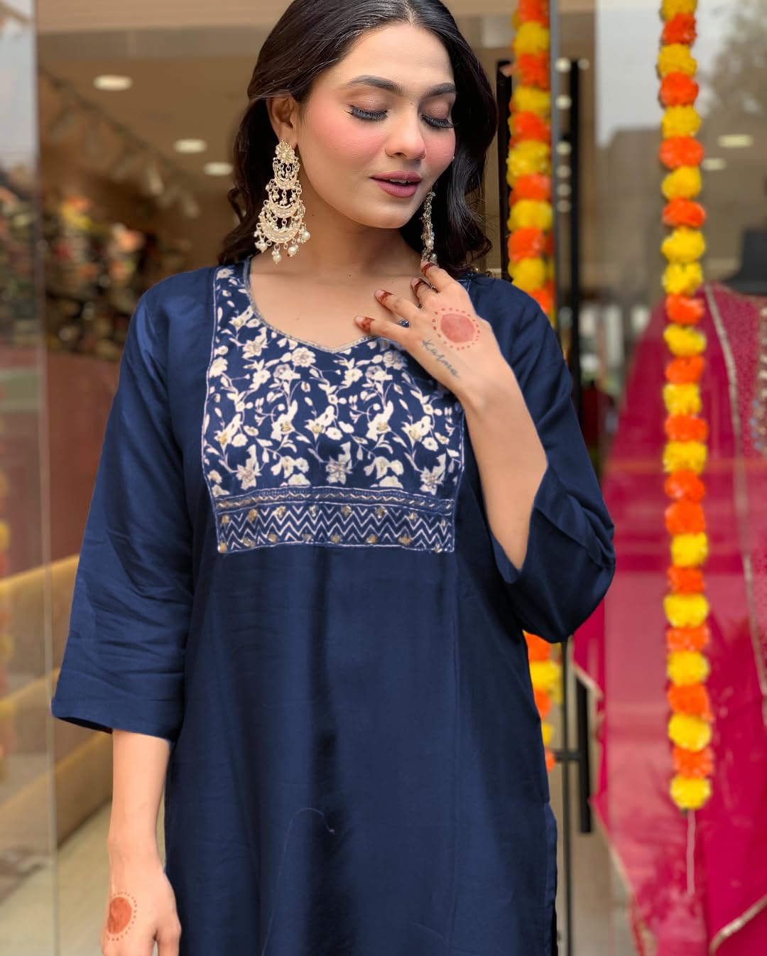 Upgrade your ethnic style with this elegant kurta set for women from Shienzy. This beautifully crafted kurti with pant and dupatta is perfect for women who want a blend of tradition and comfort. Designed with a detailed yoke and paired with a floral printed dupatta, this three-piece suit set is ideal for all occasions – whether it’s a wedding function, festive celebration, or office party. Made from premium fabric, this straight kurta set offers a perfect fit and breathable feel, ensuring all-day comfort. The ethnic wear gives a graceful and classy appeal. Complete your look with heels and statement earrings for a stunning Indian outfit that stands out.