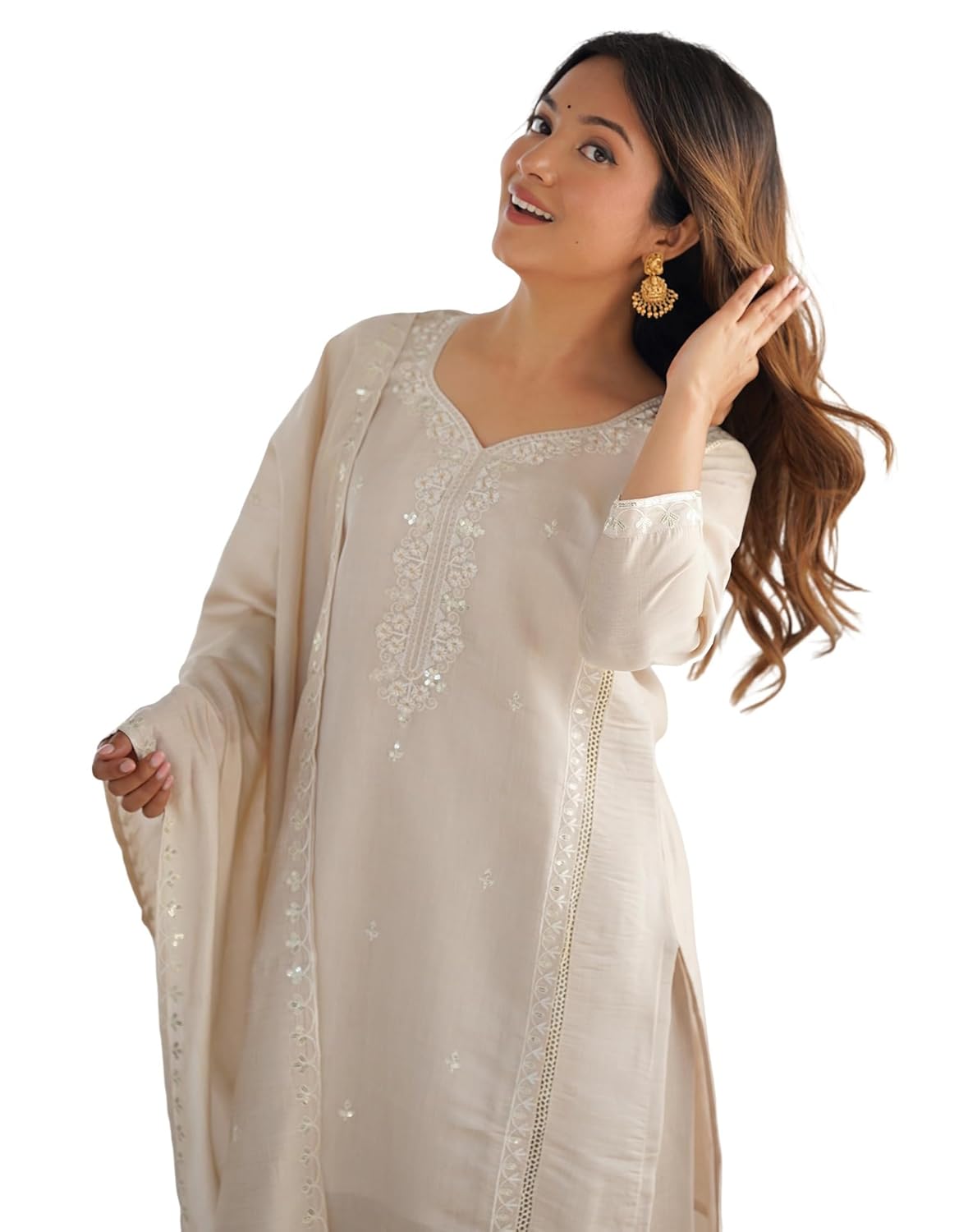 SKYLEE Women’s Silk Embroidery and Lace Straight Kurta with Pant & Dupatta