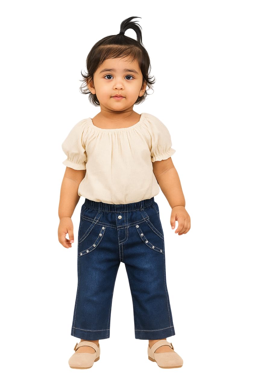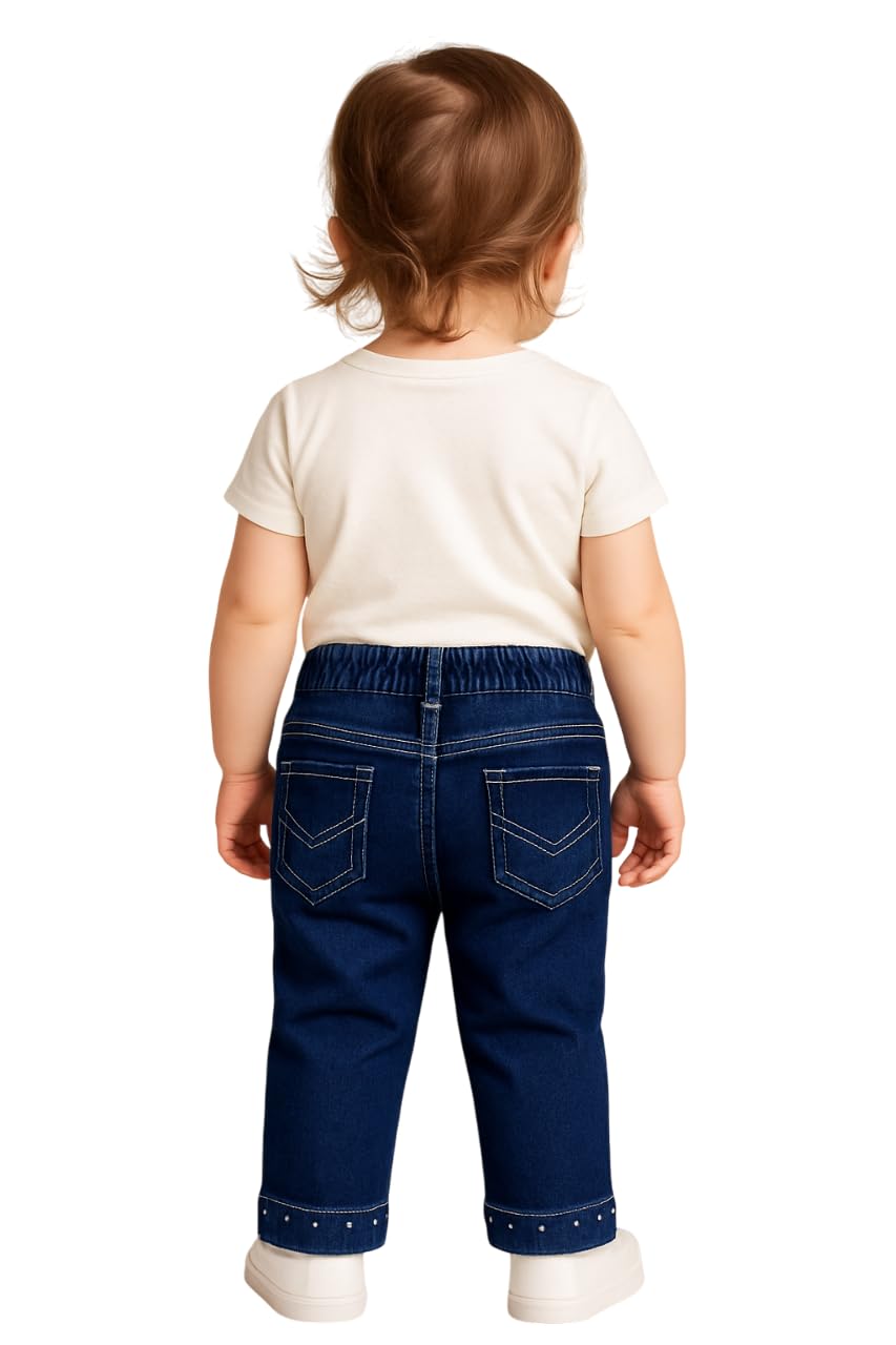 Dress your little one in style with these charming toddler denim jeans featuring delightful orange floral embroidery. The dark blue denim provides a perfect canvas for the intricate floral designs, while the elastic waistband ensures easy dressing and all-day comfort for active little ones. These jeans showcase thoughtful details including decorative studs and practical pocket placement. The relaxed fit allows unrestricted movement during playtime, while the sturdy denim construction stands up to daily adventures. The orange embroidered patterns add a whimsical touch that coordinates beautifully with various tops. The elastic waist eliminates the need for complicated buttons or zips, making these jeans practical for both parents and children. Perfect for everyday wear, special occasions, or playgroup activities, these jeans combine fashion with functionality in a way that suits growing toddlers.