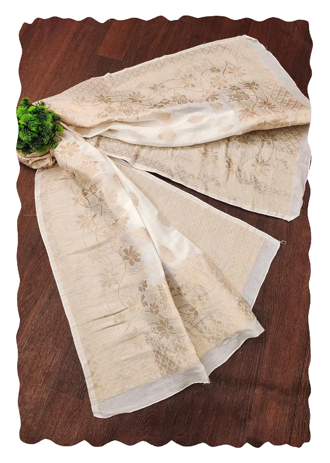 Very nice Banarasi brocade dupatta in white & golden – however, edges are not turned under & properly hem-stitched but instead have been sewn in a selvedge stitch (this is not a finishing stitch, is used only to prevent cut edges from fraying as you are sewing your garment), and so you need to turn over & hem-stitch yourself to finish the dupatta, or since you are already sewing, you can add a lace border – I bought some beautiful moti pearl lace here on Amazon & stitched it on, now the dupatta looks both properly finished and quite elegant