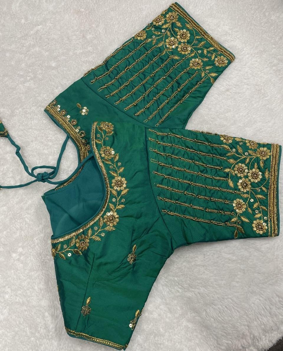 This blouse is a stunning blend of traditional elegance and intricate craftsmanship. The maggam and moti work is rich and detailed, instantly giving any saree or lehenga a festive upgrade. It fits well, feels comfortable, and saves so much tailoring hassle ready to wear and ready to shine