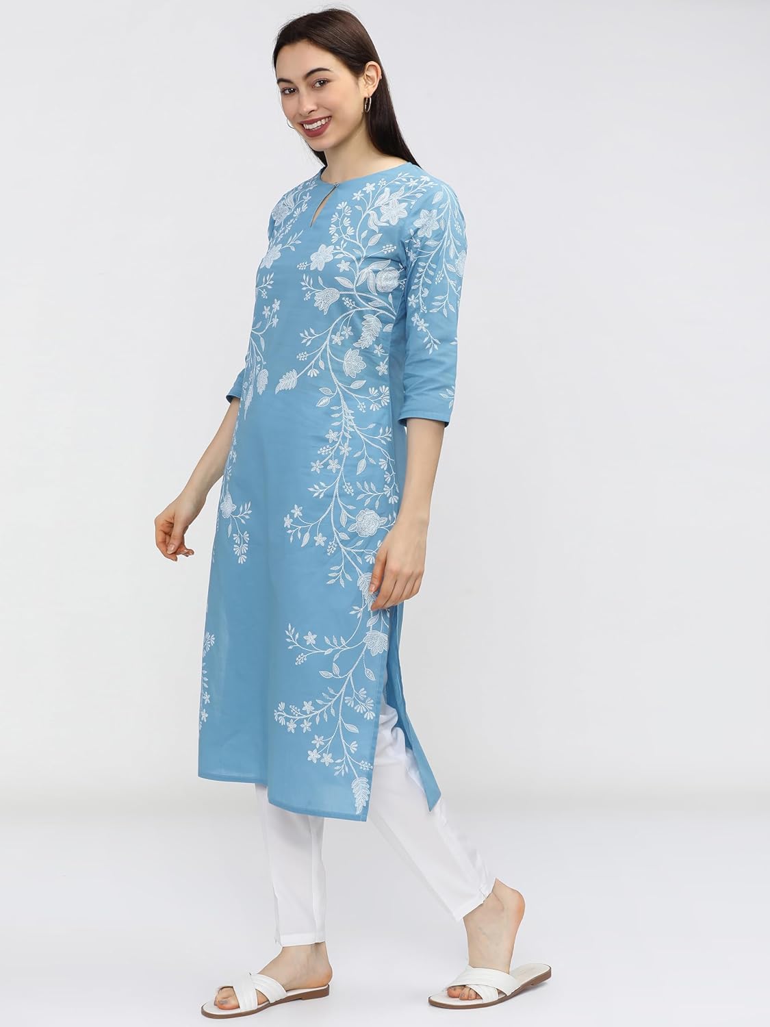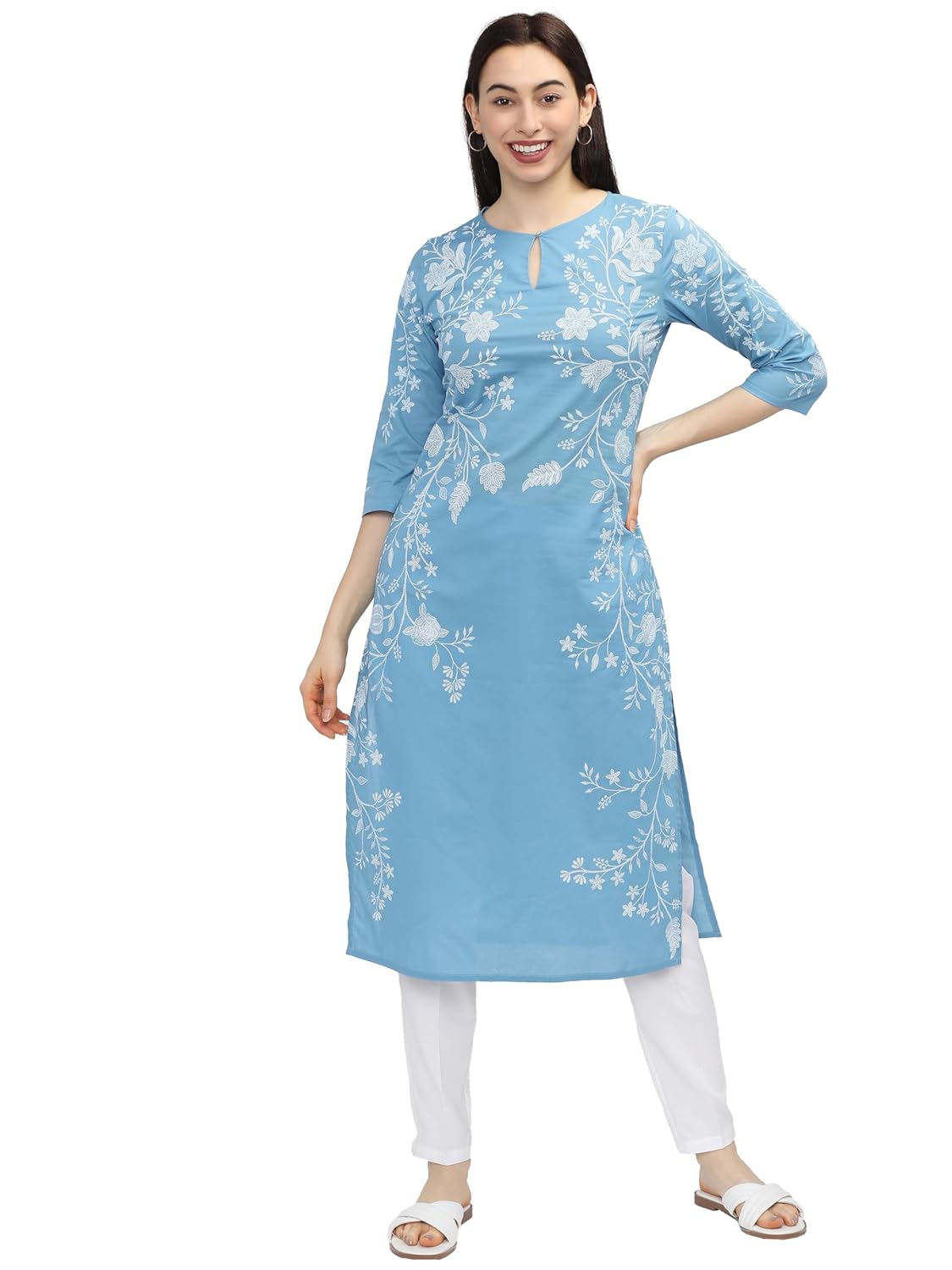 Vishudh Women Blue Floral Printed Keyhole Neck Kurta Vishudh