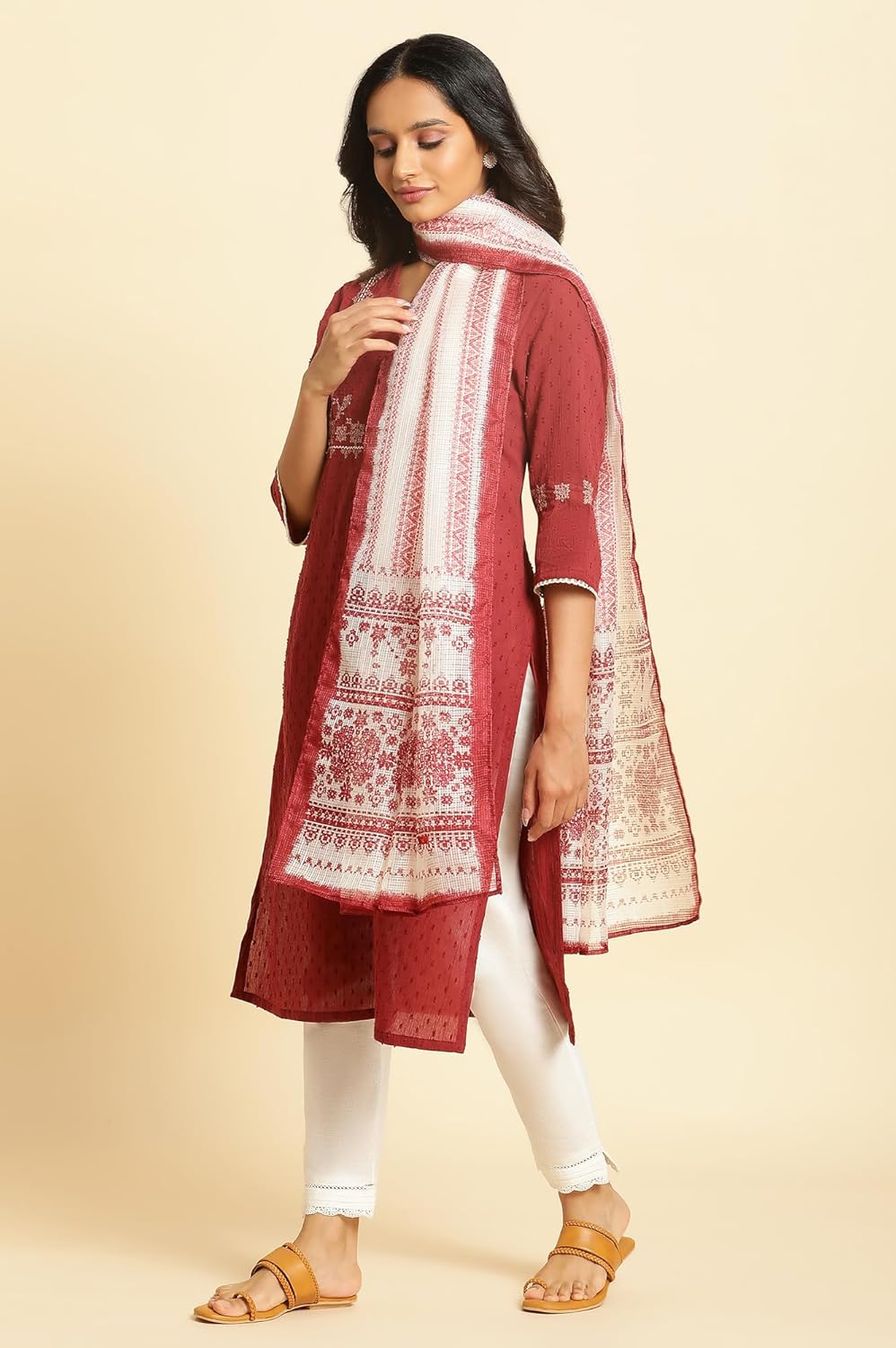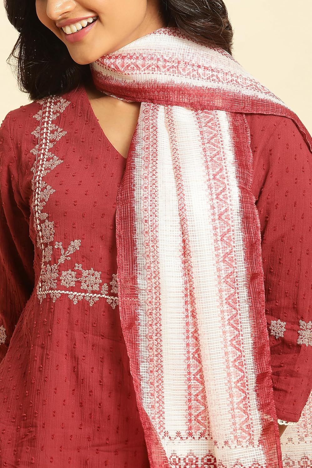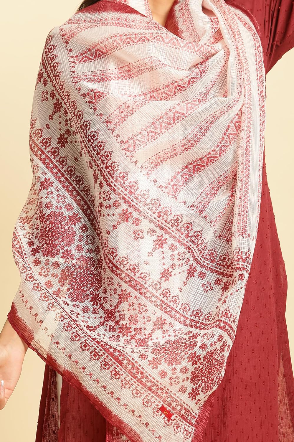 Printed Kota doria women dupatta featuring beautiful geometric print in ecru and maroon colour.