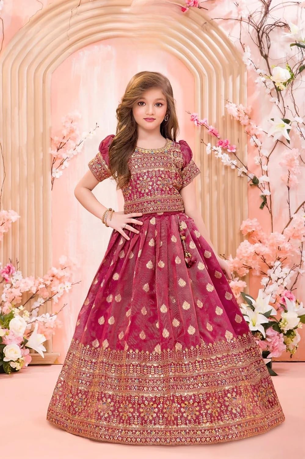This Rani Banarasi-inspired lehenga choli set brings royal charm with its intricate zari and brocade-style detailing. Designed with puff sleeves and a heavily embroidered blouse, it features traditional motifs all over the skirt, making it perfect for weddings, festive occasions, and grand celebrations. The outfit pairs timeless heritage with a modern silhouette for your little princess.